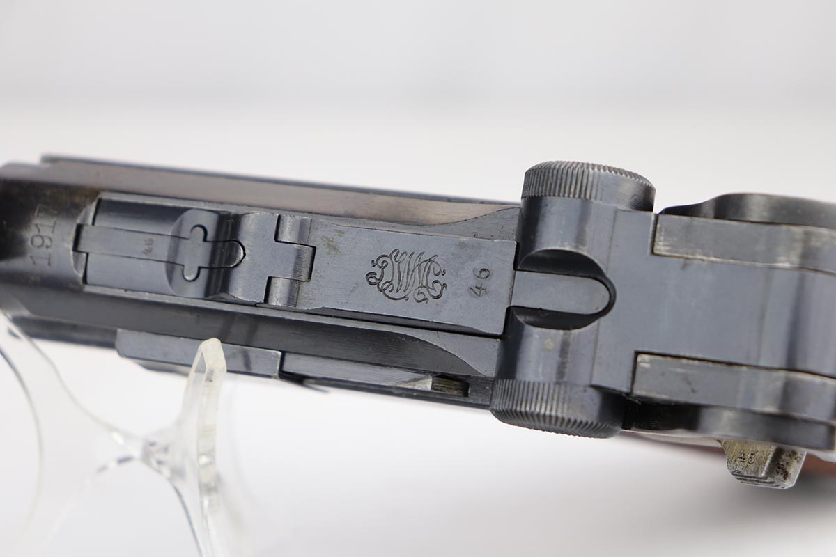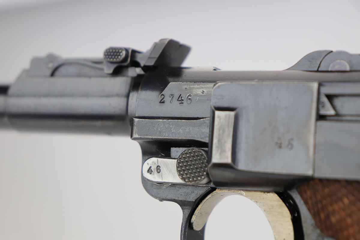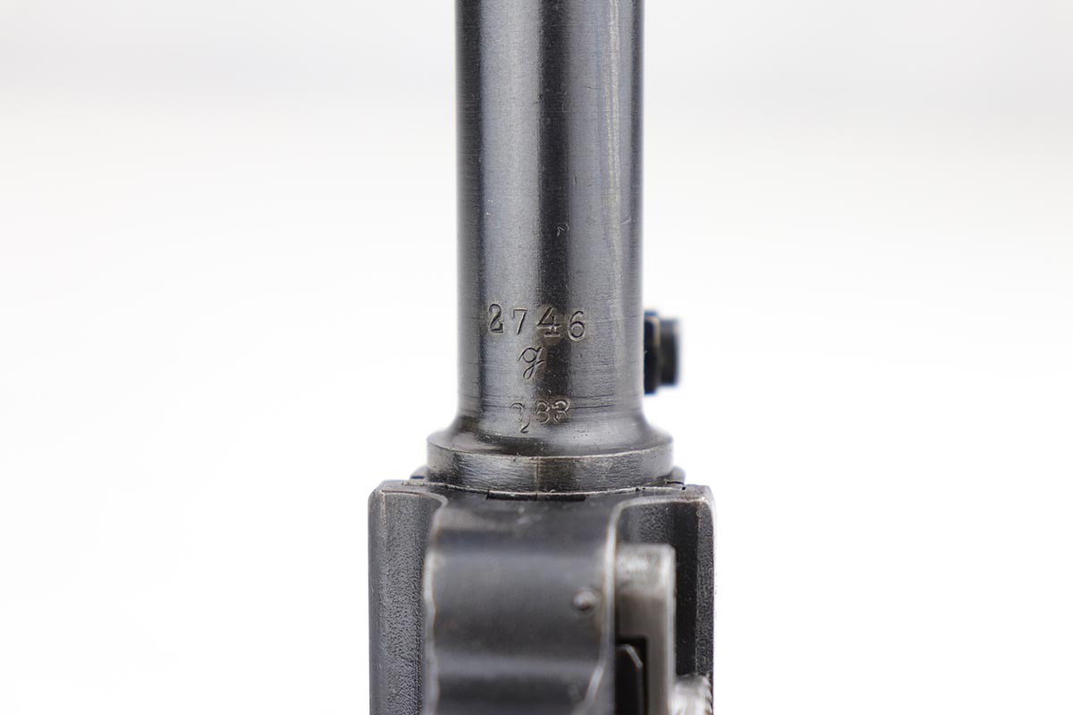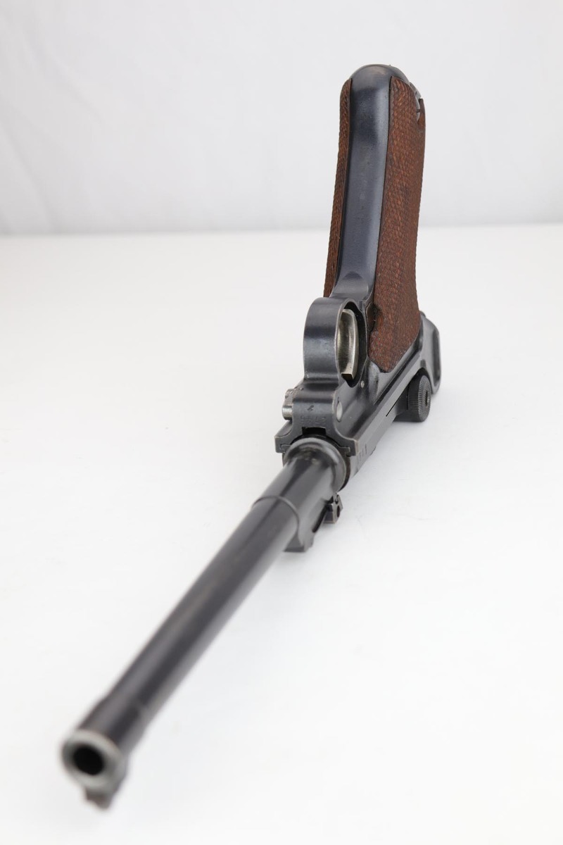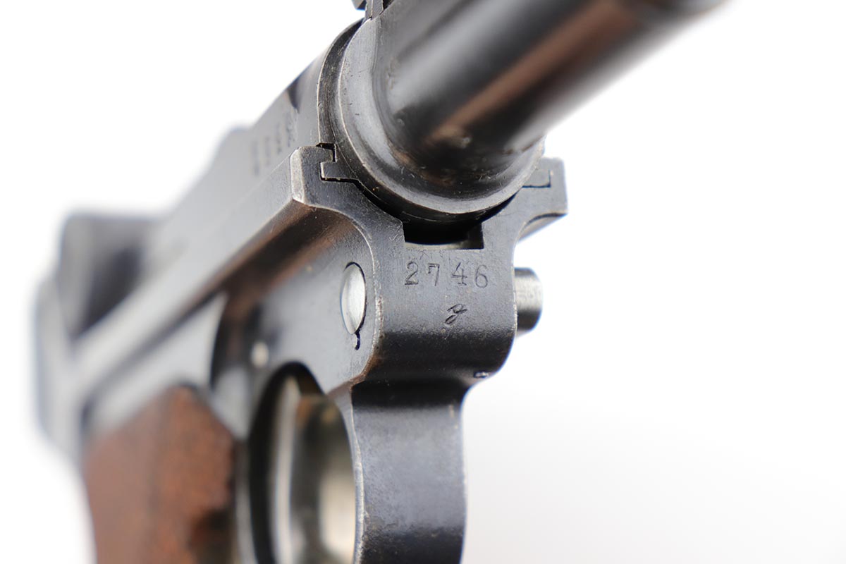 12/17/19 – This is a beautiful DWM Artillery Luger that was manufactured in 1917. It’s all matching and original, including the grips but not the magazine. Magazine is correct and original, just numbered to another gun. The pistol shows minimal actual bluing loss, with minor thinning on the muzzle, sideplate and barrel. There is also minor patina in a few areas. Small parts retain about 70% of the original straw, with the takedown lever showing most of the wear. Terrific bore and grips.