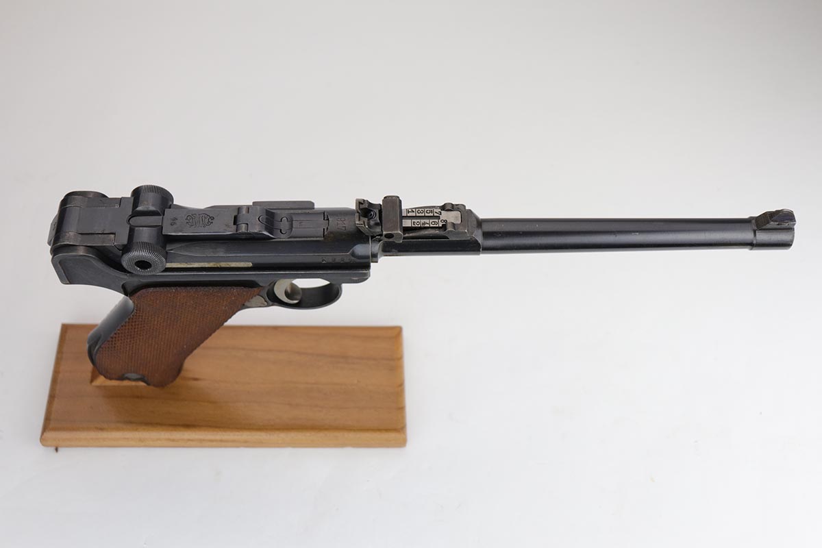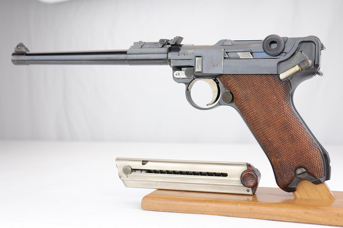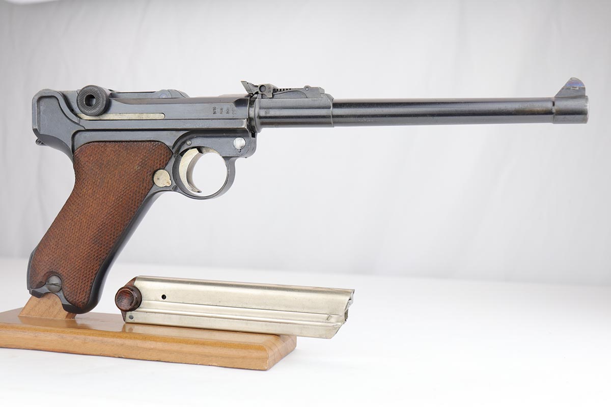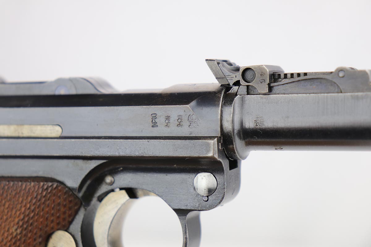 12/17/19 – This is a beautiful DWM Artillery Luger that was manufactured in 1917. It’s all matching and original, including the grips but not the magazine. Magazine is correct and original, just numbered to another gun. The pistol shows minimal actual bluing loss, with minor thinning on the muzzle, sideplate and barrel. There is also minor patina in a few areas. Small parts retain about 70% of the original straw, with the takedown lever showing most of the wear. Terrific bore and grips.