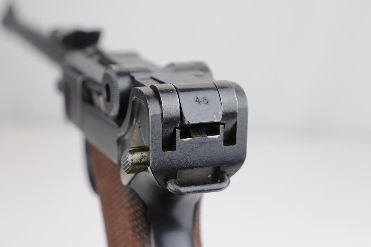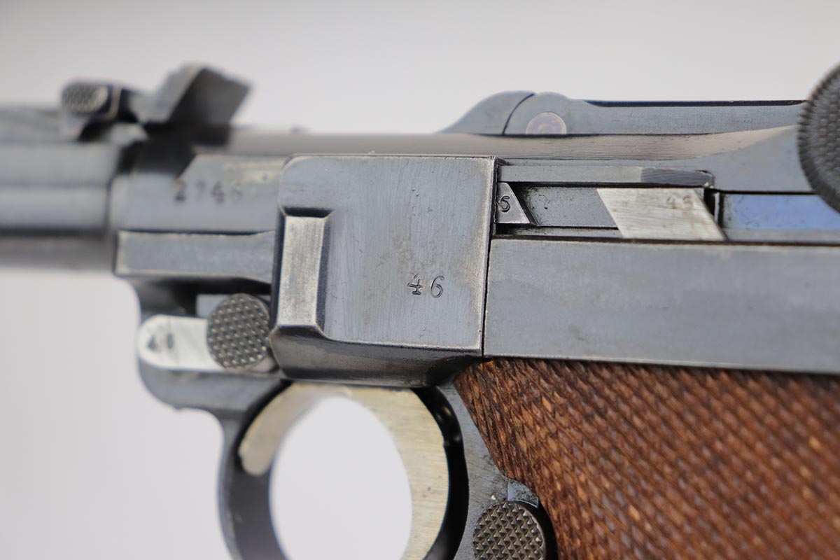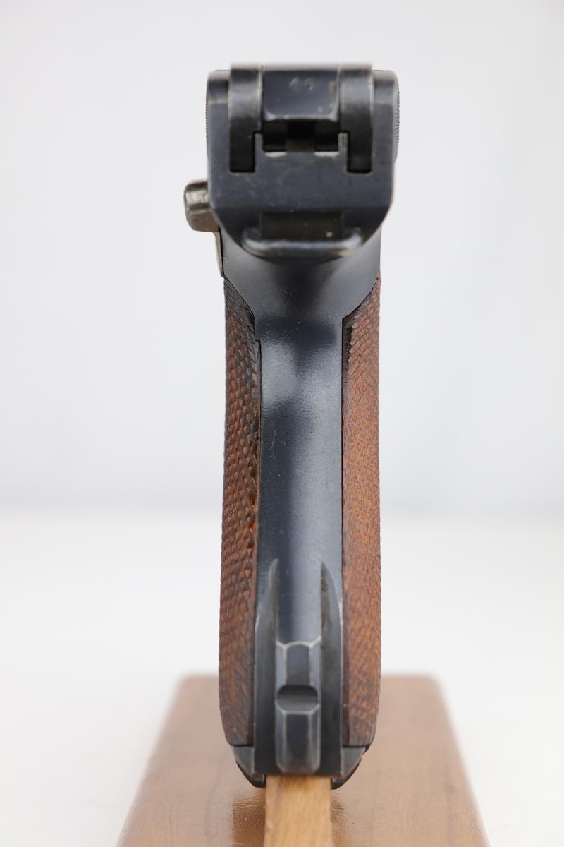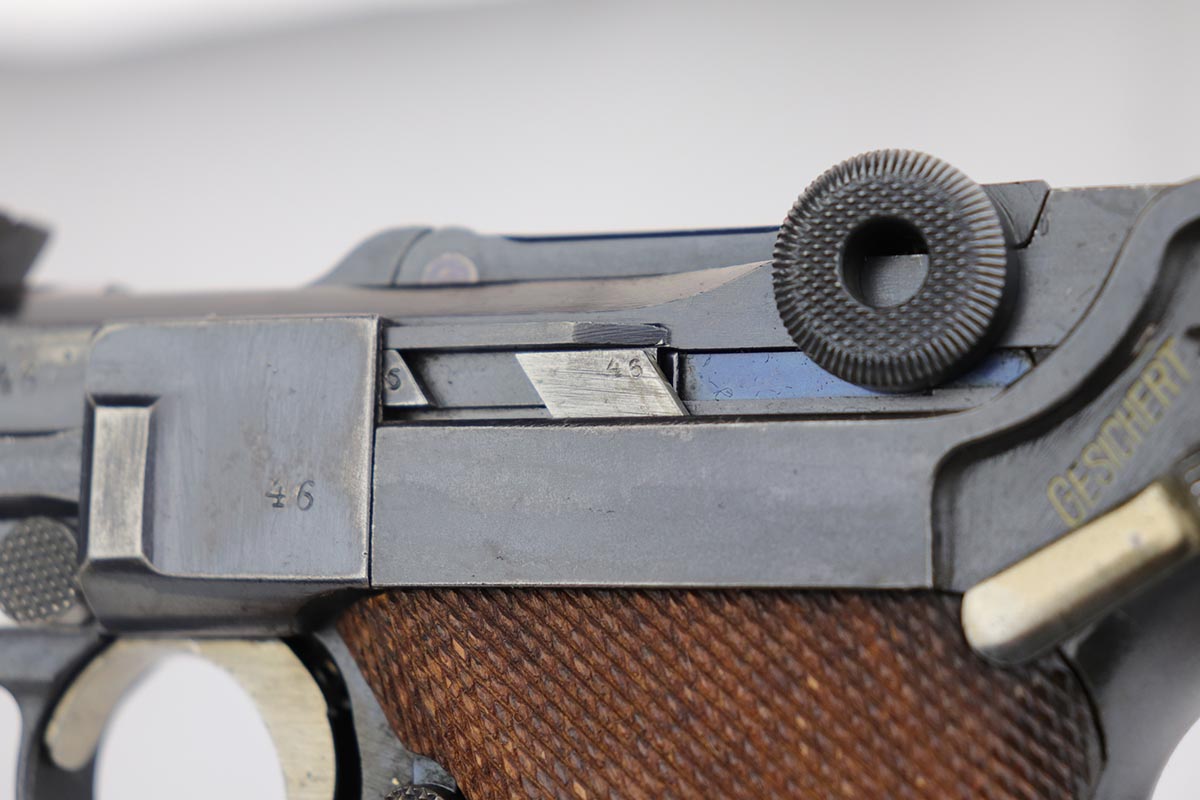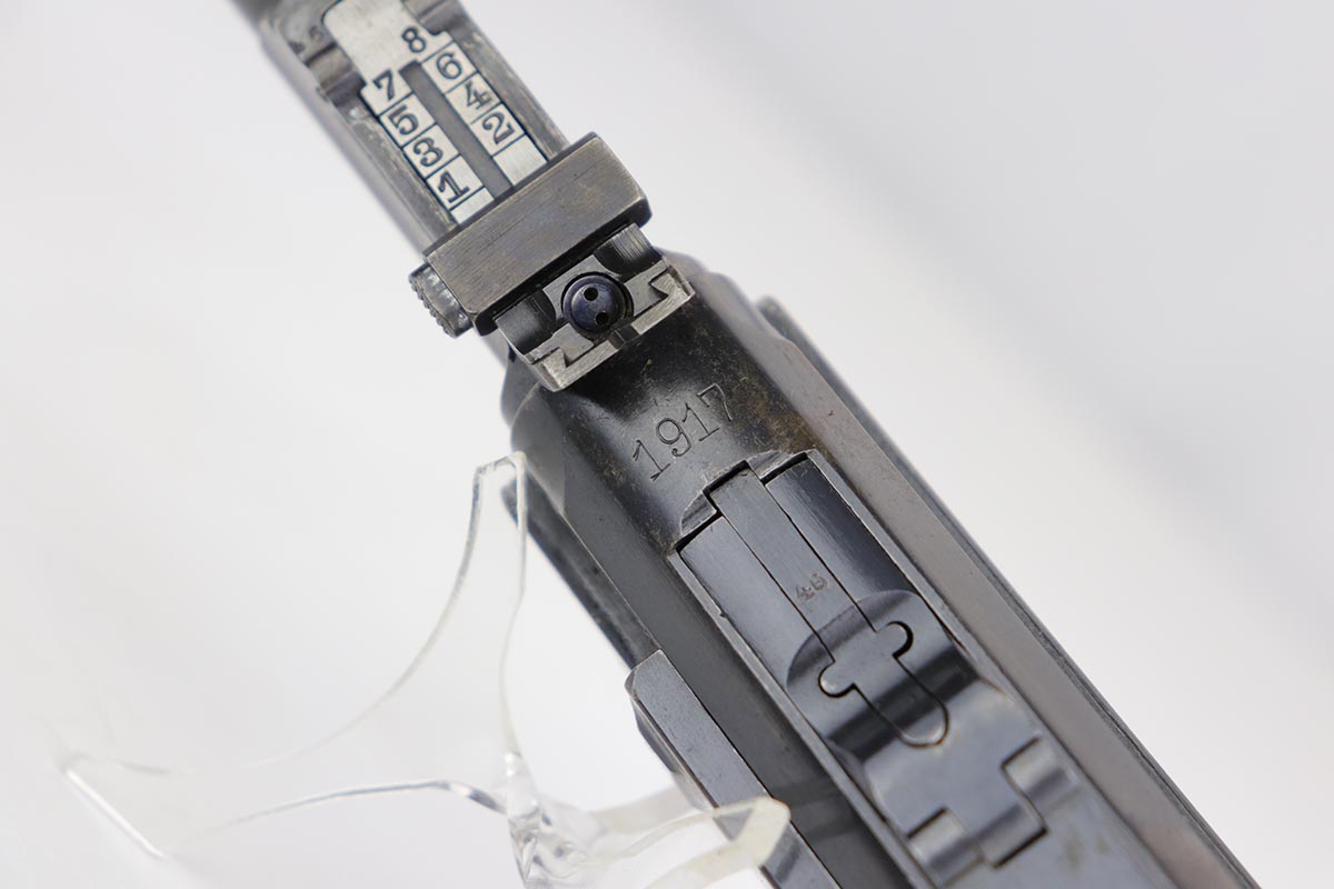 12/17/19 – This is a beautiful DWM Artillery Luger that was manufactured in 1917. It’s all matching and original, including the grips but not the magazine. Magazine is correct and original, just numbered to another gun. The pistol shows minimal actual bluing loss, with minor thinning on the muzzle, sideplate and barrel. There is also minor patina in a few areas. Small parts retain about 70% of the original straw, with the takedown lever showing most of the wear. Terrific bore and grips.