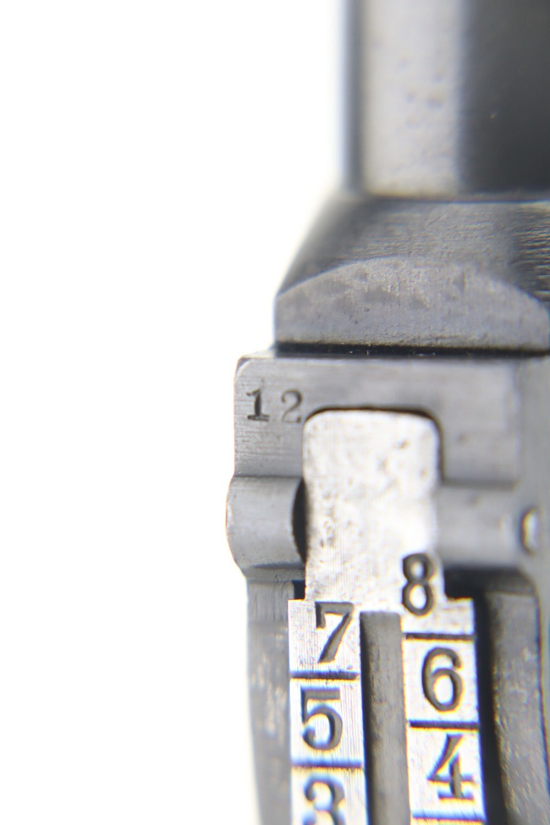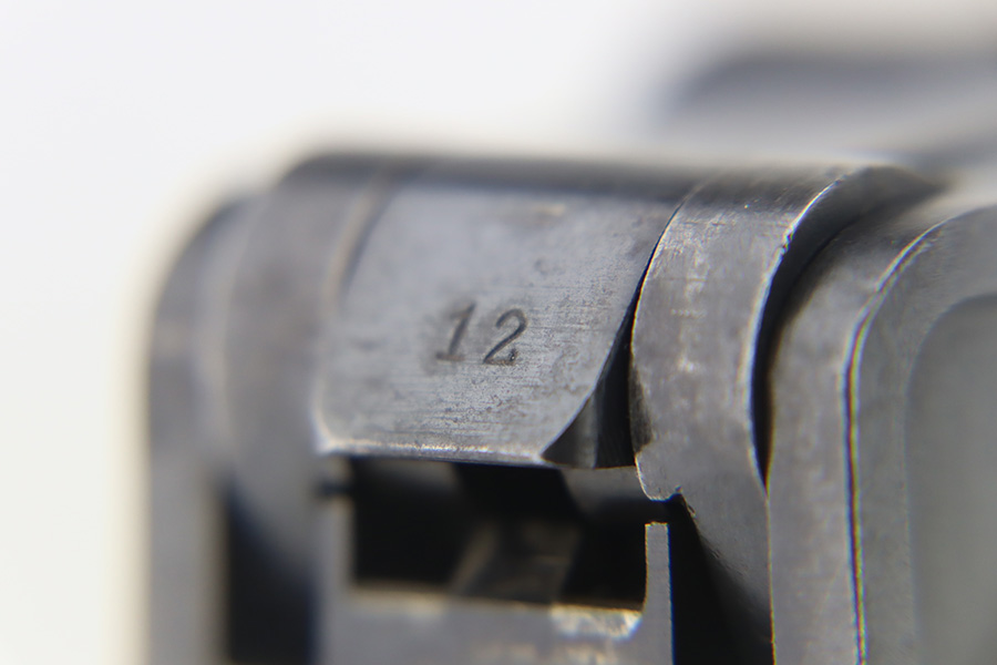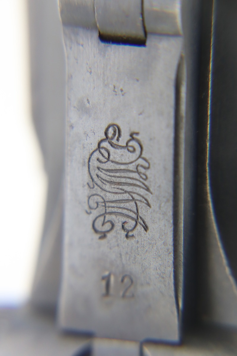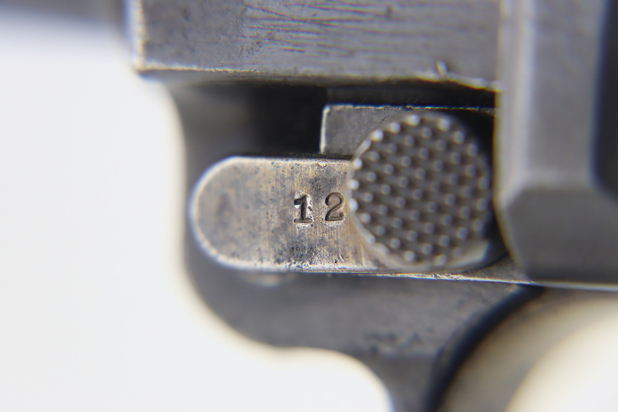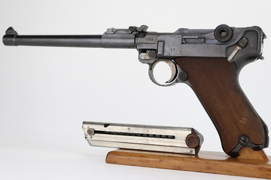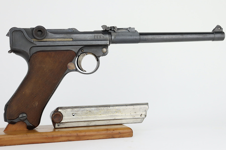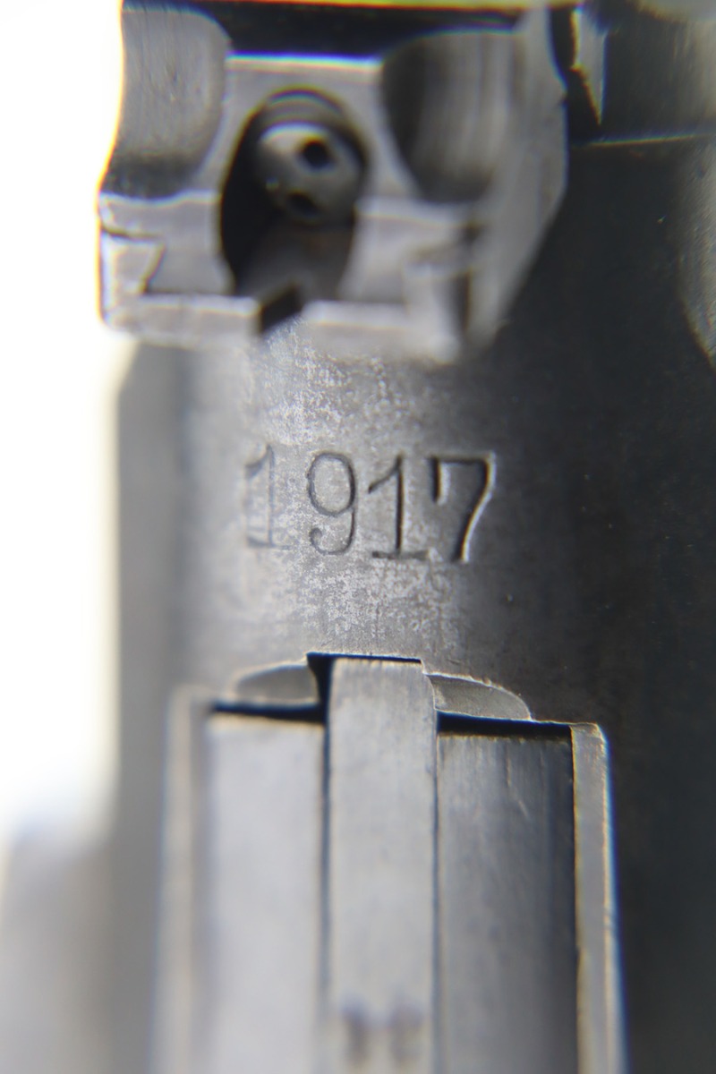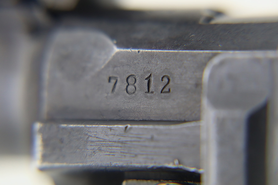 1/18/24 – This is an excellent DWM Artillery Luger issued to the Imperial German military in 1917. It is all matching with the proper Imperial proofs. The finish rates about 97%. While there is very little actual finish loss, there are some small spots of light pin-pricking here and there, most noticeable on the barrel. There are also what look like some teeth mark from a tool on the barrel. Fitted with un-numbered wood grips and comes with a mismatched but period-correct magazine. The bore has good rifling with some light pin-pricking here and there.
