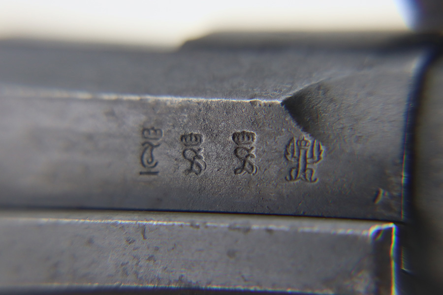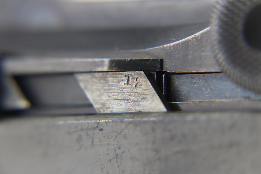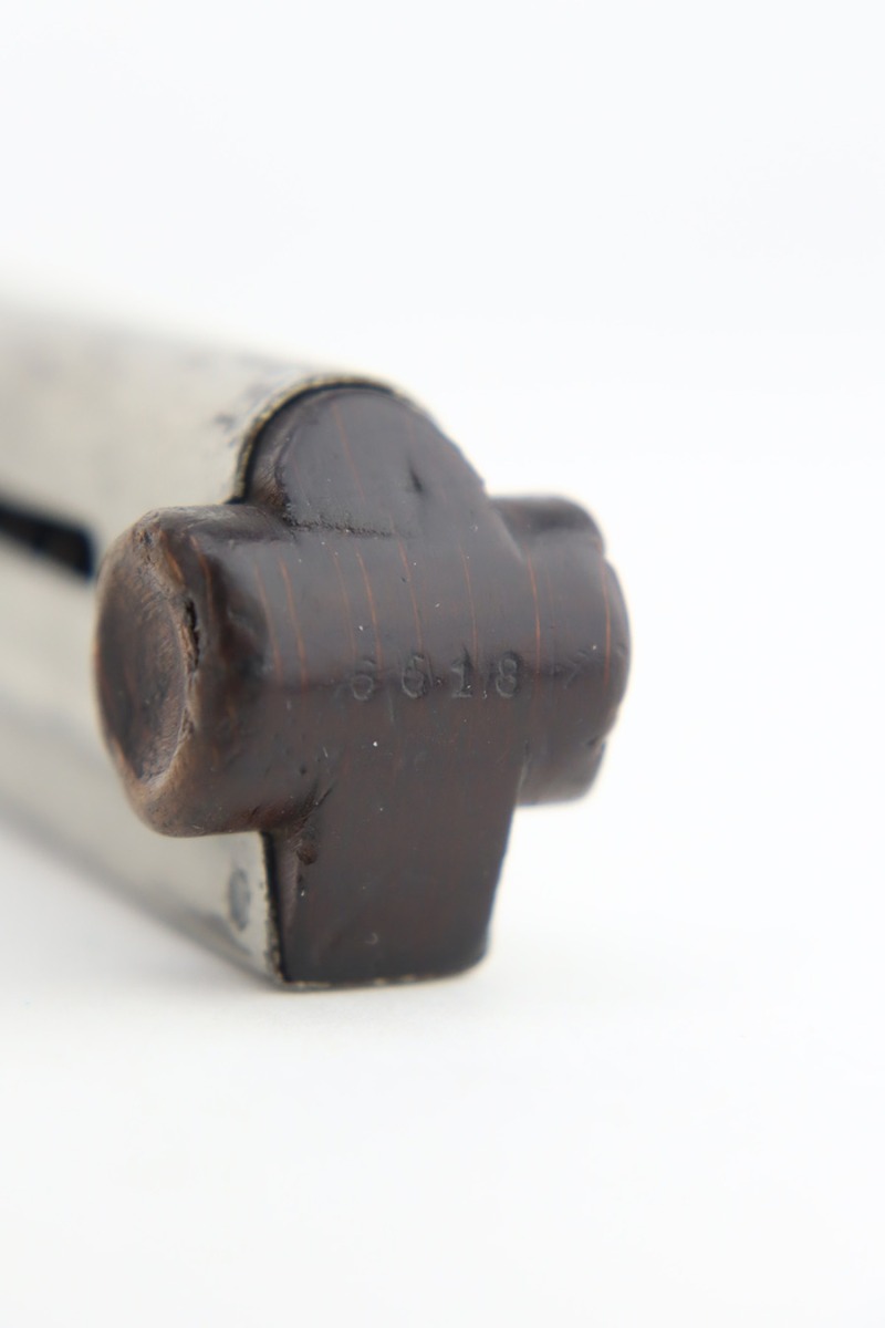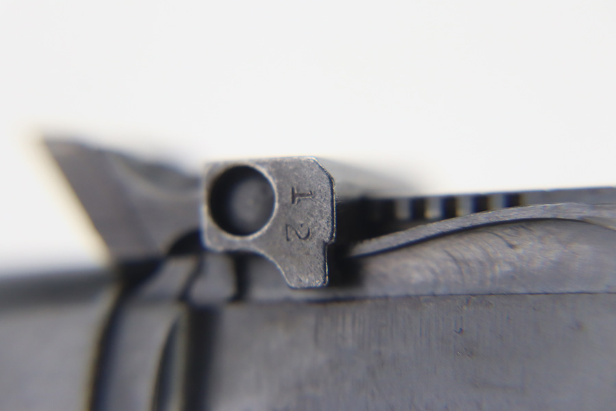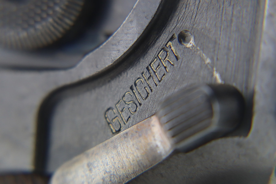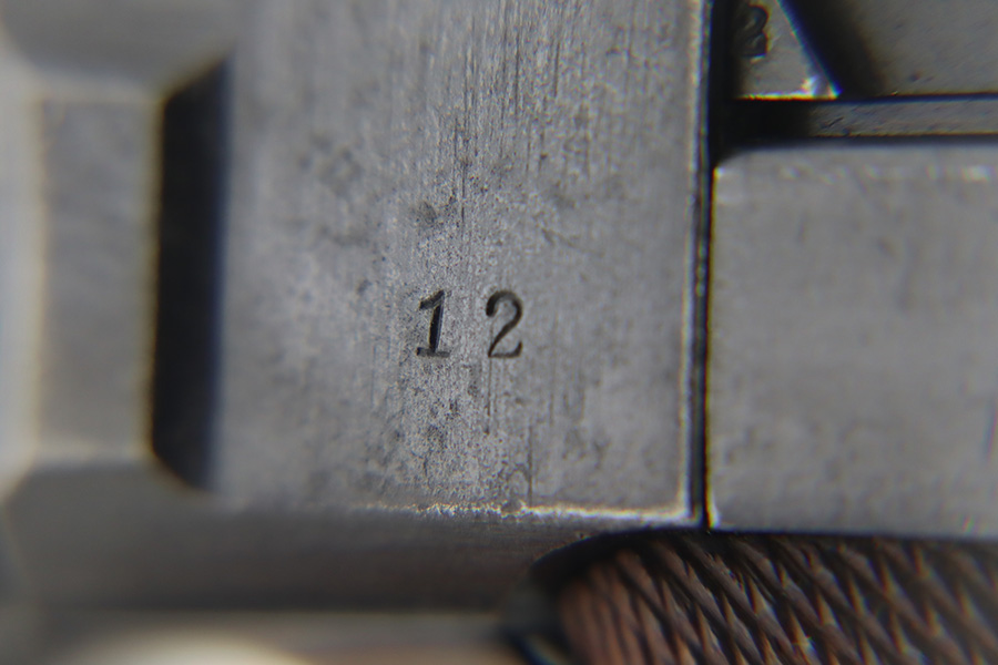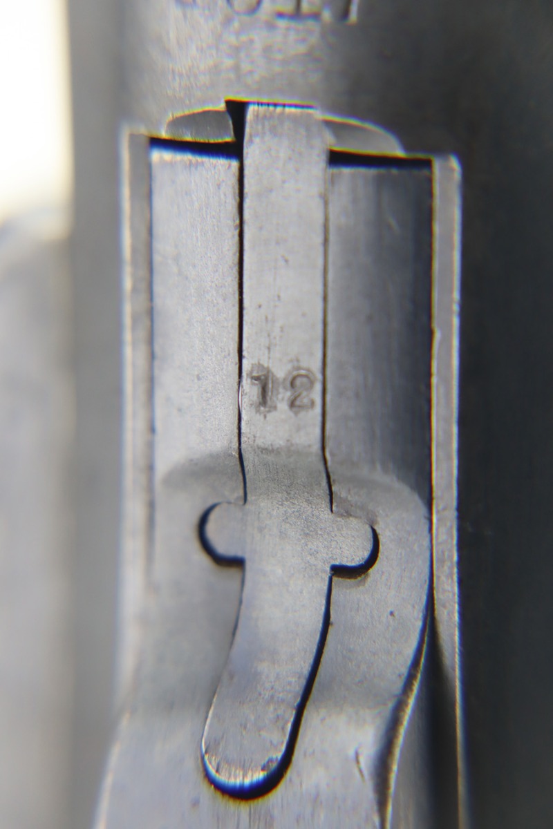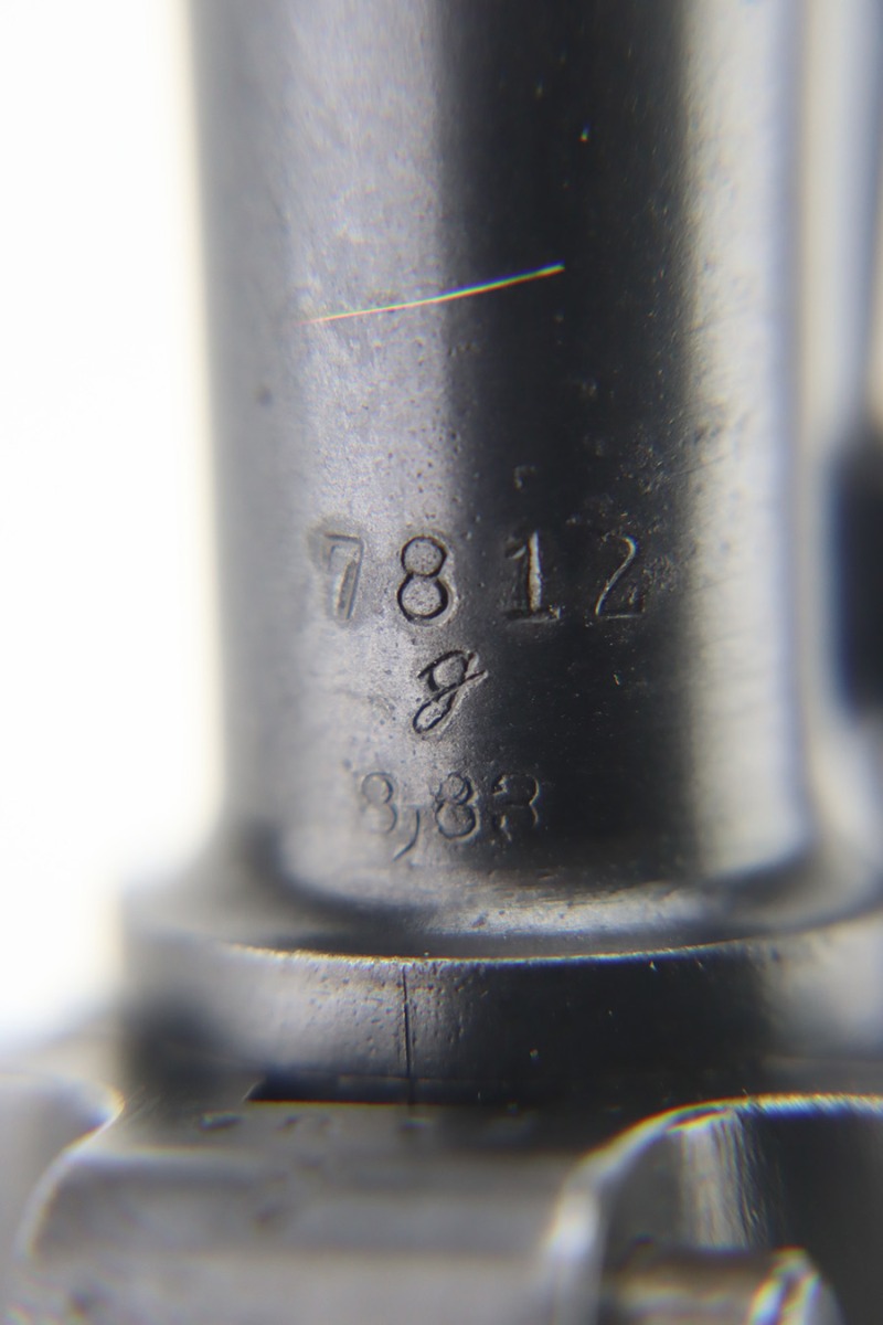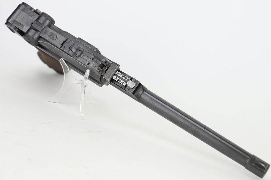 1/18/24 – This is an excellent DWM Artillery Luger issued to the Imperial German military in 1917. It is all matching with the proper Imperial proofs. The finish rates about 97%. While there is very little actual finish loss, there are some small spots of light pin-pricking here and there, most noticeable on the barrel. There are also what look like some teeth mark from a tool on the barrel. Fitted with un-numbered wood grips and comes with a mismatched but period-correct magazine. The bore has good rifling with some light pin-pricking here and there.