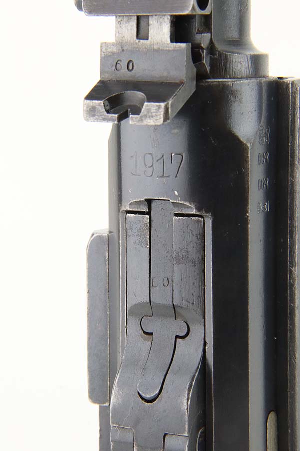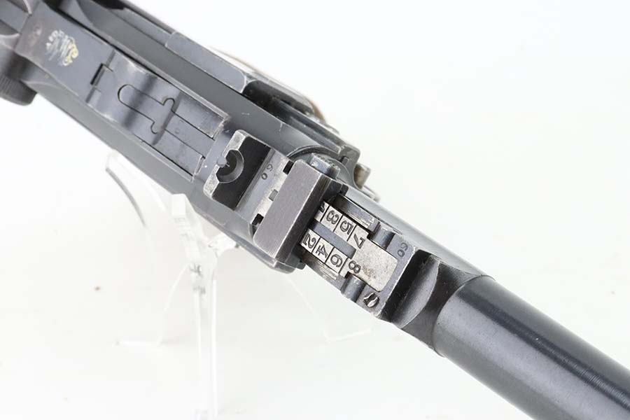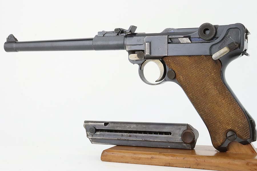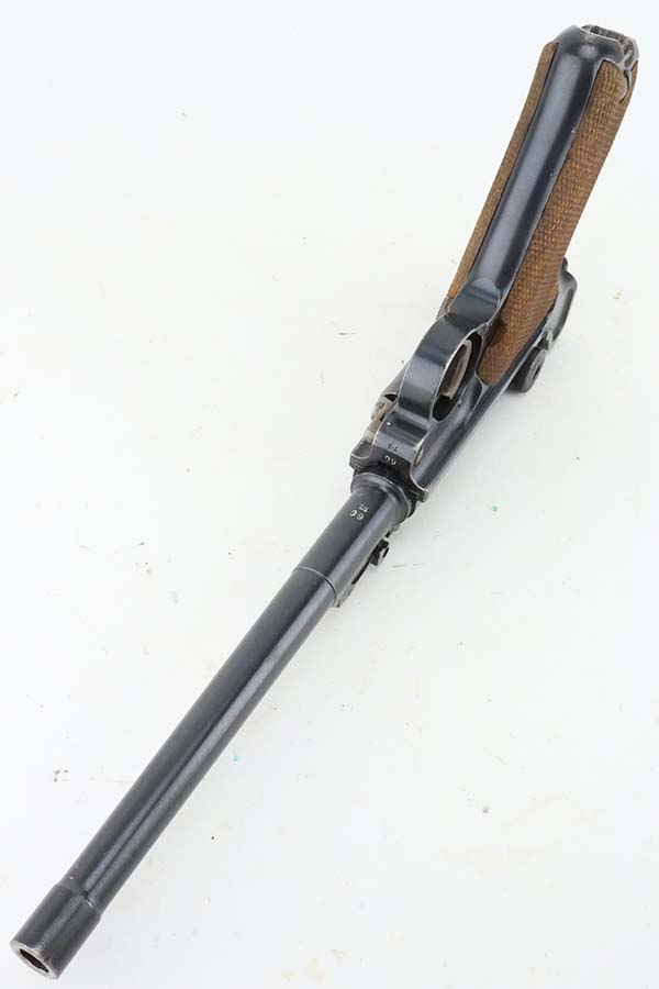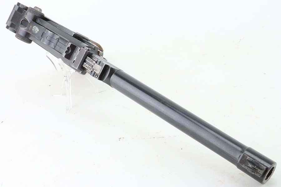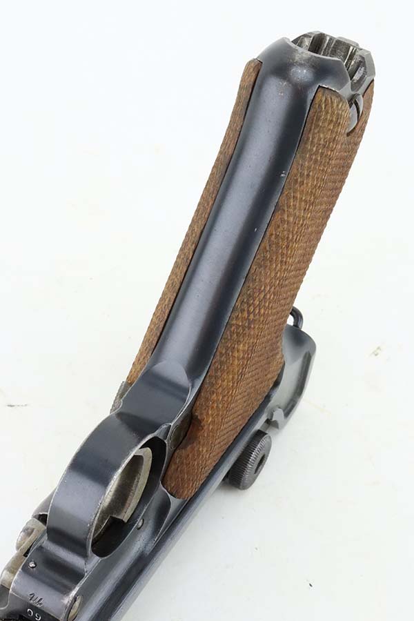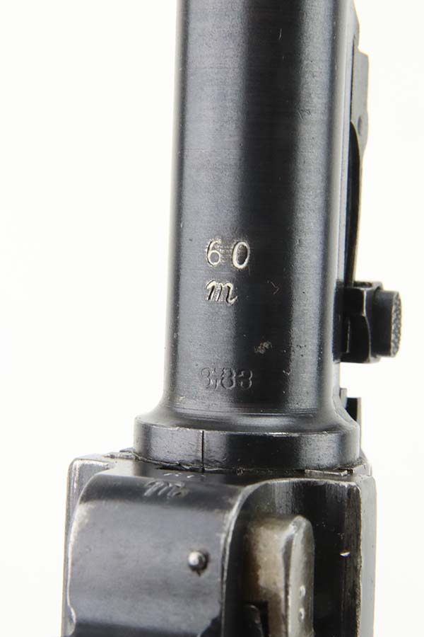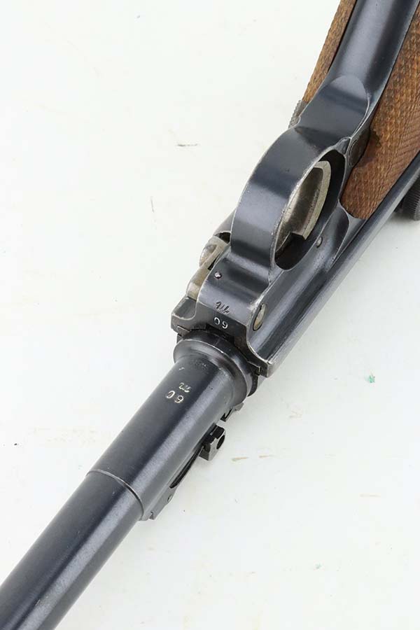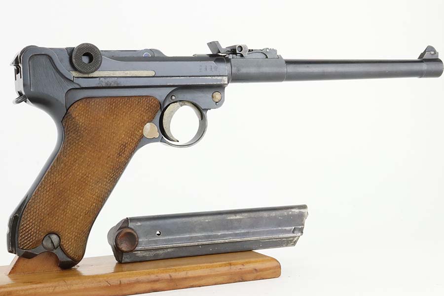 3/11/24 – This is an excellent example of a DWM Artillery Luger issued to the Imperial German military in 1917. All matching with the proper Imperial military proofs. Its original finish rates about 95% with minor high edge and muzzle wear. Fitted with minty matching-numbered wood grips. Comes with an Imperial-proofed but un-numbered magazine (blued tube). Excellent, shiny bore with strong rifling.