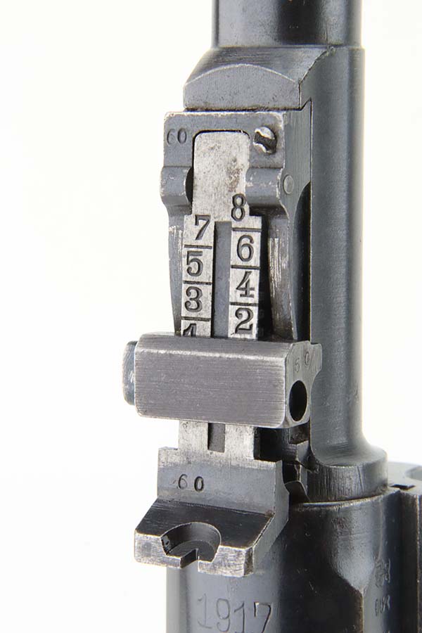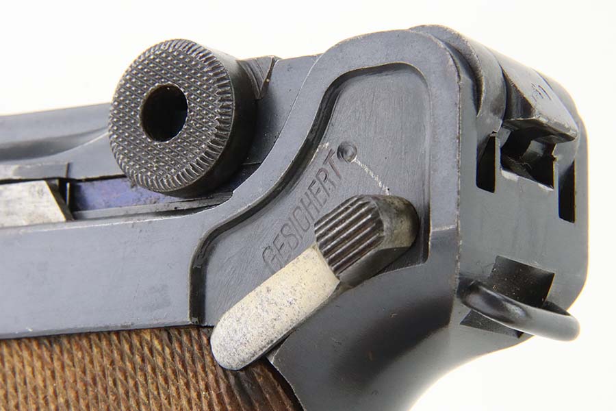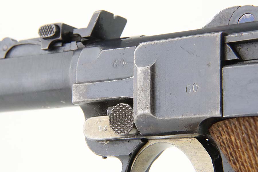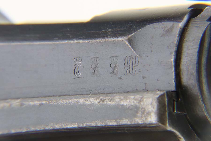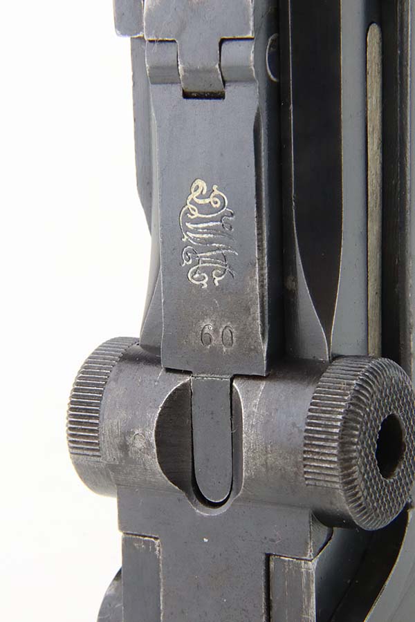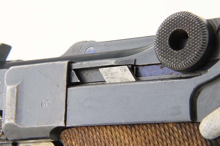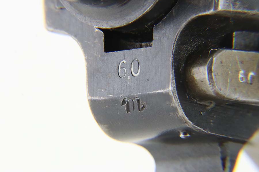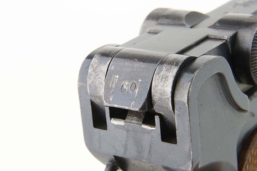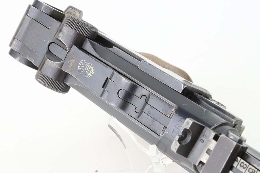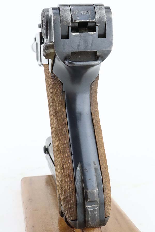 3/11/24 – This is an excellent example of a DWM Artillery Luger issued to the Imperial German military in 1917. All matching with the proper Imperial military proofs. Its original finish rates about 95% with minor high edge and muzzle wear. Fitted with minty matching-numbered wood grips. Comes with an Imperial-proofed but un-numbered magazine (blued tube). Excellent, shiny bore with strong rifling.