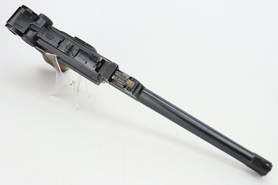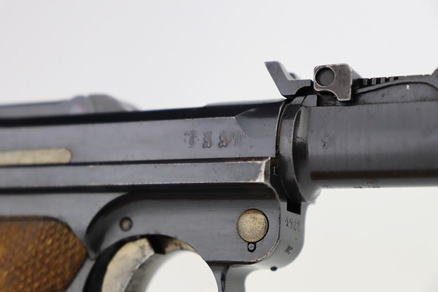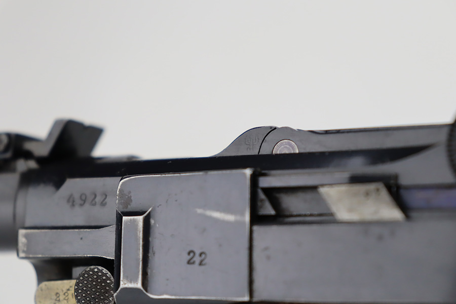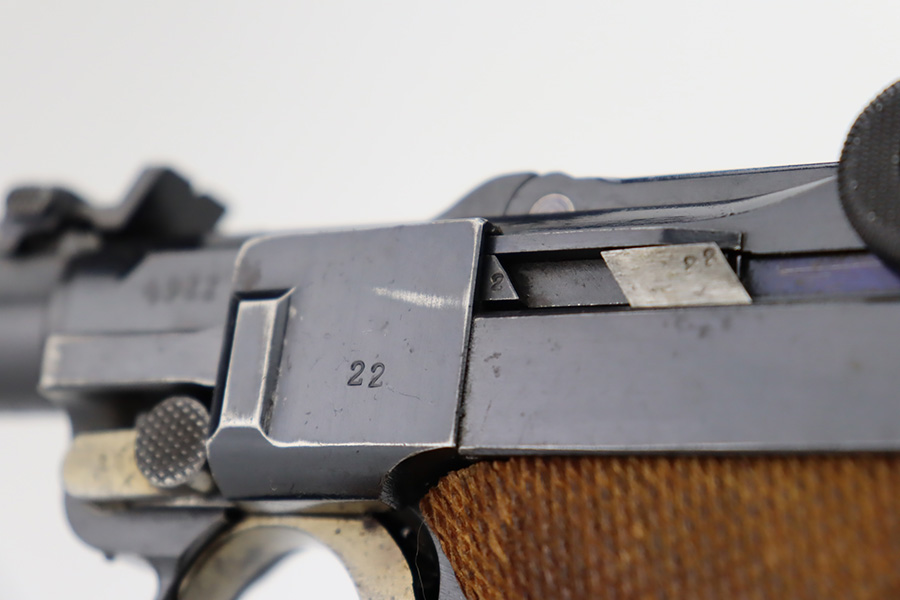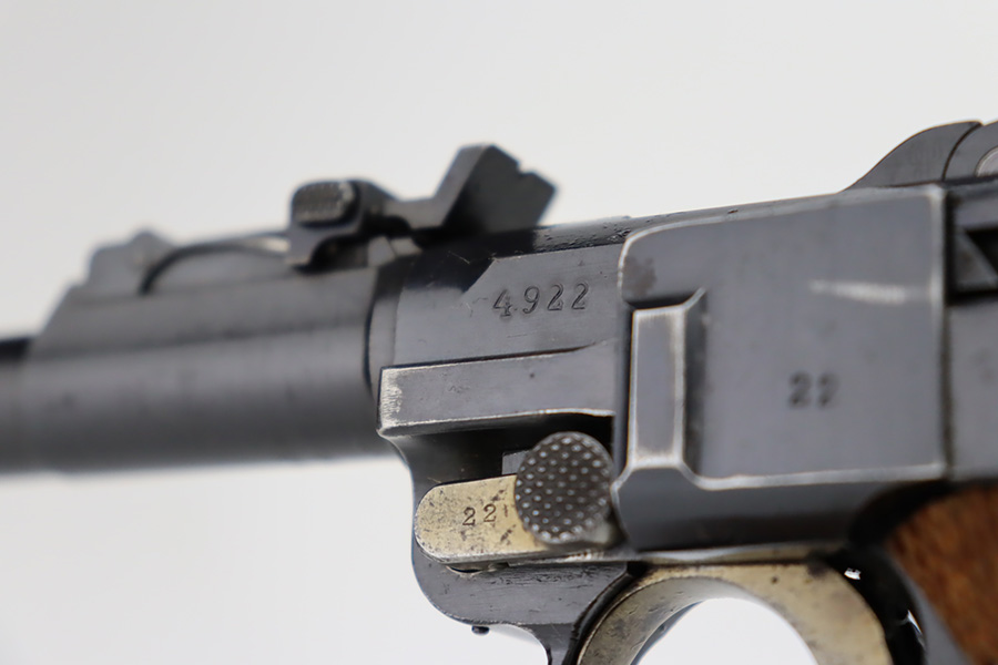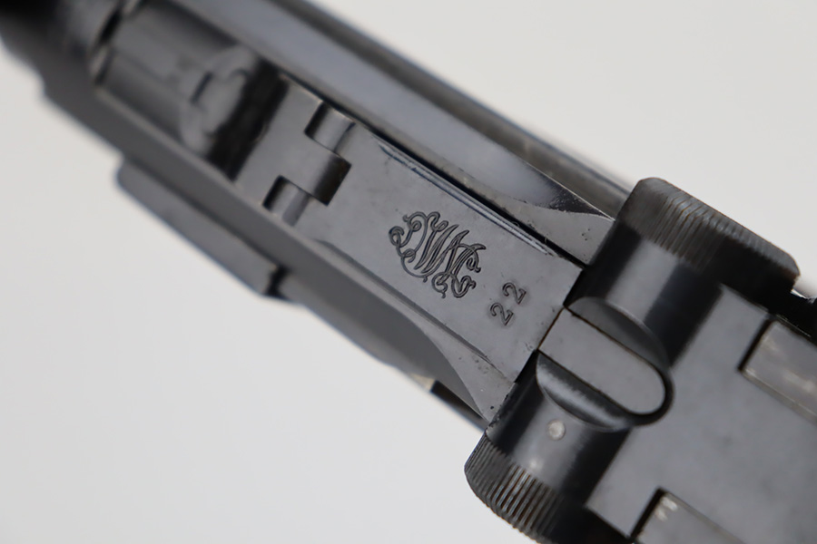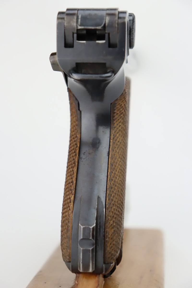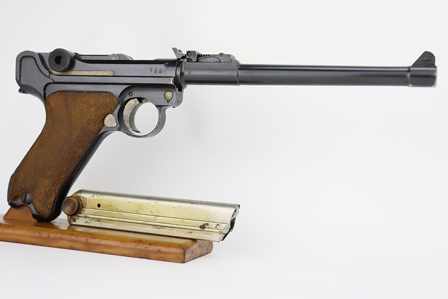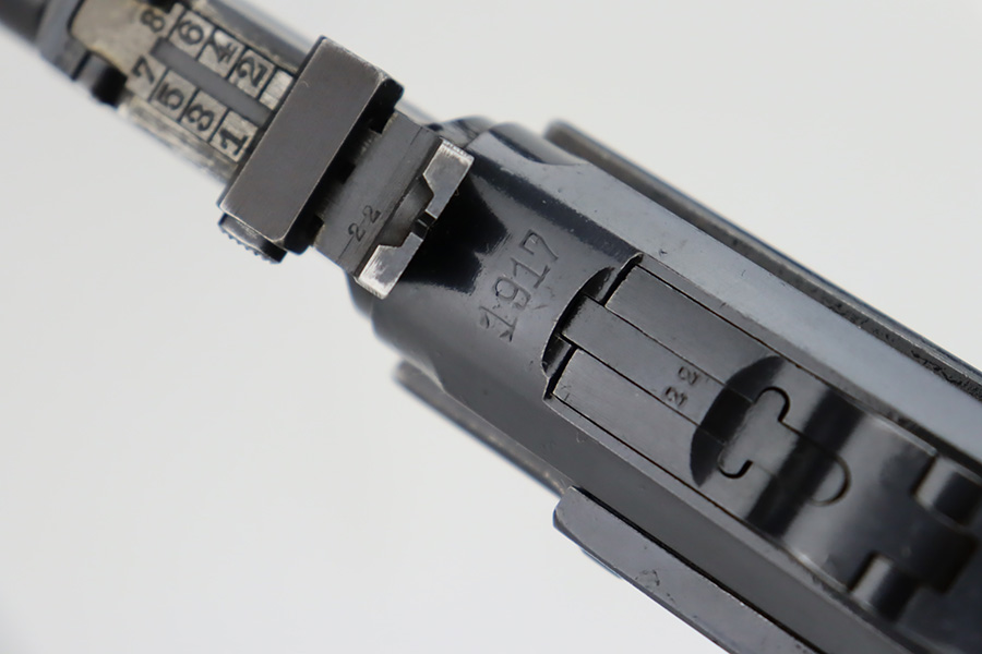11/2/23 – This is an excellent example of a DWM Artillery Luger issued to the Imperial German military in 1917. All matching with the proper Imperial military proofs. It comes with one original matching-numbered magazine. The gun itself has retained about 96% of its original finish with minor wear around the muzzle, on the side plate, and on the very front edges of the side rails. Some light spotty oxidation on the grip straps. Minty matching-numbered wood grips. Near-mint bore.