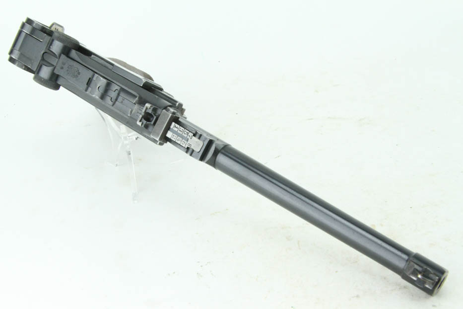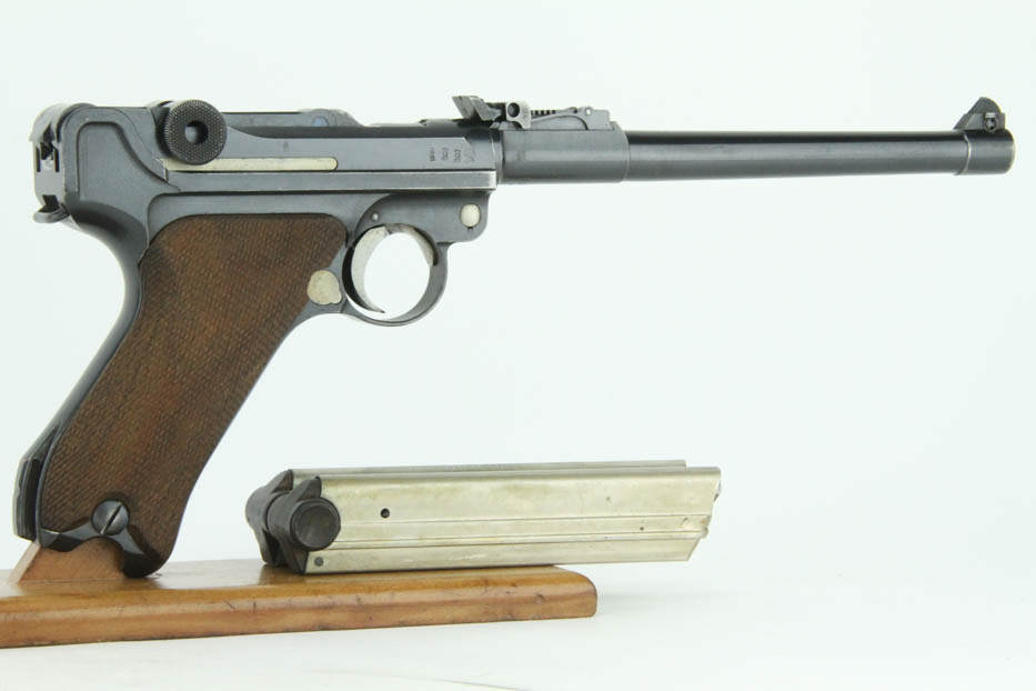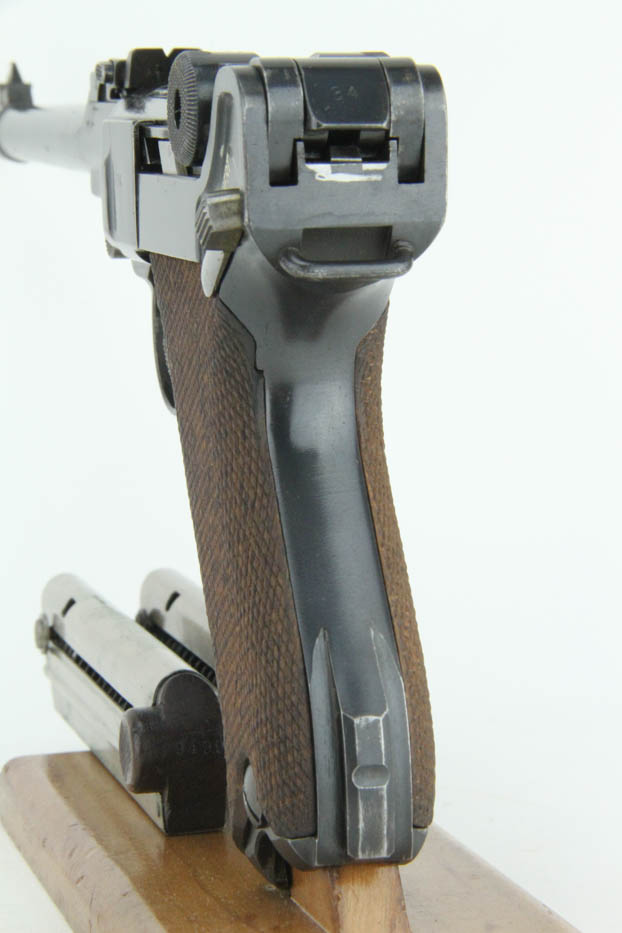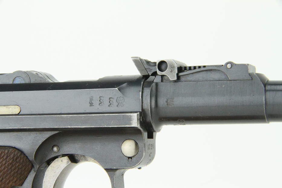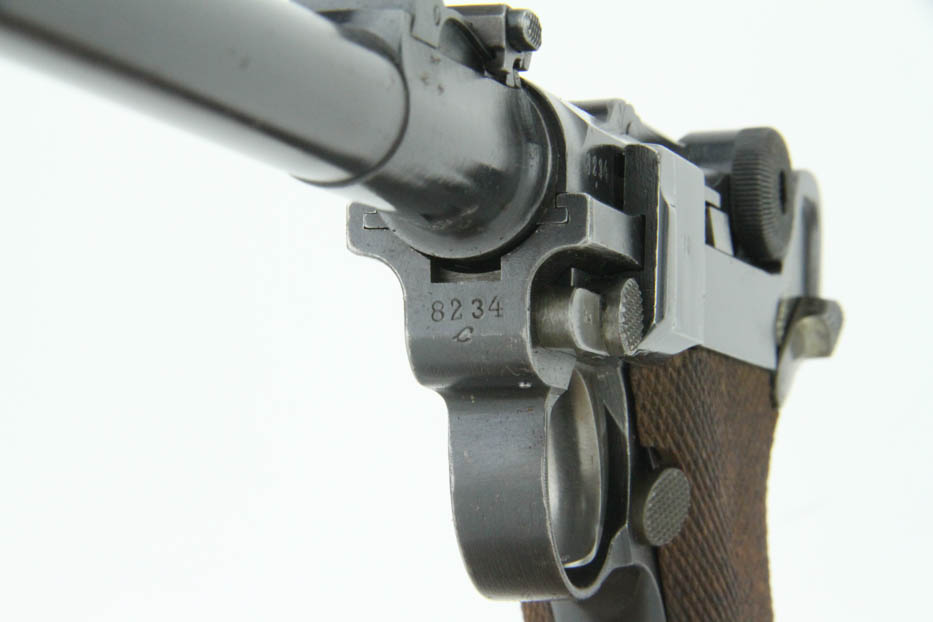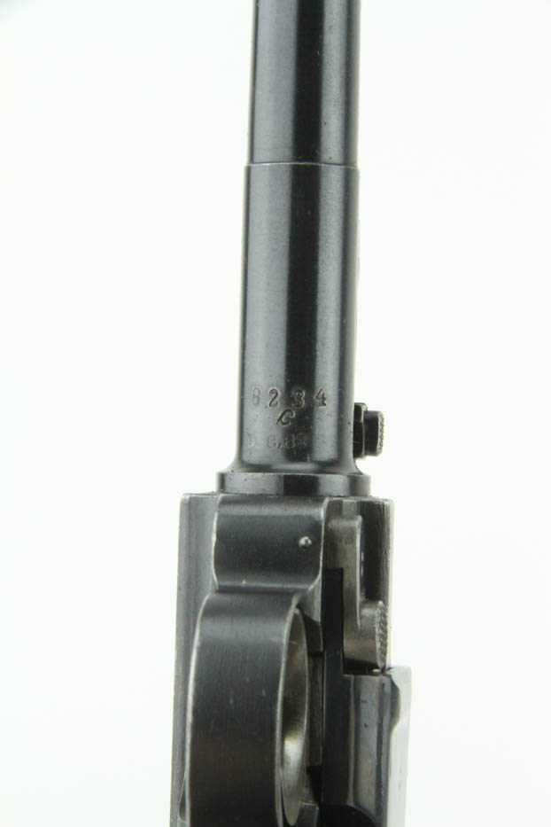 7/25/24 – This is an excellent example of a DWM Artillery Luger issued to the Imperial German Army in 1917. All matching with the proper Imperial military proofs. It comes as a rig with a minty 1916-dated holster, an un-marked tool, two mismatched period-correct magazines, a period-correct cleaning rod, and a very high quality reproduction front sight adjustment tool. The gun’s original finish rates about 97% with just minor high edge and muzzle wear. Fitted with minty wood grips – the left is numbered and matching, the right is un-numbered. The bore has good rifling, but there is light pin-pricking throughout.