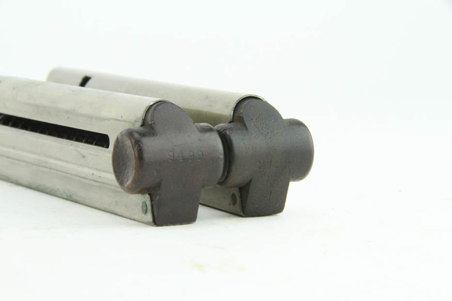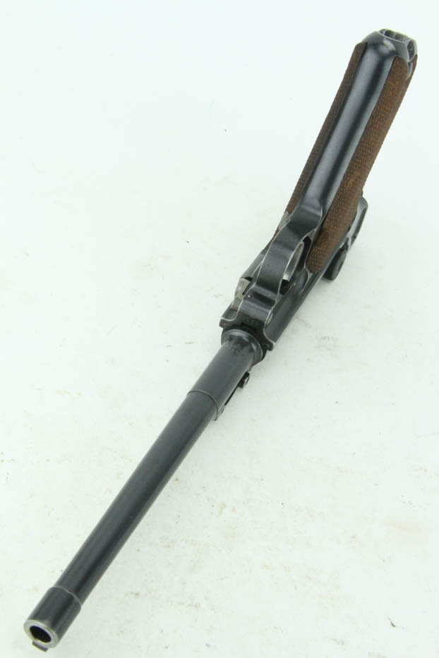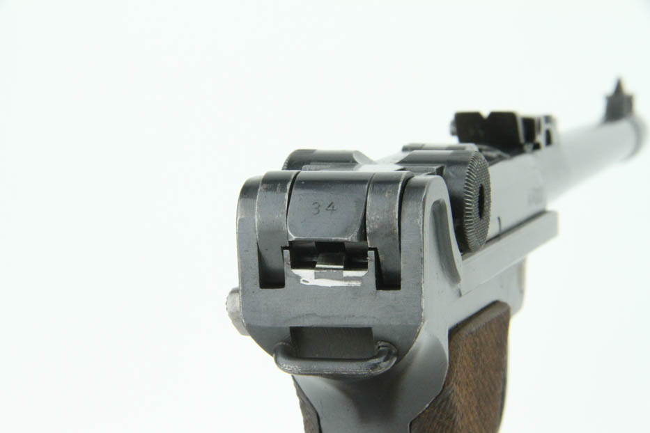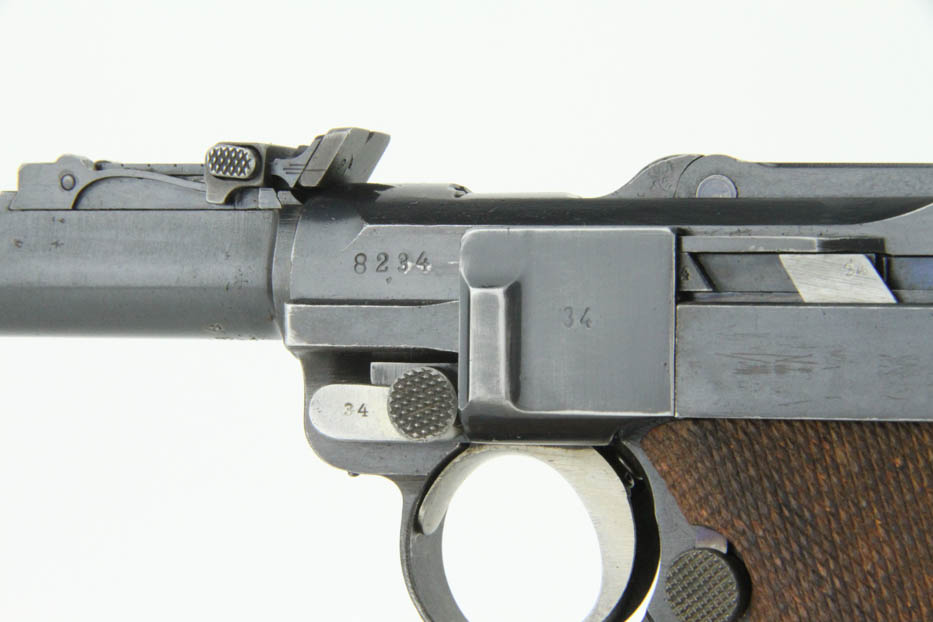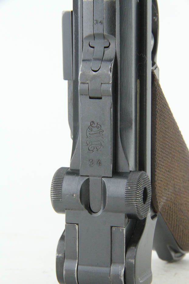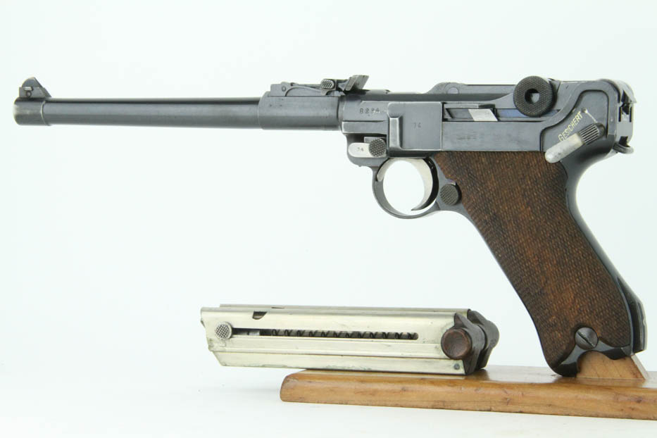 7/25/24 – This is an excellent example of a DWM Artillery Luger issued to the Imperial German Army in 1917. All matching with the proper Imperial military proofs. It comes as a rig with a minty 1916-dated holster, an un-marked tool, two mismatched period-correct magazines, a period-correct cleaning rod, and a very high quality reproduction front sight adjustment tool. The gun’s original finish rates about 97% with just minor high edge and muzzle wear. Fitted with minty wood grips – the left is numbered and matching, the right is un-numbered. The bore has good rifling, but there is light pin-pricking throughout.