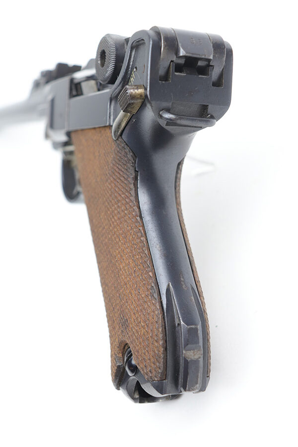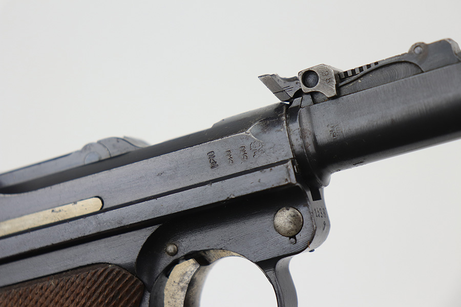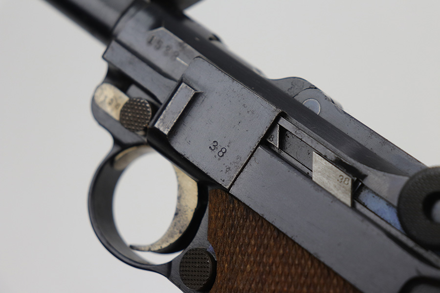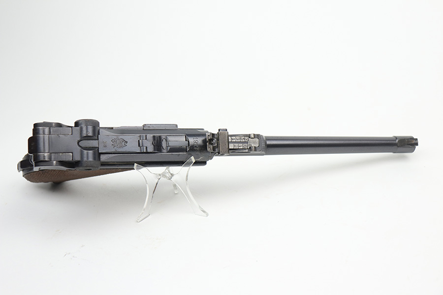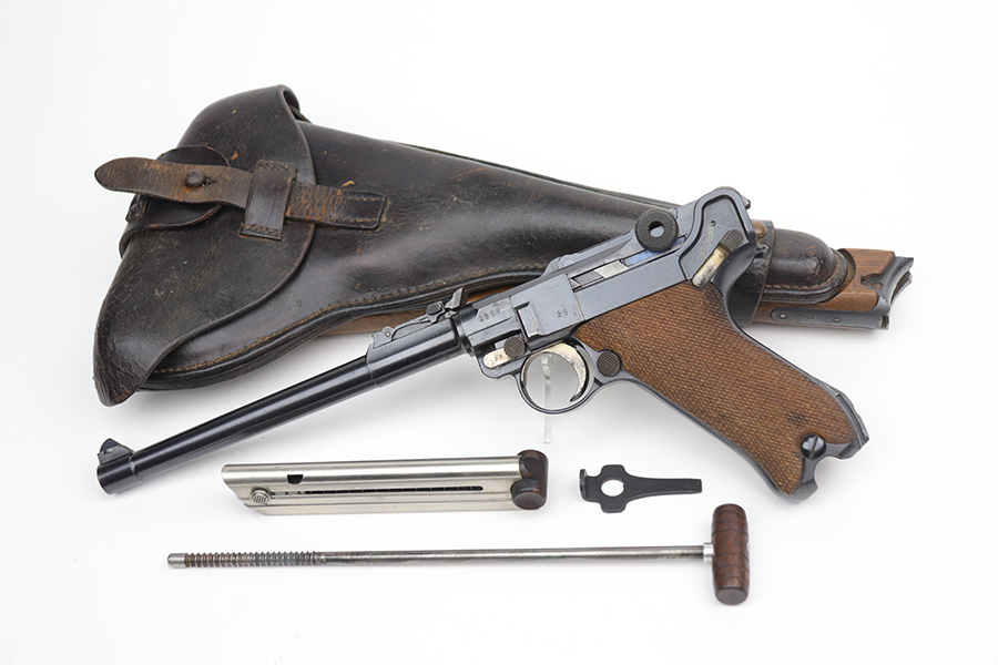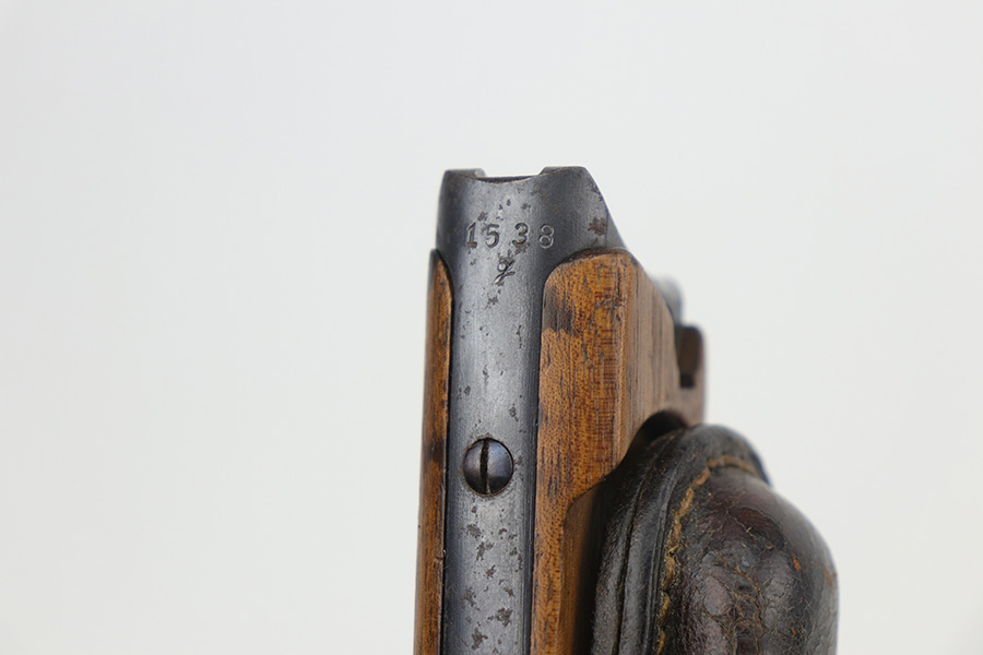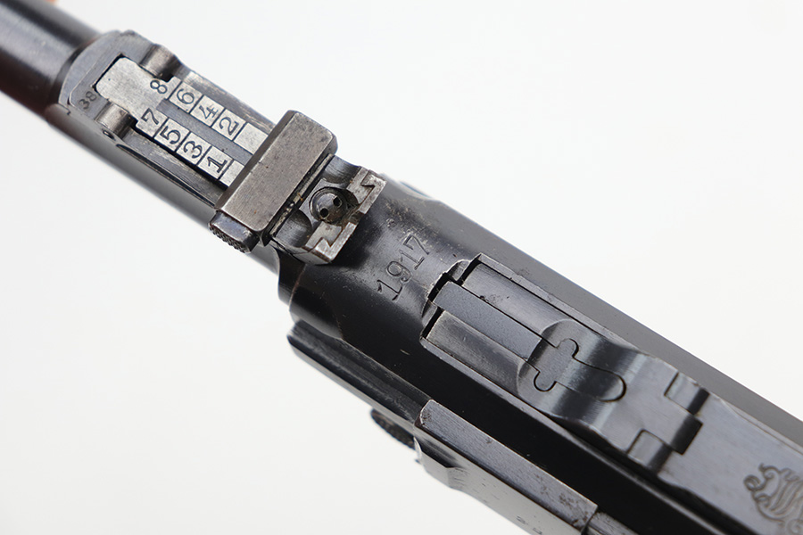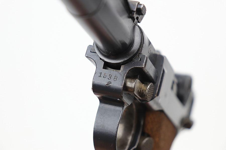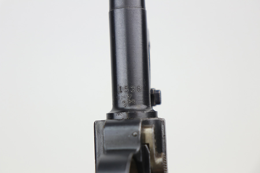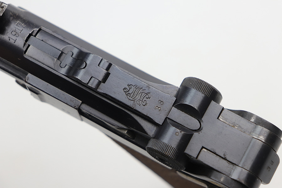 10/28/21 – This is an excellent example of a DWM Artillery Luger rig issued to the Imperial German military in 1917. It is all matching and has the proper Imperial German proofs on the right side of the slide. It comes with an original matching-numbered magazine, an original matching-numbered wood stock, a period-correct leather holster (the lift is present but ripped on one side), period-correct cleaning rod, an an un-marked luger tool. The stock also has the proper Imperial proof on the back. The gun has retained about 97% of its original finish. There are just hints of wear on the side plate, high edges, and around the muzzle. Most of the wear is scratchy on the top of the chamber, around the chamber date. While there is very little actual finish loss, there are tiny dots of oxidation throughout. Comes with excellent matching wood grips. The bore has strong rifling with areas of minor pin-pricking throughout.