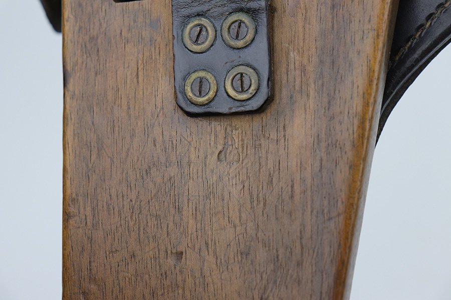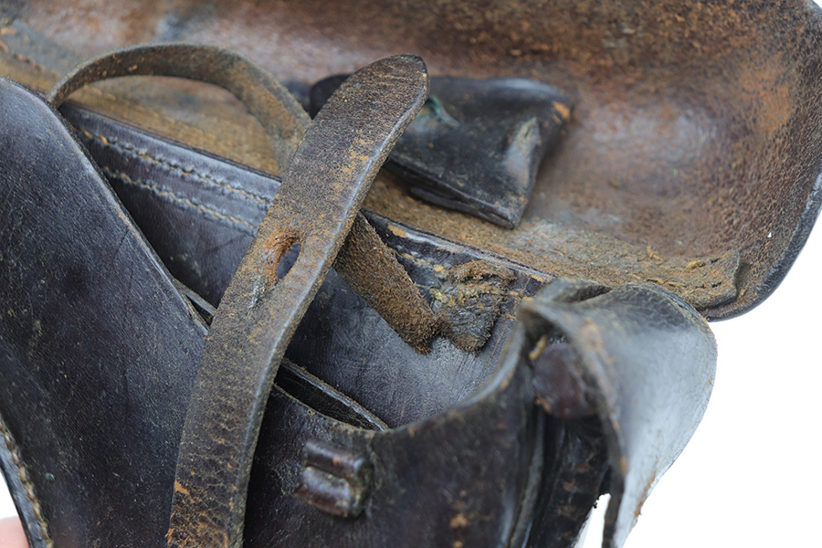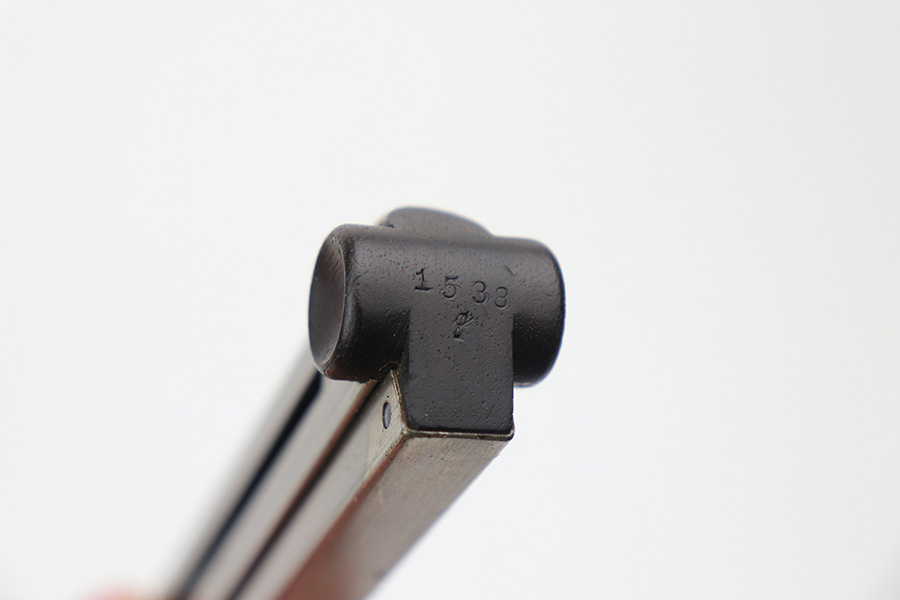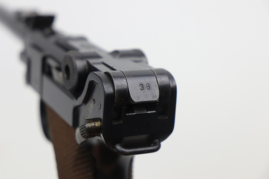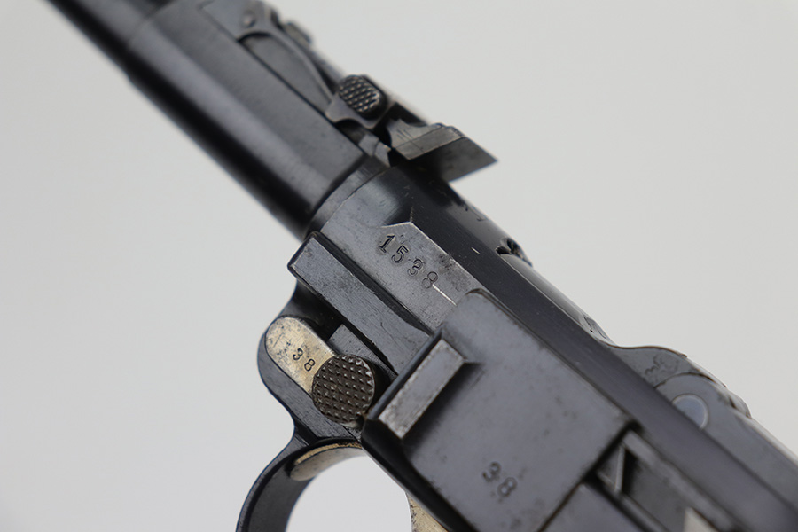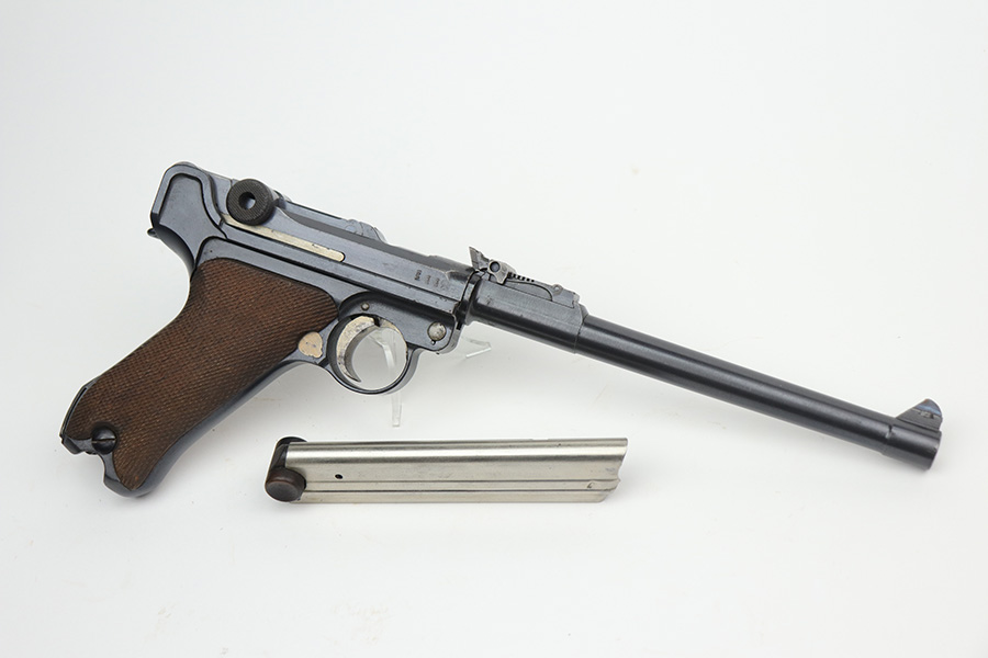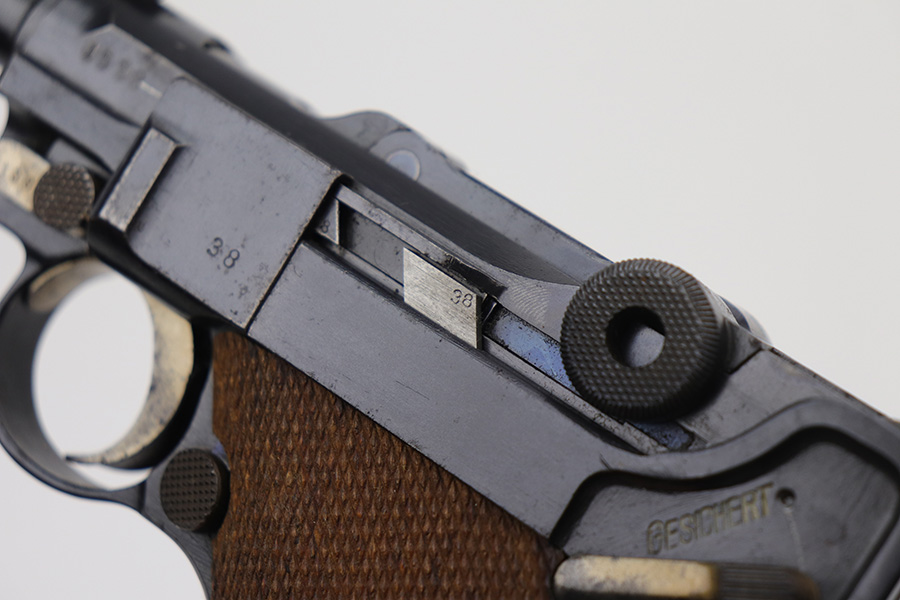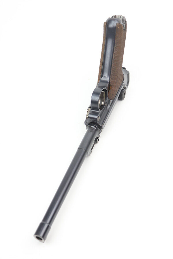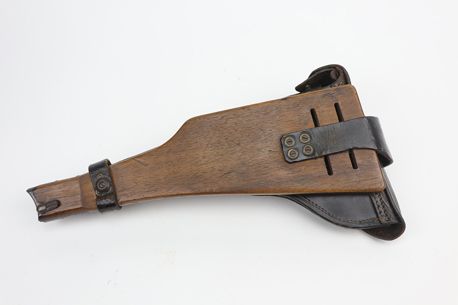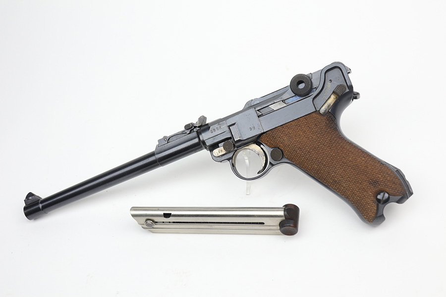 10/28/21 – This is an excellent example of a DWM Artillery Luger rig issued to the Imperial German military in 1917. It is all matching and has the proper Imperial German proofs on the right side of the slide. It comes with an original matching-numbered magazine, an original matching-numbered wood stock, a period-correct leather holster (the lift is present but ripped on one side), period-correct cleaning rod, an an un-marked luger tool. The stock also has the proper Imperial proof on the back. The gun has retained about 97% of its original finish. There are just hints of wear on the side plate, high edges, and around the muzzle. Most of the wear is scratchy on the top of the chamber, around the chamber date. While there is very little actual finish loss, there are tiny dots of oxidation throughout. Comes with excellent matching wood grips. The bore has strong rifling with areas of minor pin-pricking throughout.