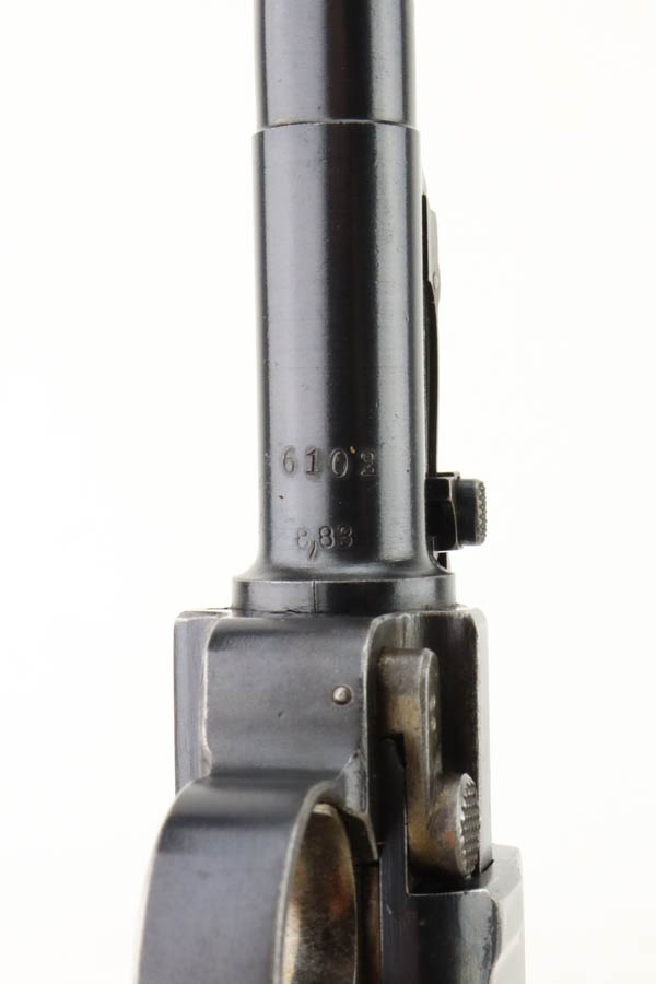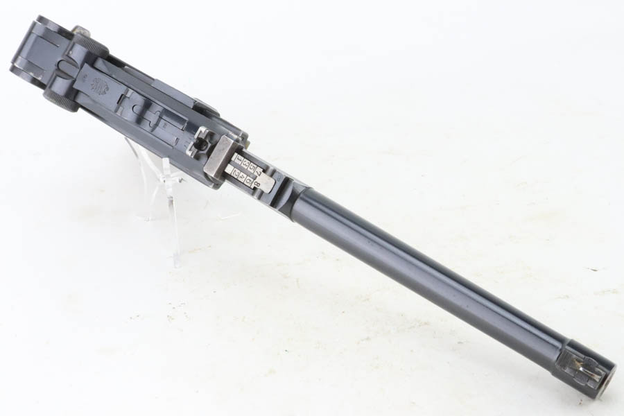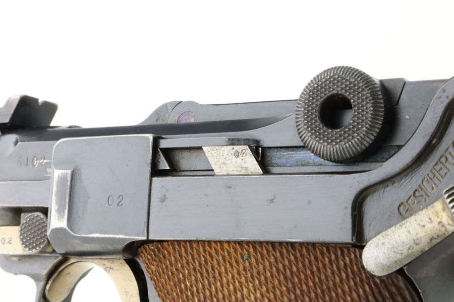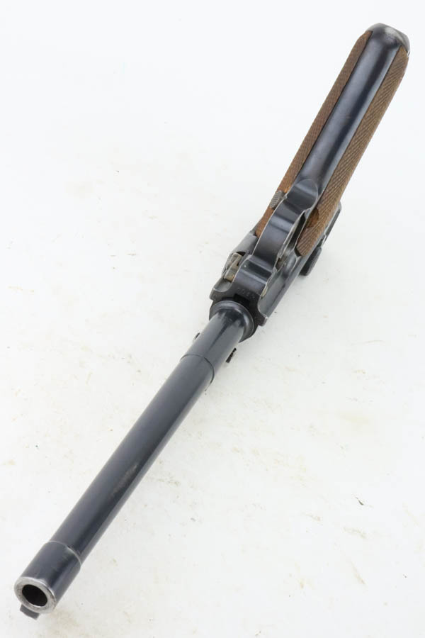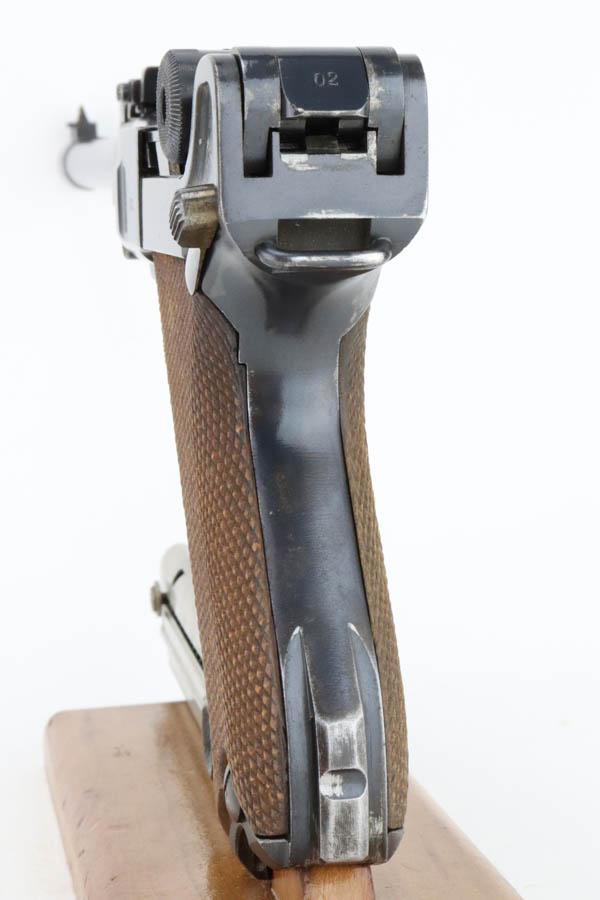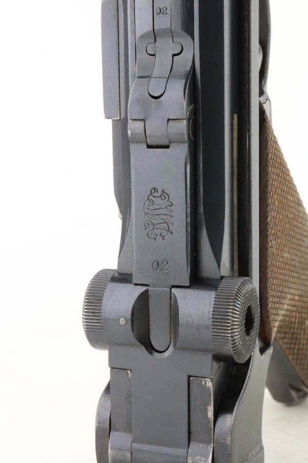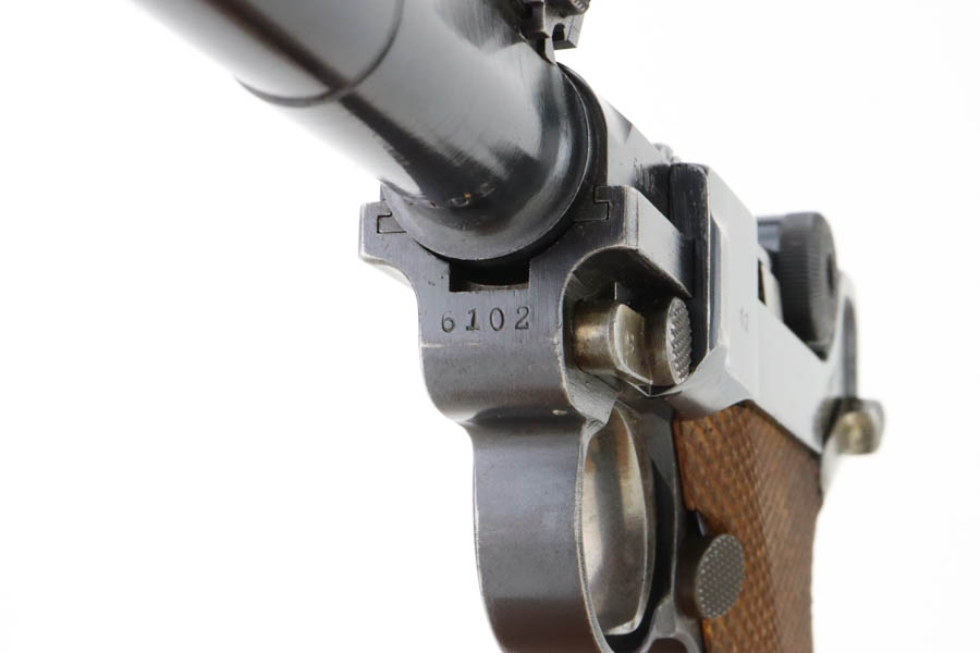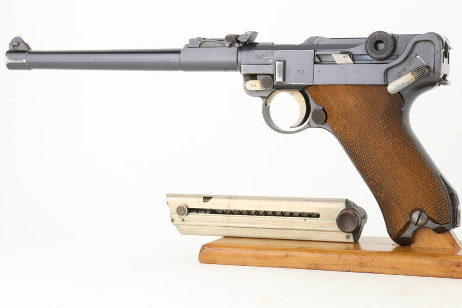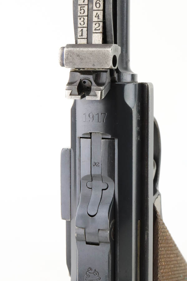 7/17/24 – This is an excellent example of a DWM Artillery Luger issued to the Imperial German Army in 1917. All matching with the proper Imperial military proofs. It comes as a rig with one mismatched magazine, a very nice 1915-dated holster, un-marked tool, cleaning rod, leather harness, and a matching-numbered Imperial-proofed wood stock. The gun itself has retained about 96-97% of its original finish. There is minor wear around the muzzle, on some of the high edges, and one small spot at the base of the front strap. Very minor dulling on the grip straps. Fitted with minty matching-numbered wood grips. Very nice bore with great rifling, just some very minor pin-pricking.