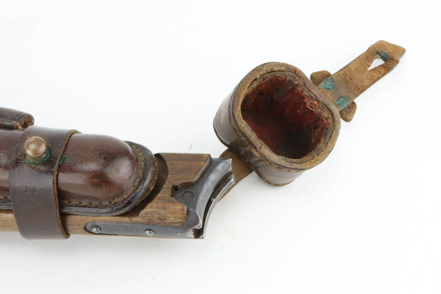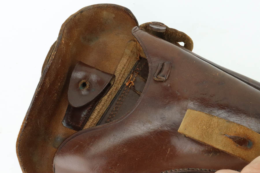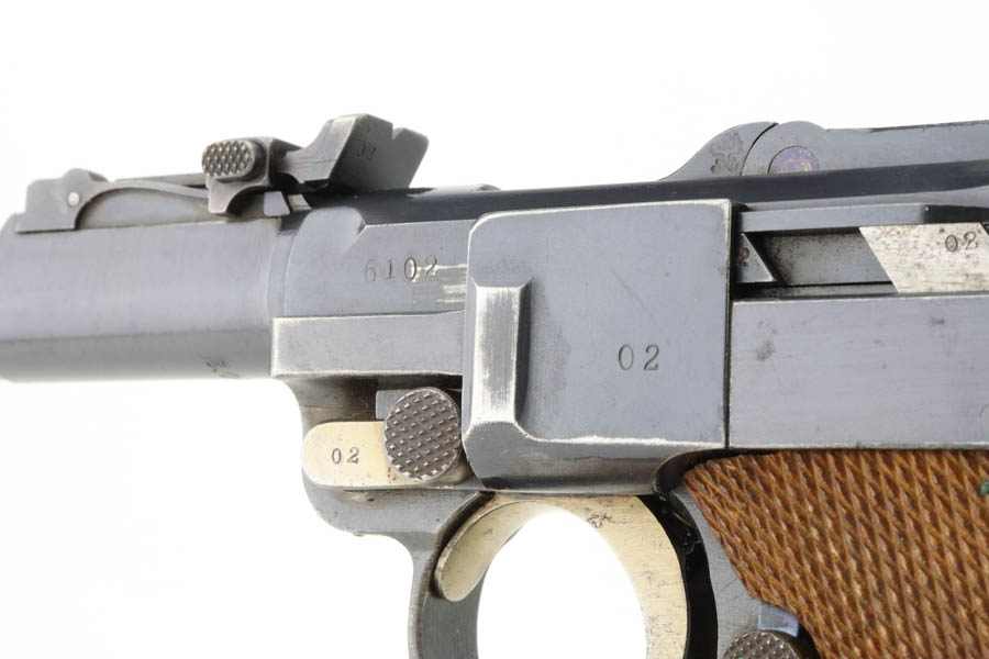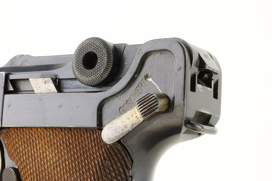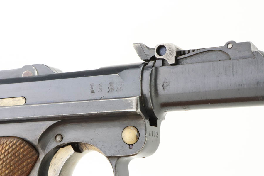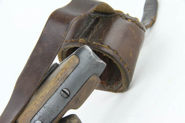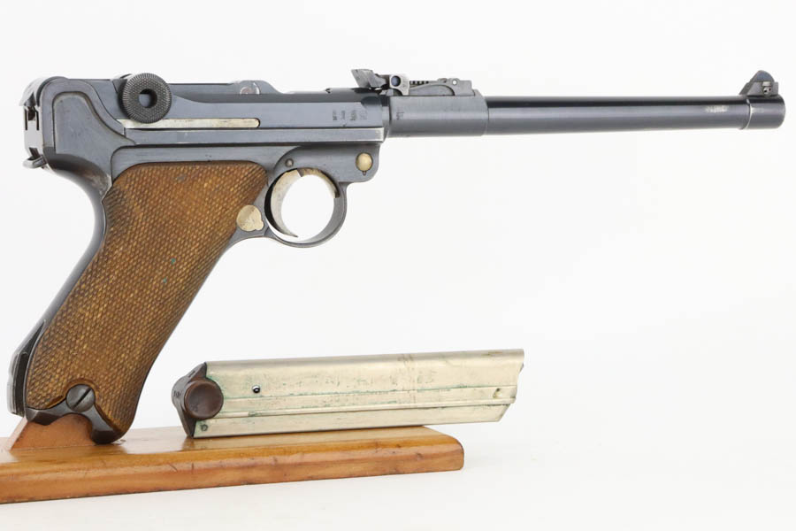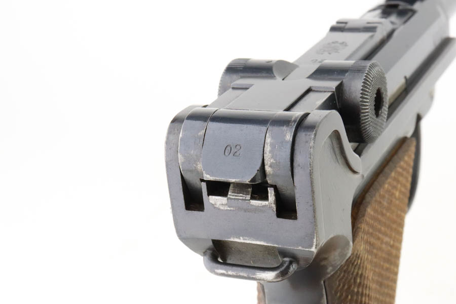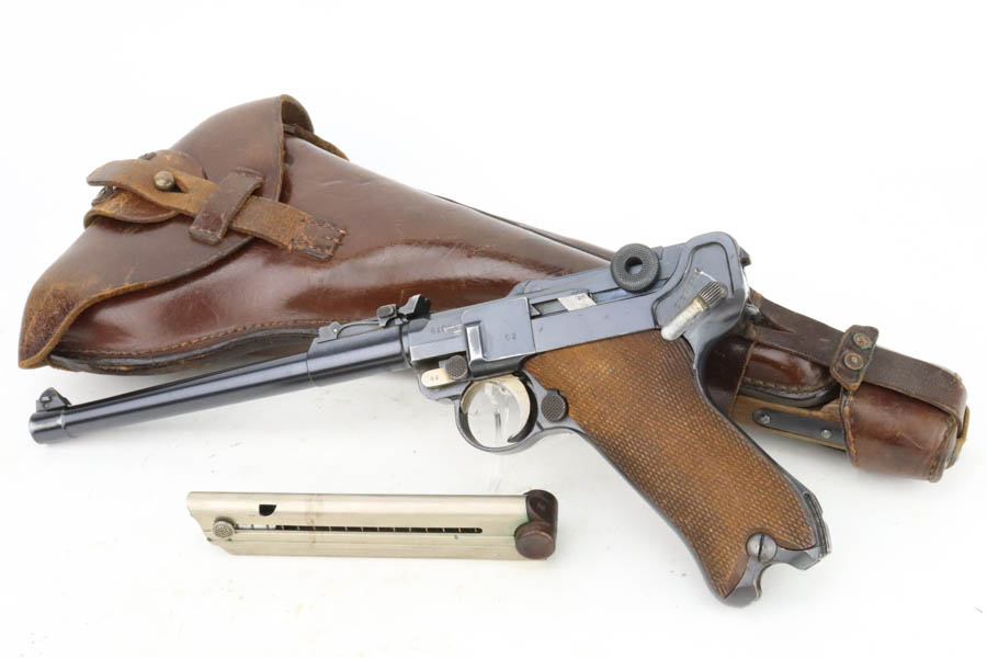 7/17/24 – This is an excellent example of a DWM Artillery Luger issued to the Imperial German Army in 1917. All matching with the proper Imperial military proofs. It comes as a rig with one mismatched magazine, a very nice 1915-dated holster, un-marked tool, cleaning rod, leather harness, and a matching-numbered Imperial-proofed wood stock. The gun itself has retained about 96-97% of its original finish. There is minor wear around the muzzle, on some of the high edges, and one small spot at the base of the front strap. Very minor dulling on the grip straps. Fitted with minty matching-numbered wood grips. Very nice bore with great rifling, just some very minor pin-pricking.