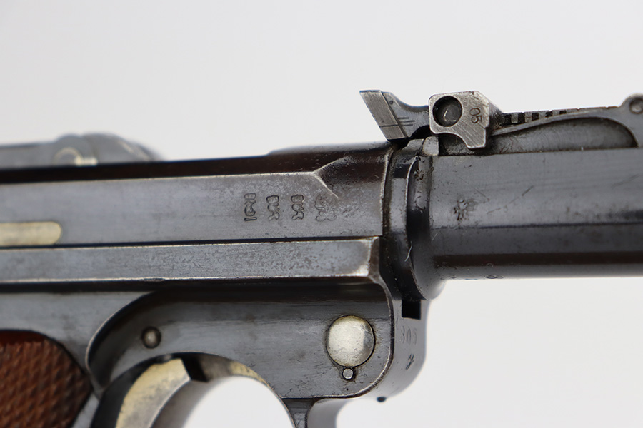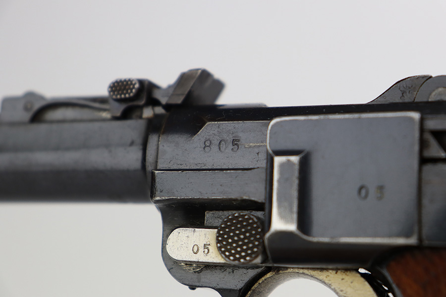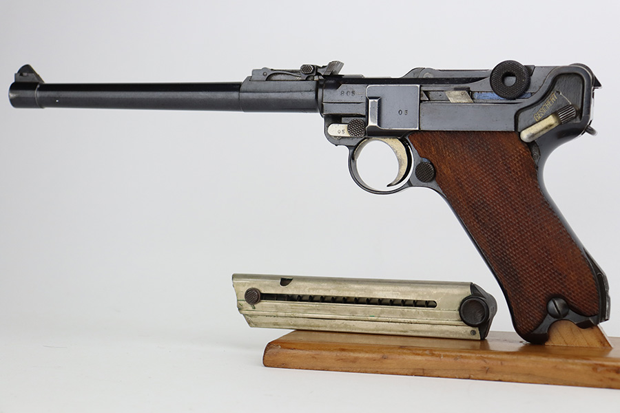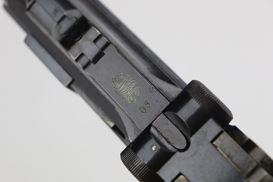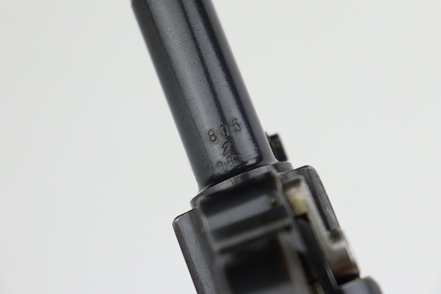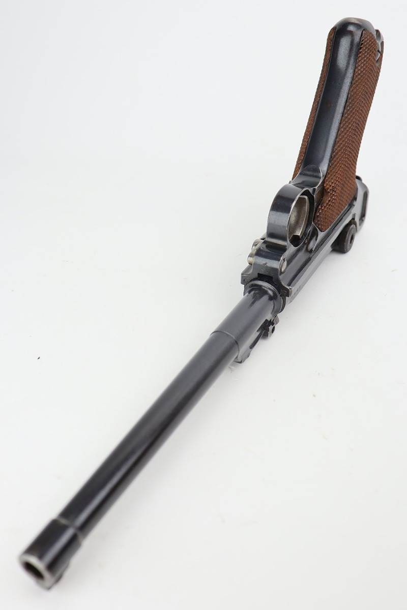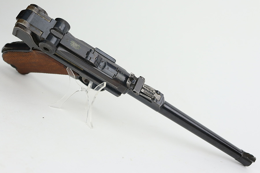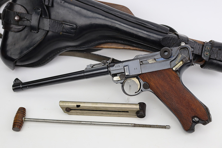 8/21/23 – This is an excellent example of a DWM Artillery Luger issued to the Imperial German military in 1917. It is all matching with the proper Imperial proofs. It comes as a rig with a matching-numbered magazine, a matching-numbered wood stock, a very nice 1917-dated holster, cleaning rod, leather harness, and leather shoulder strap. The gun itself has retained about 97% of its original finish with just very minor wear around the muzzle and on the side plate. While there is very little finish loss, there are areas of very light spotty oxidation throughout, most noticeable along the barrel and on the grip straps. Fitted with matching-numbered wood grips – small chip in the upper corner of the left panel. Excellent bore with great rifling.