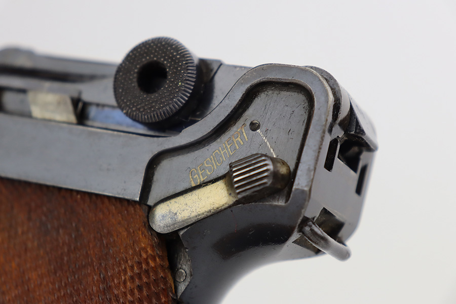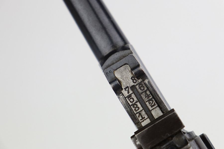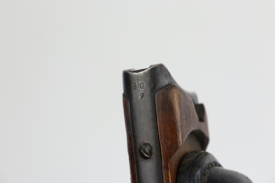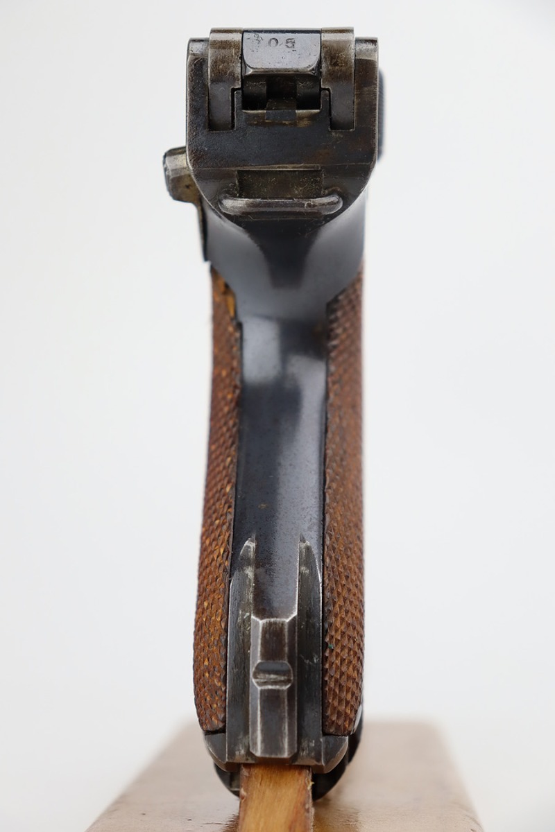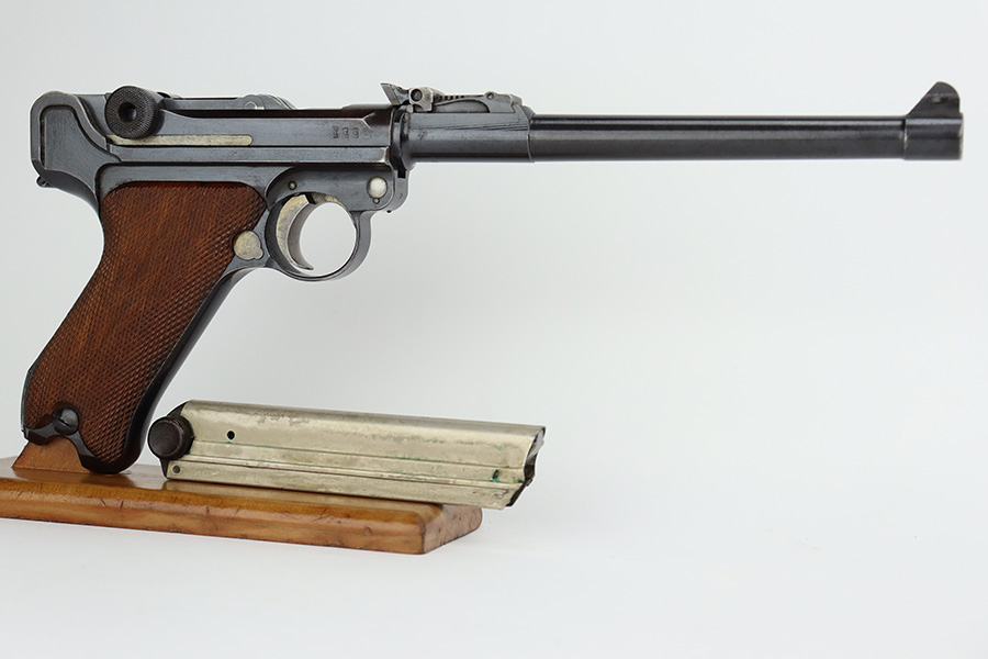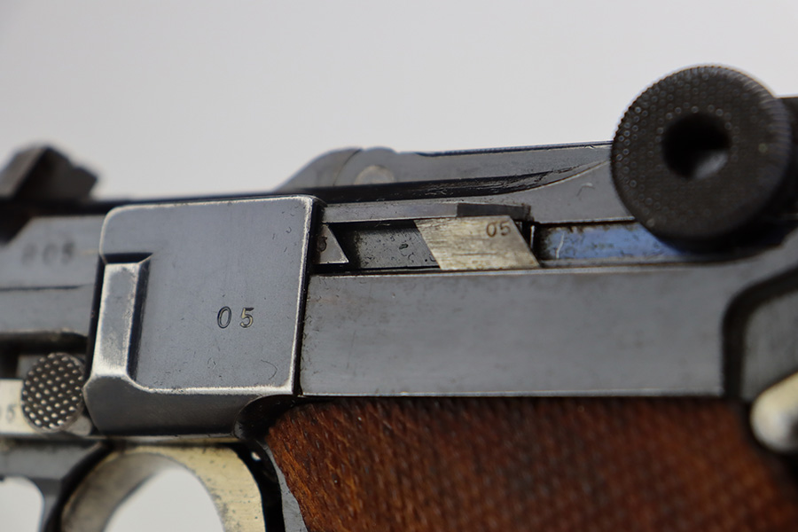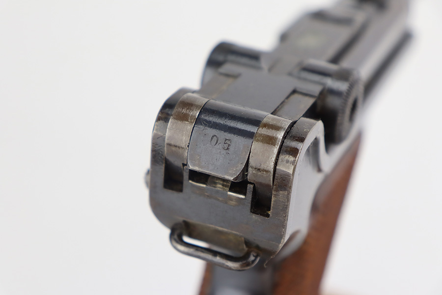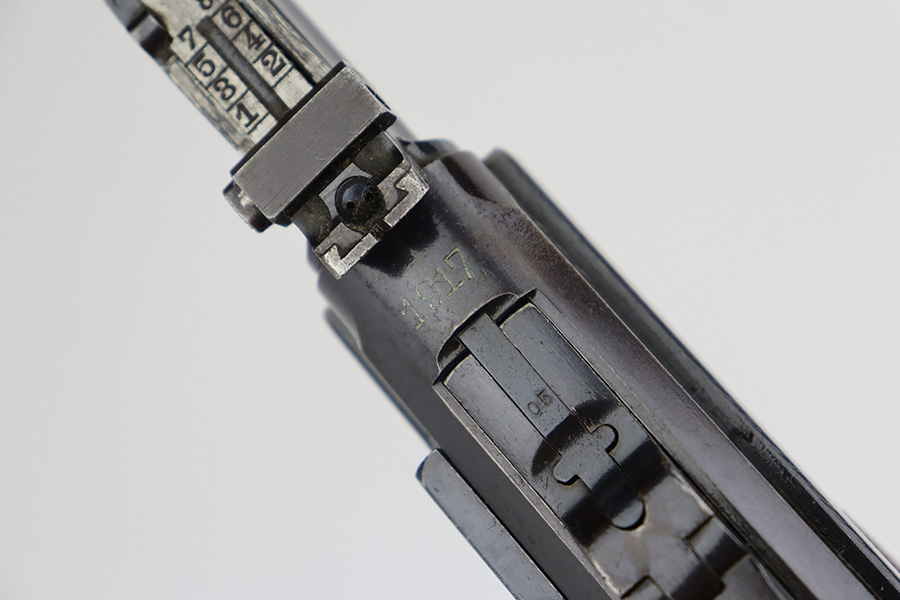8/21/23 – This is an excellent example of a DWM Artillery Luger issued to the Imperial German military in 1917. It is all matching with the proper Imperial proofs. It comes as a rig with a matching-numbered magazine, a matching-numbered wood stock, a very nice 1917-dated holster, cleaning rod, leather harness, and leather shoulder strap. The gun itself has retained about 97% of its original finish with just very minor wear around the muzzle and on the side plate. While there is very little finish loss, there are areas of very light spotty oxidation throughout, most noticeable along the barrel and on the grip straps. Fitted with matching-numbered wood grips – small chip in the upper corner of the left panel. Excellent bore with great rifling.