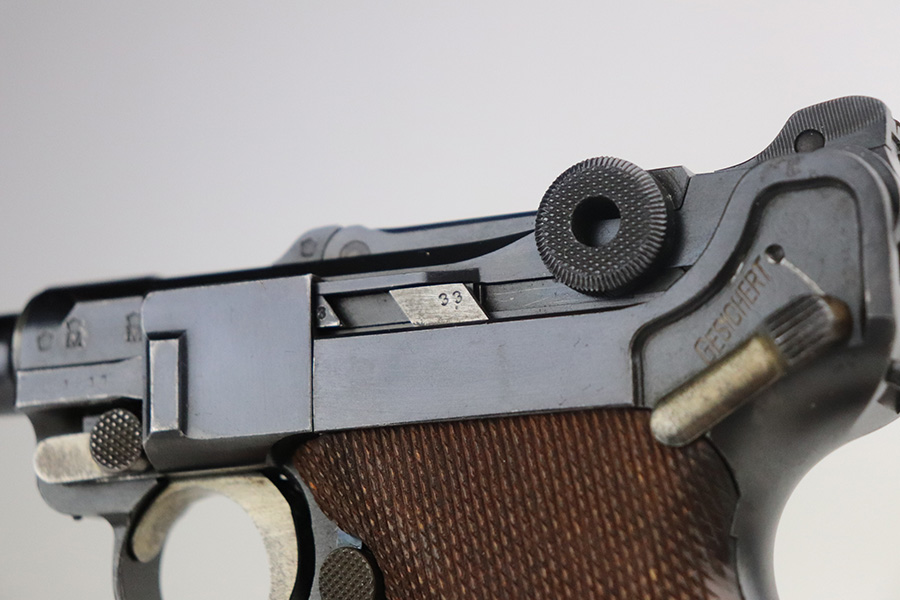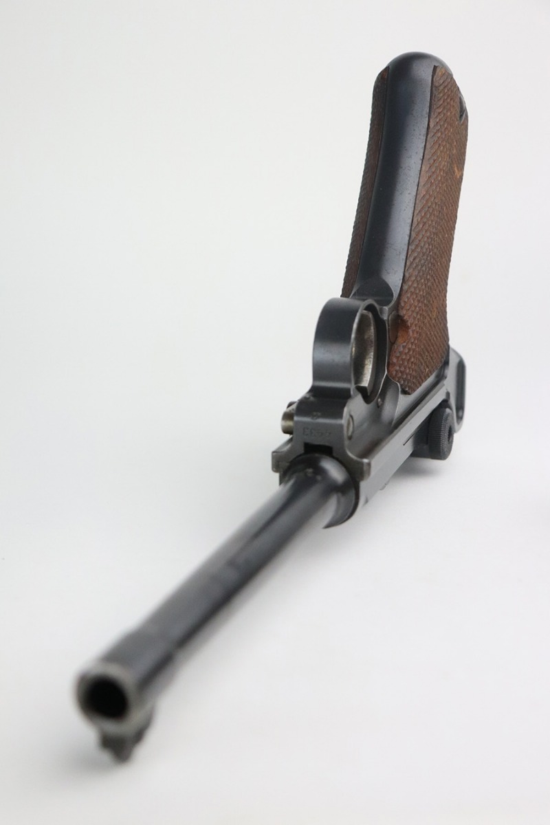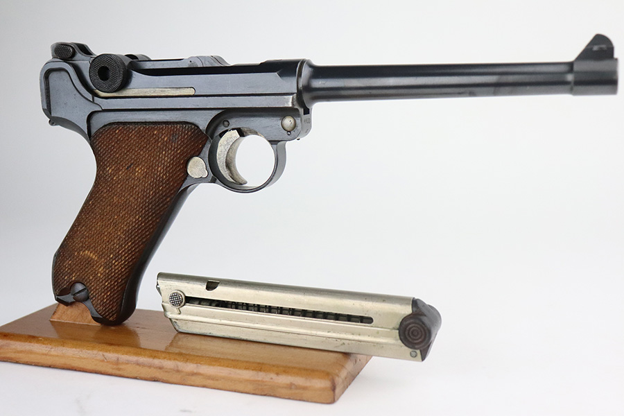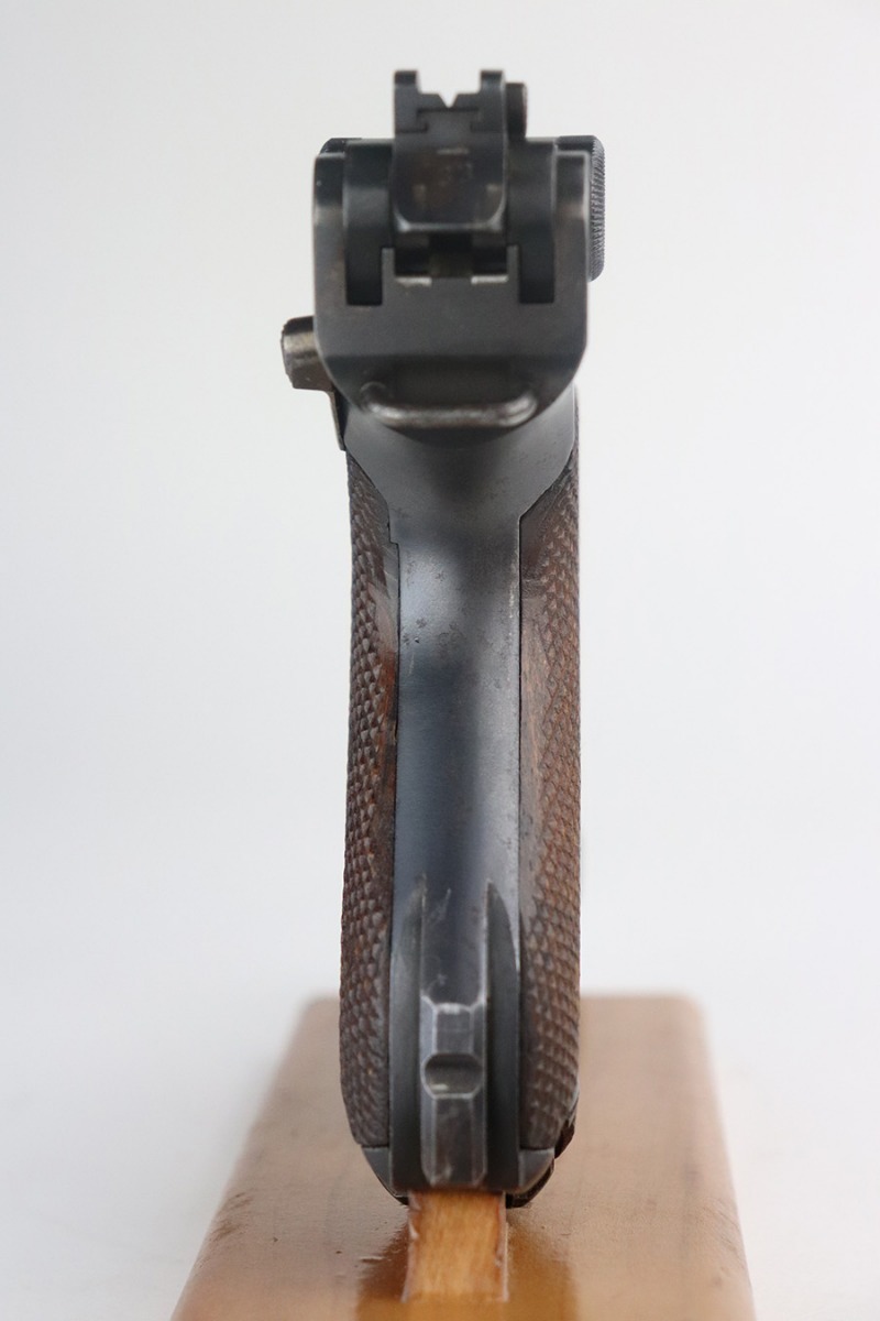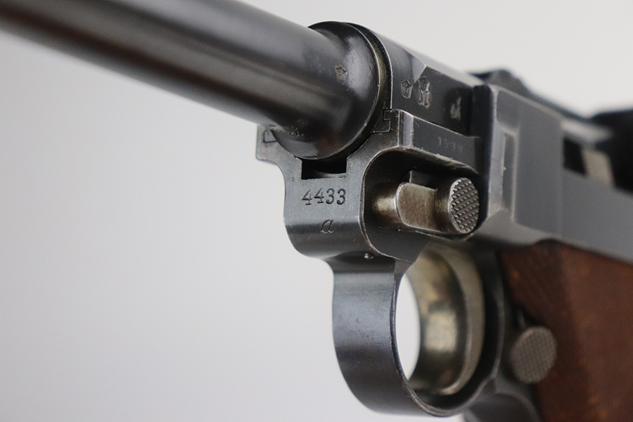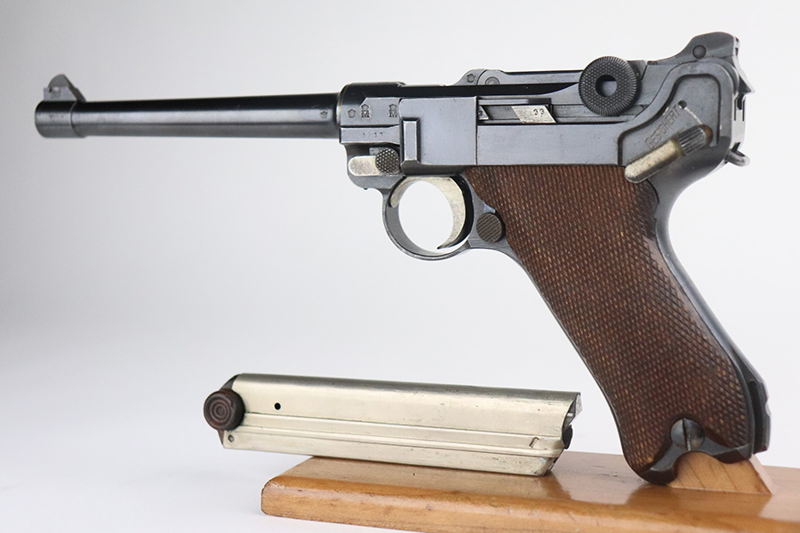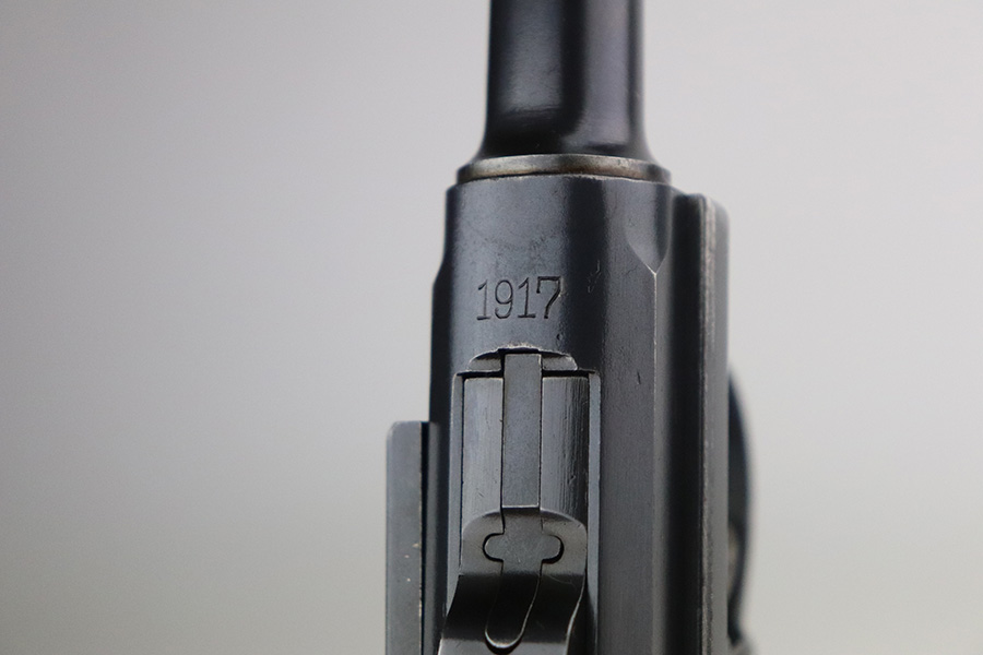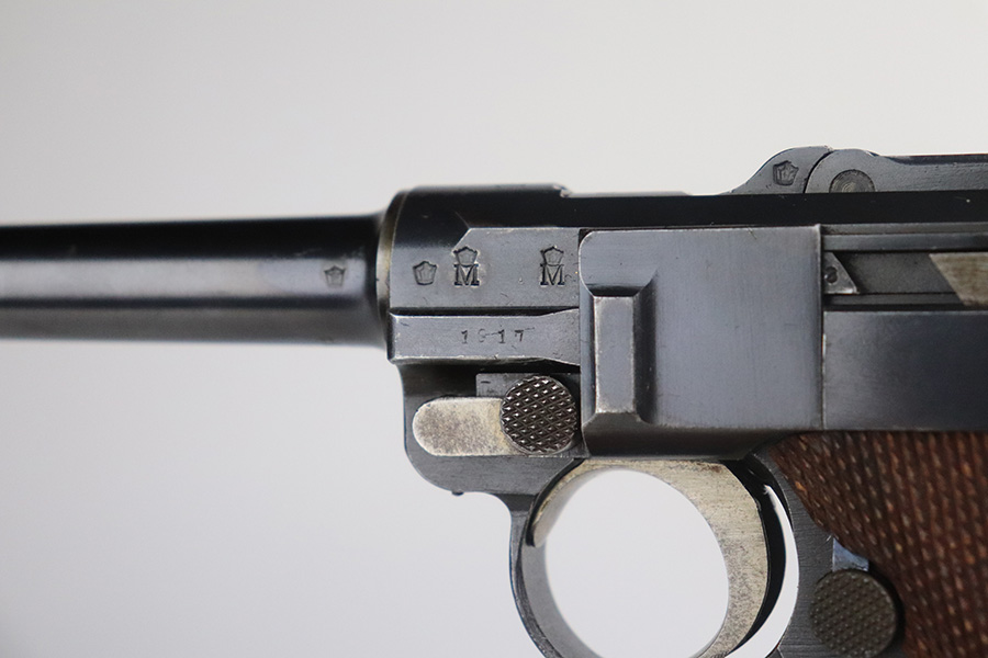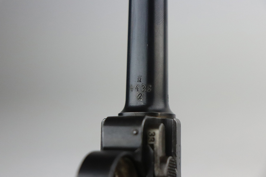 2/28/23 – This is an excellent example of a Navy Luger issued to the Imperial German Navy in 1917. The gun is all matching and has the proper “Crown M” proofs. The gun comes with a matching numbered magazine, but the magazine was renumbered to match. It has retained about 97% of its original finish. There are hints of wear on the side plate and side rails. There is spotty oxidation on the whole underside of the frame and both straps. Comes with excellent un-numbered grips. Excellent bore – shiny with strong rifling and some very light freckling here and there.