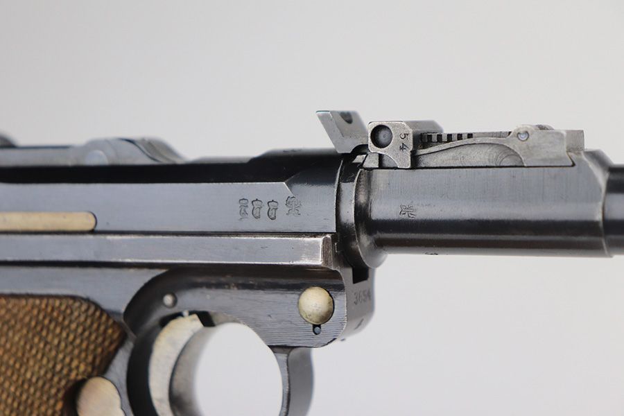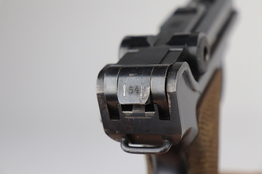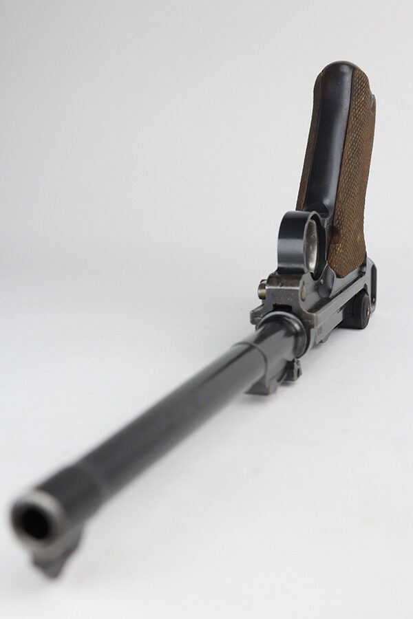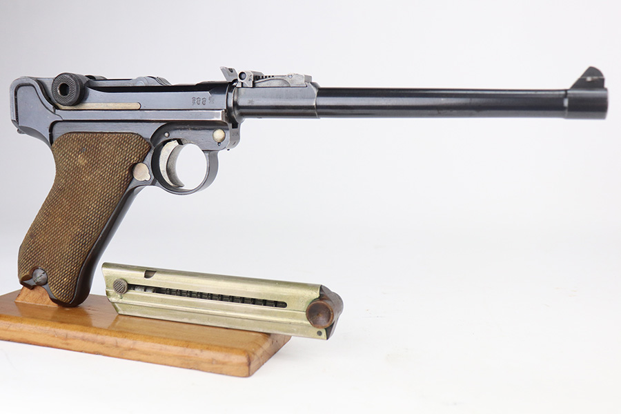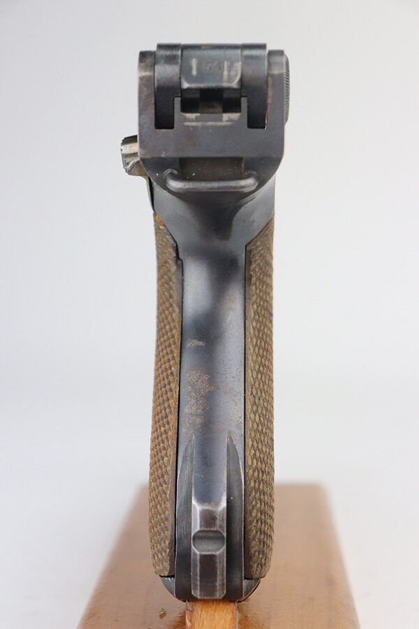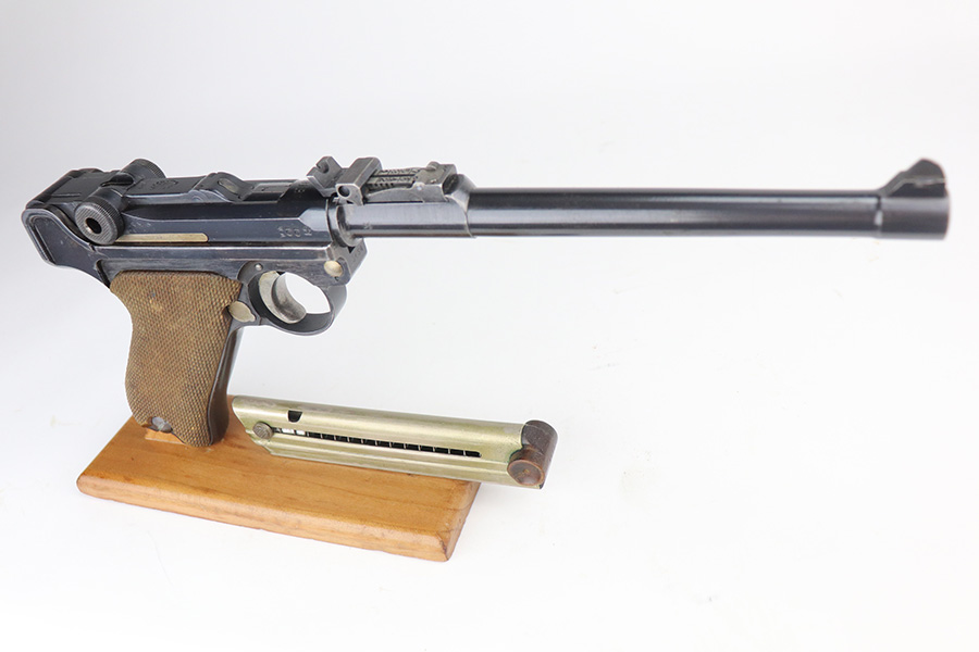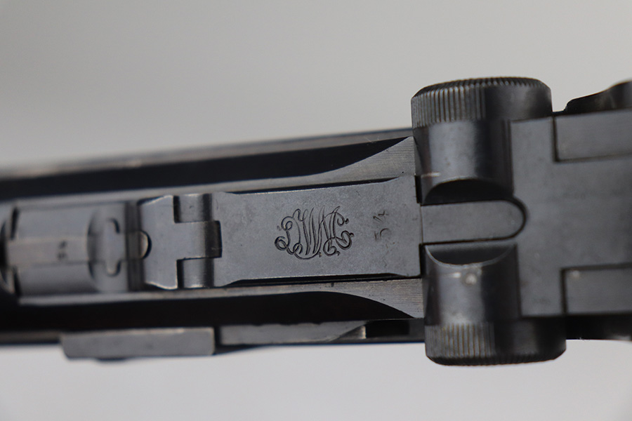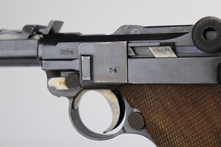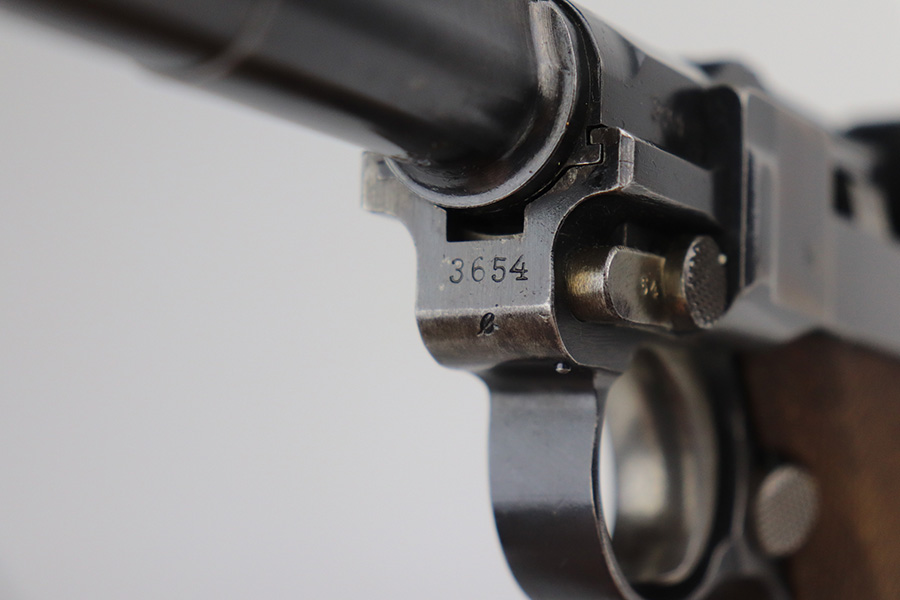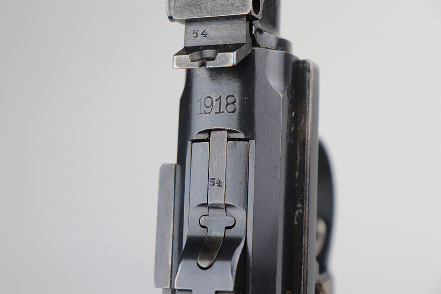 6/23/21 – This is an excellent example of an artillery luger issued to the Imperial German military in 1918, a desirable chamber date. The gun is all matching and has the proper Imperial proofs. It has retained about 96% of its original finish. There are areas of minor wear on the side plate, side rails, a few small spots on the barrel, and a little bit of spotty wear on the back strap. Areas of minor spotty oxidation here and there, most noticeable on the barrel and on the straps. Comes with excellent un-numbered grips – very small chip in the left panel. Also comes with a mismatched period-correct magazine. Mint bore.