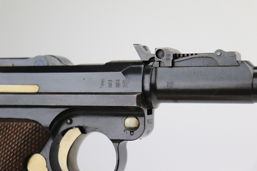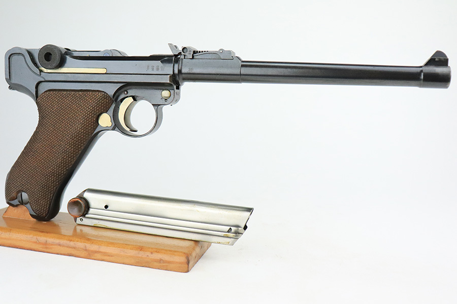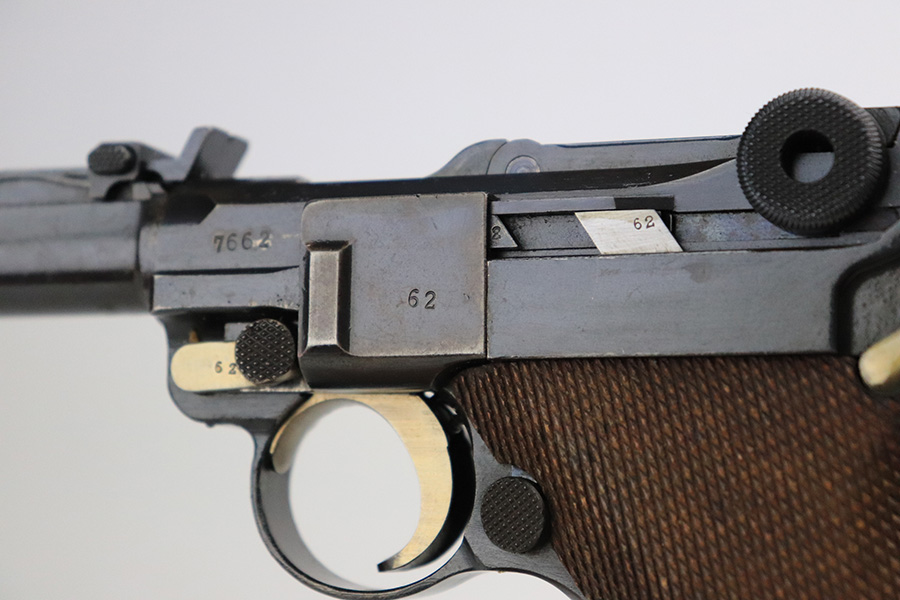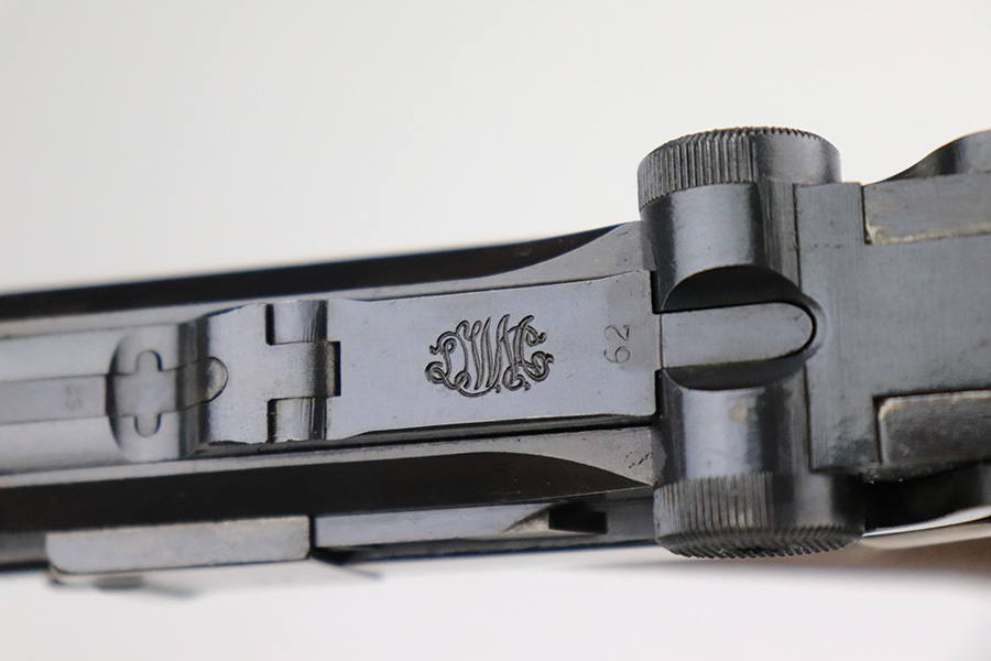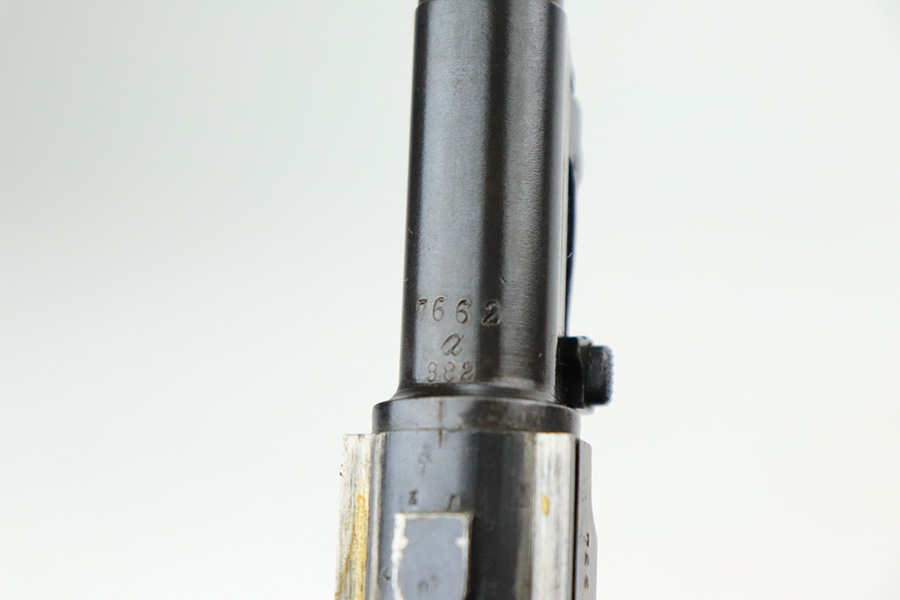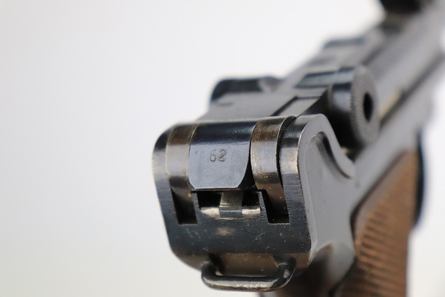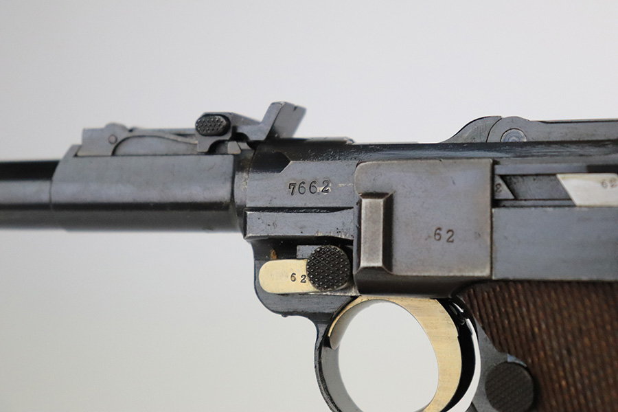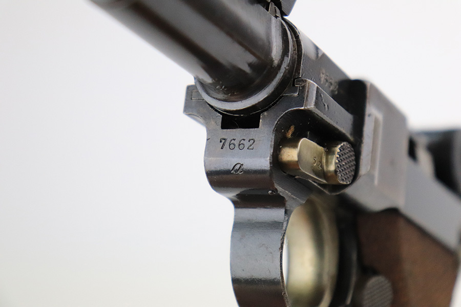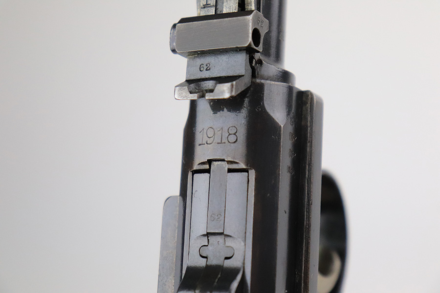 7/19/22 – This is an excellent and original DWM Artillery Luger from 1918. All numbers match, including the grips and magazine, though the magazine was renumbered post-factory. The blue rates at 95-96% with minor muzzle wear, some wear and patina on the sideplate, and a little more wear on the bottom of the front strap. Beautiful straw on the small parts. Unfortunately, the previous owner did not care for the bore as it was extremely dirty when we received it. We cleaned it but there’s still some corrosion throughout, though the rifling is still strong.