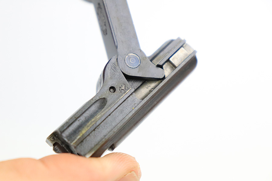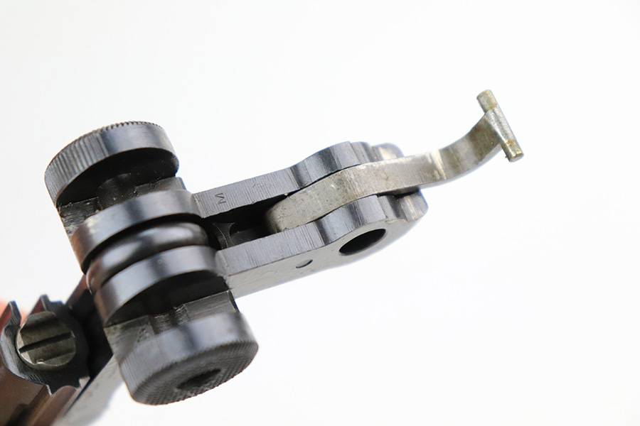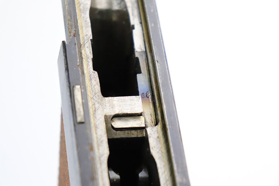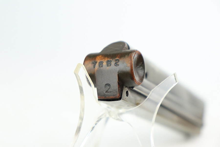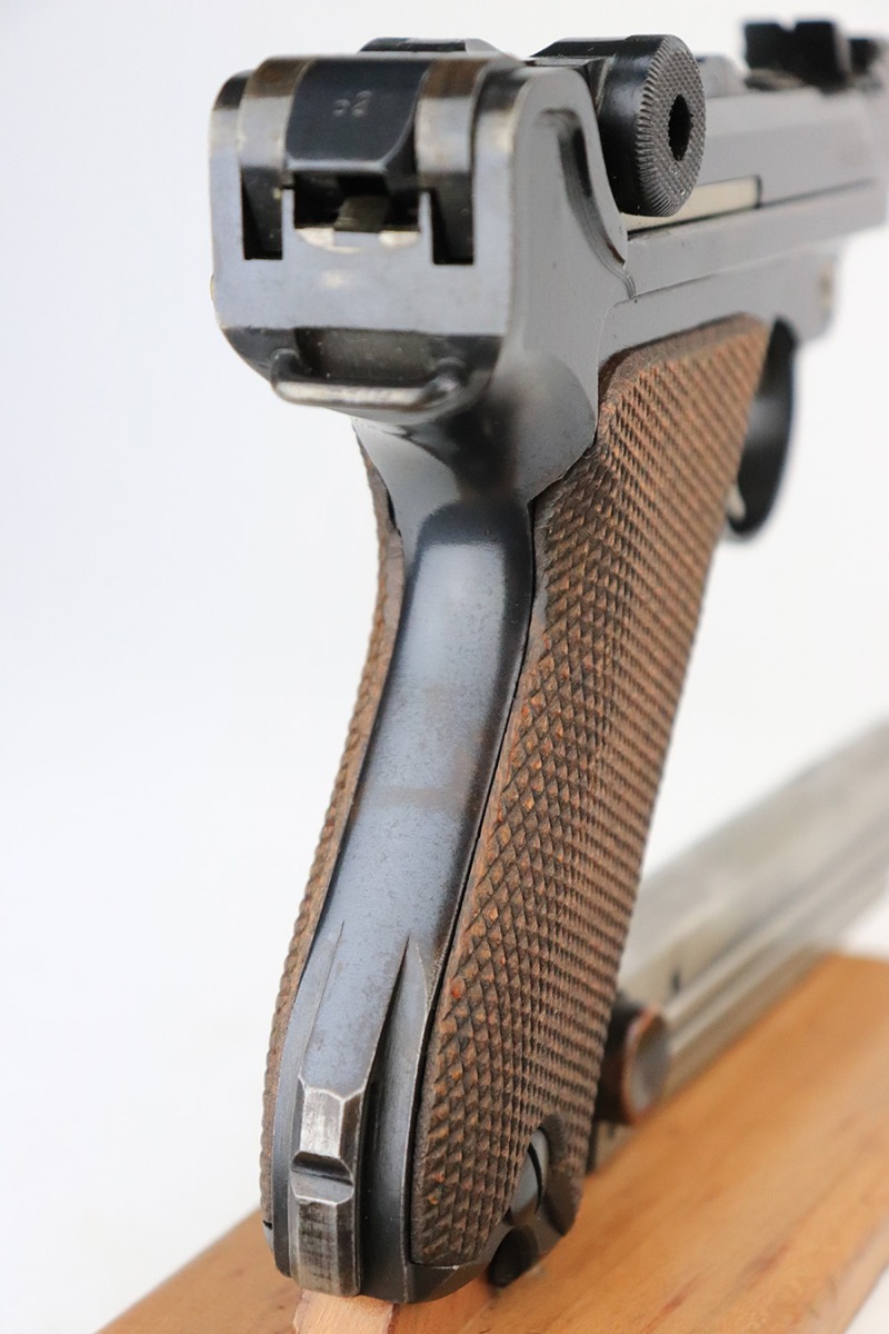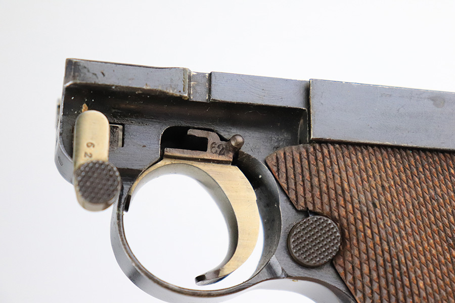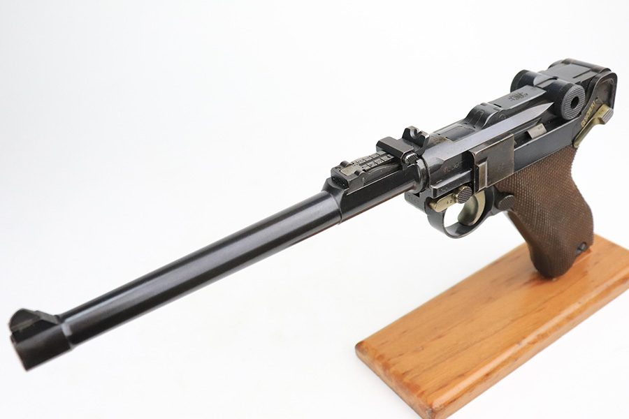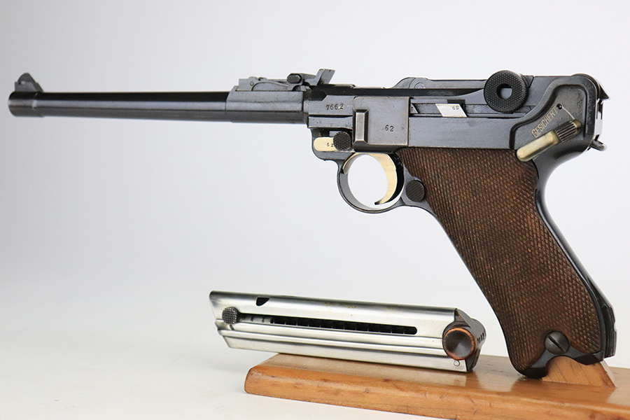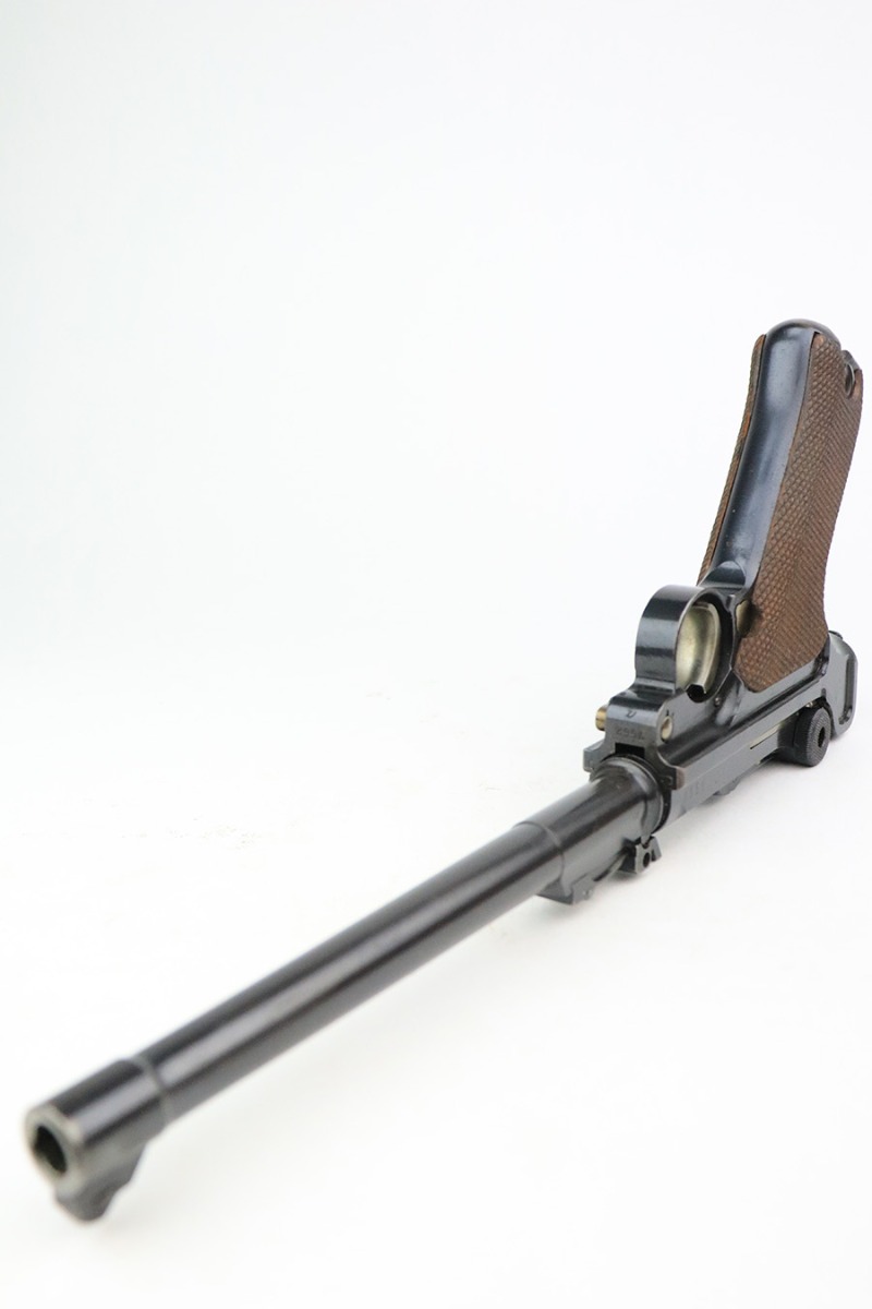7/19/22 – This is an excellent and original DWM Artillery Luger from 1918. All numbers match, including the grips and magazine, though the magazine was renumbered post-factory. The blue rates at 95-96% with minor muzzle wear, some wear and patina on the sideplate, and a little more wear on the bottom of the front strap. Beautiful straw on the small parts. Unfortunately, the previous owner did not care for the bore as it was extremely dirty when we received it. We cleaned it but there’s still some corrosion throughout, though the rifling is still strong.