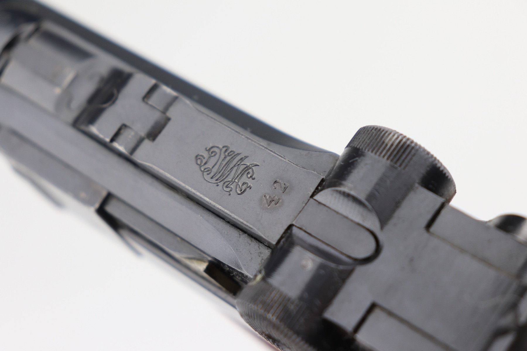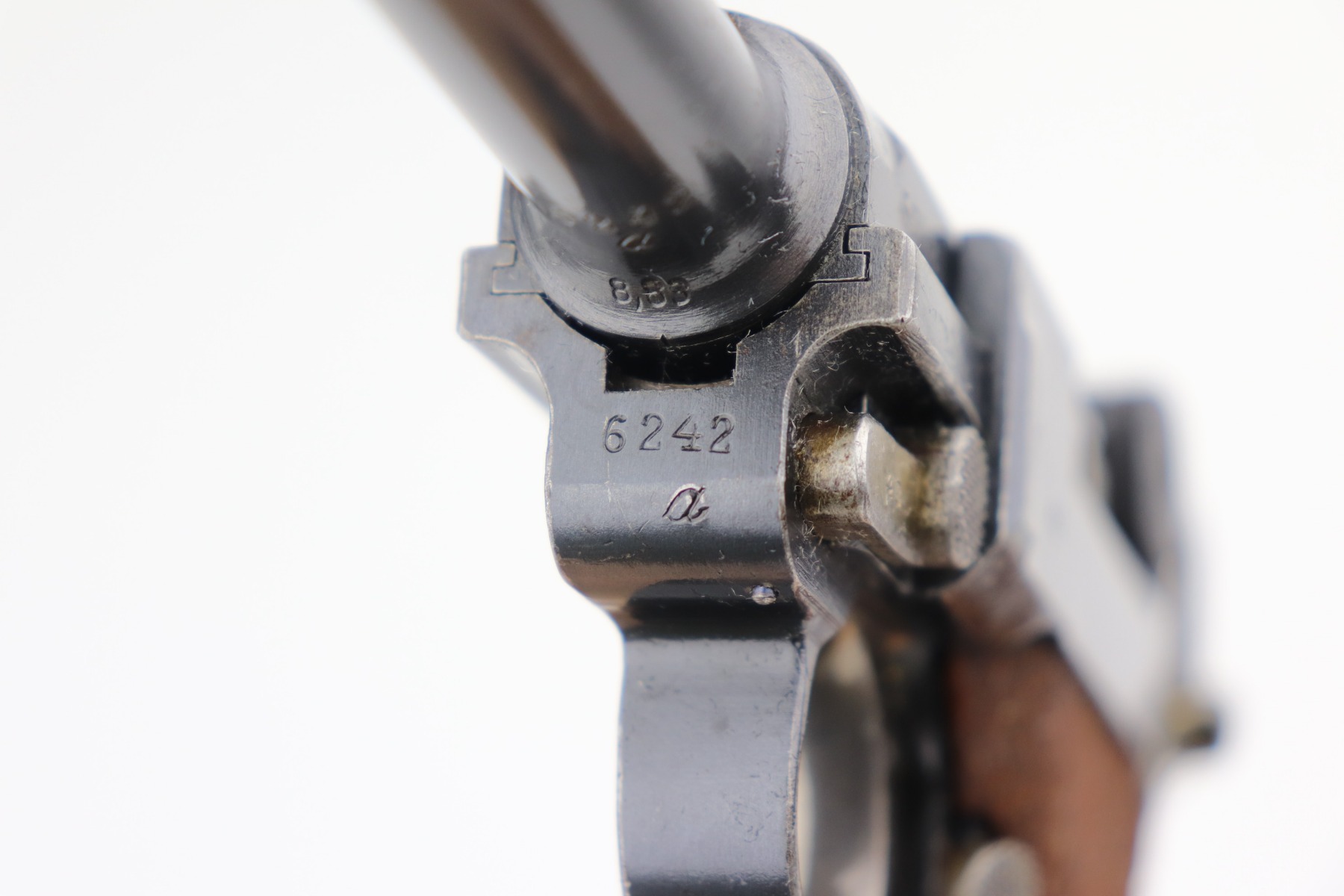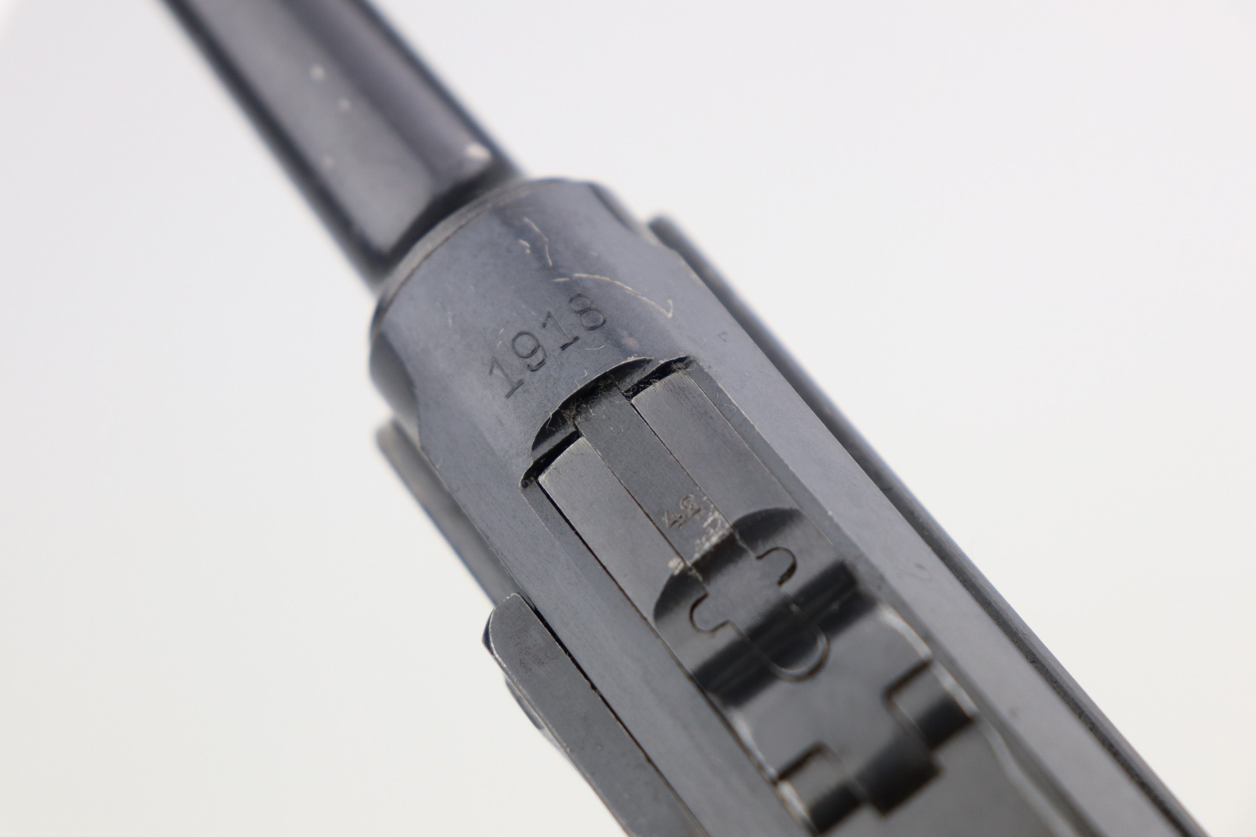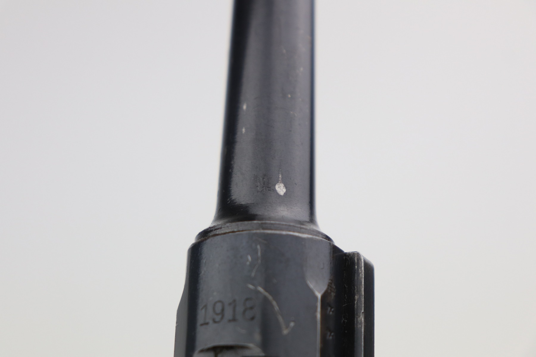 2/24/21 – This is an excellent example of a DWM Luger issued to the Imperial German army in 1918. The gun is all matching and has the proper Imperial proofs. It has retained about 95% of its original finish. Very minor wear on the side plate, high edges of the frame, and base of the front strap. There are small handling marks and scratches on the front strap, barrel, and chamber. Excellent grips. The left panel is matching, the other is un-numbered. There is a small chip in the bottom of the right panel. It comes with a mismatched period-correct magazine that is very close in number. The bore is near-mint.