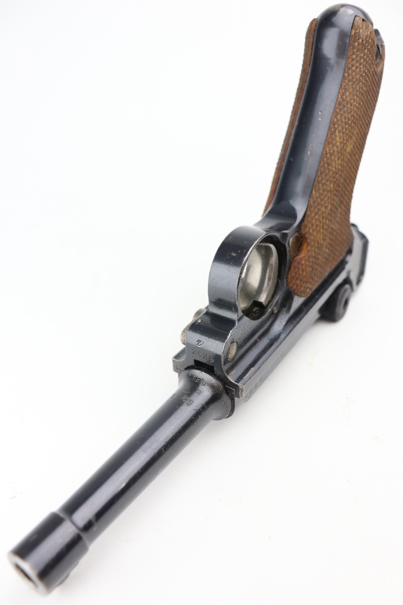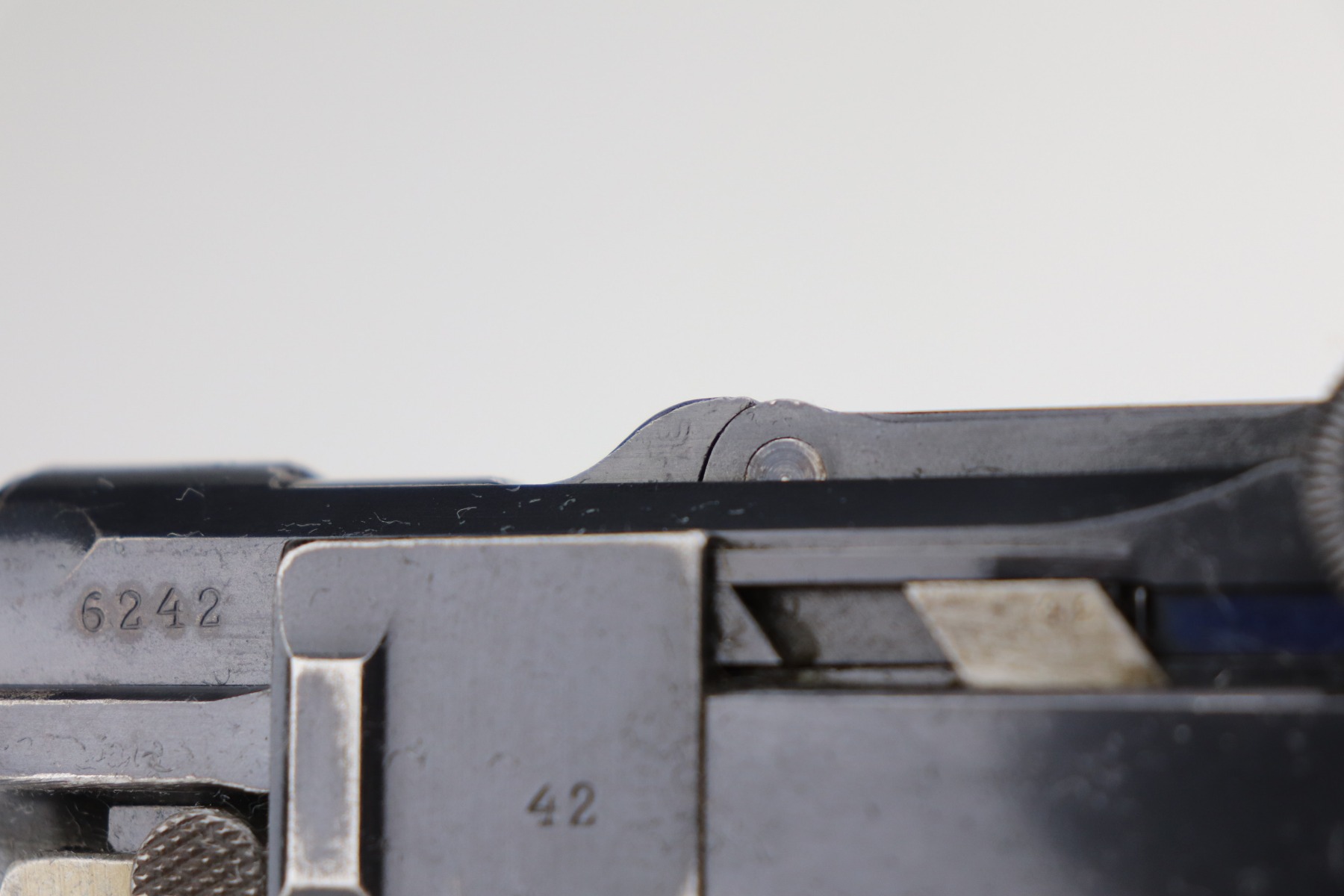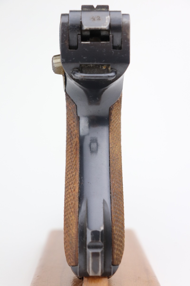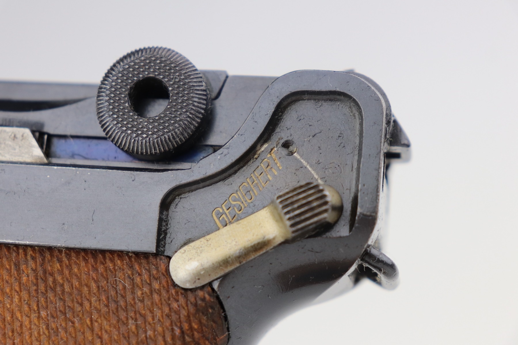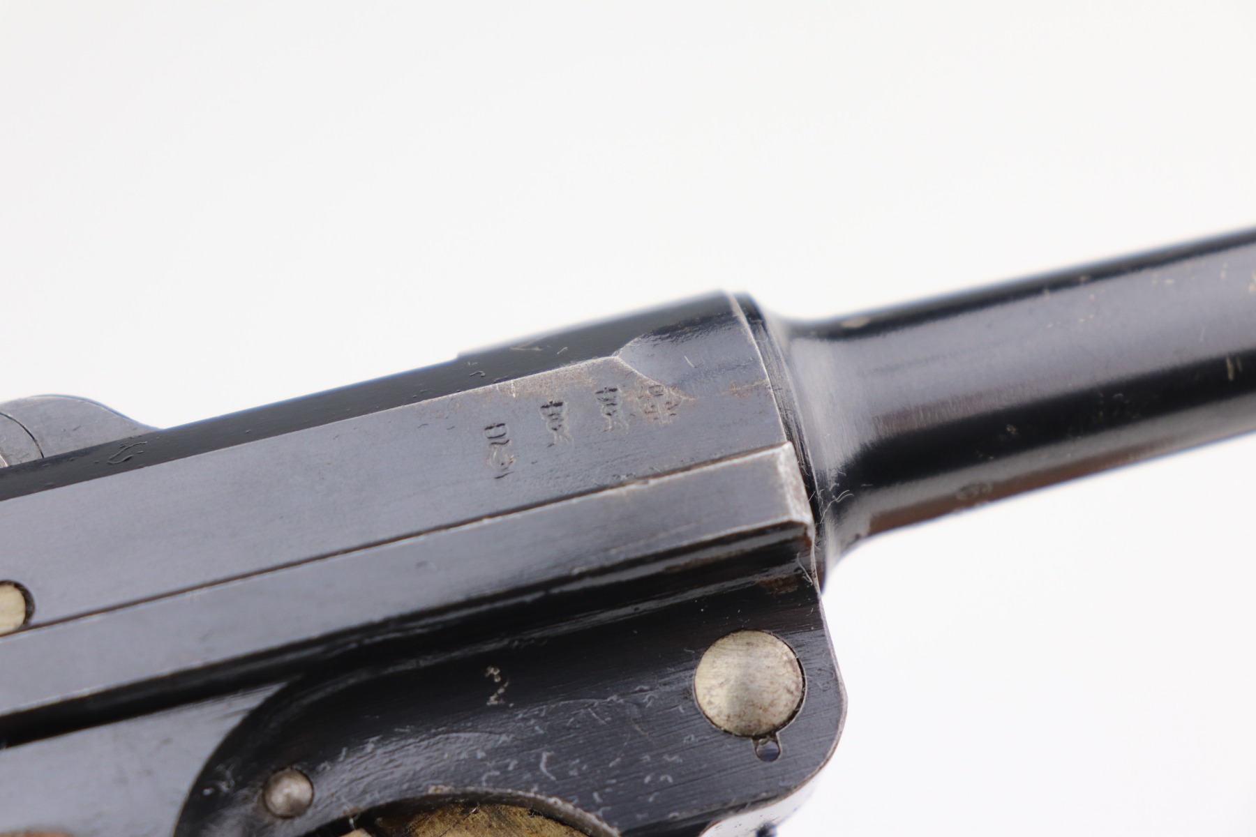 2/24/21 – This is an excellent example of a DWM Luger issued to the Imperial German army in 1918. The gun is all matching and has the proper Imperial proofs. It has retained about 95% of its original finish. Very minor wear on the side plate, high edges of the frame, and base of the front strap. There are small handling marks and scratches on the front strap, barrel, and chamber. Excellent grips. The left panel is matching, the other is un-numbered. There is a small chip in the bottom of the right panel. It comes with a mismatched period-correct magazine that is very close in number. The bore is near-mint.