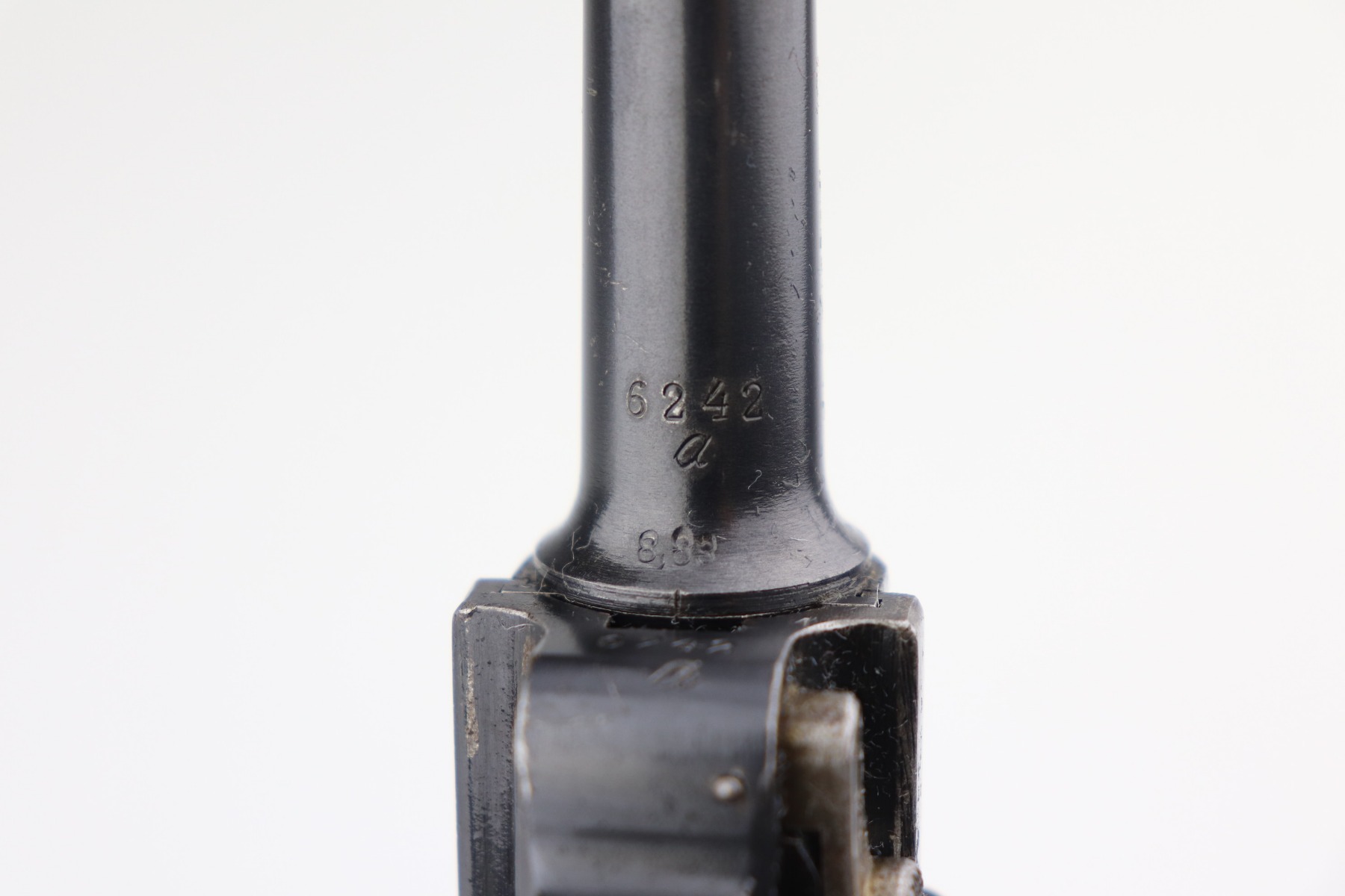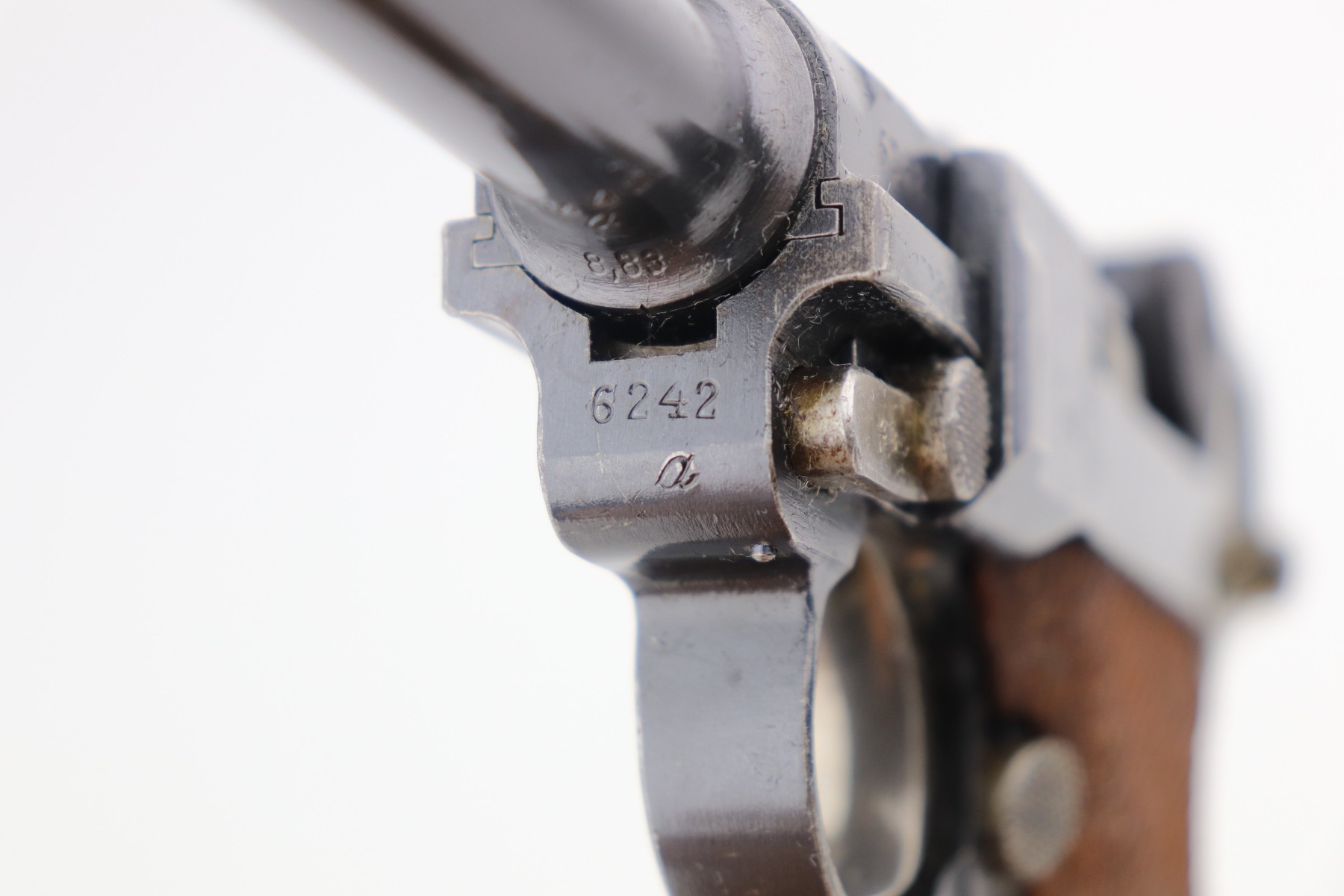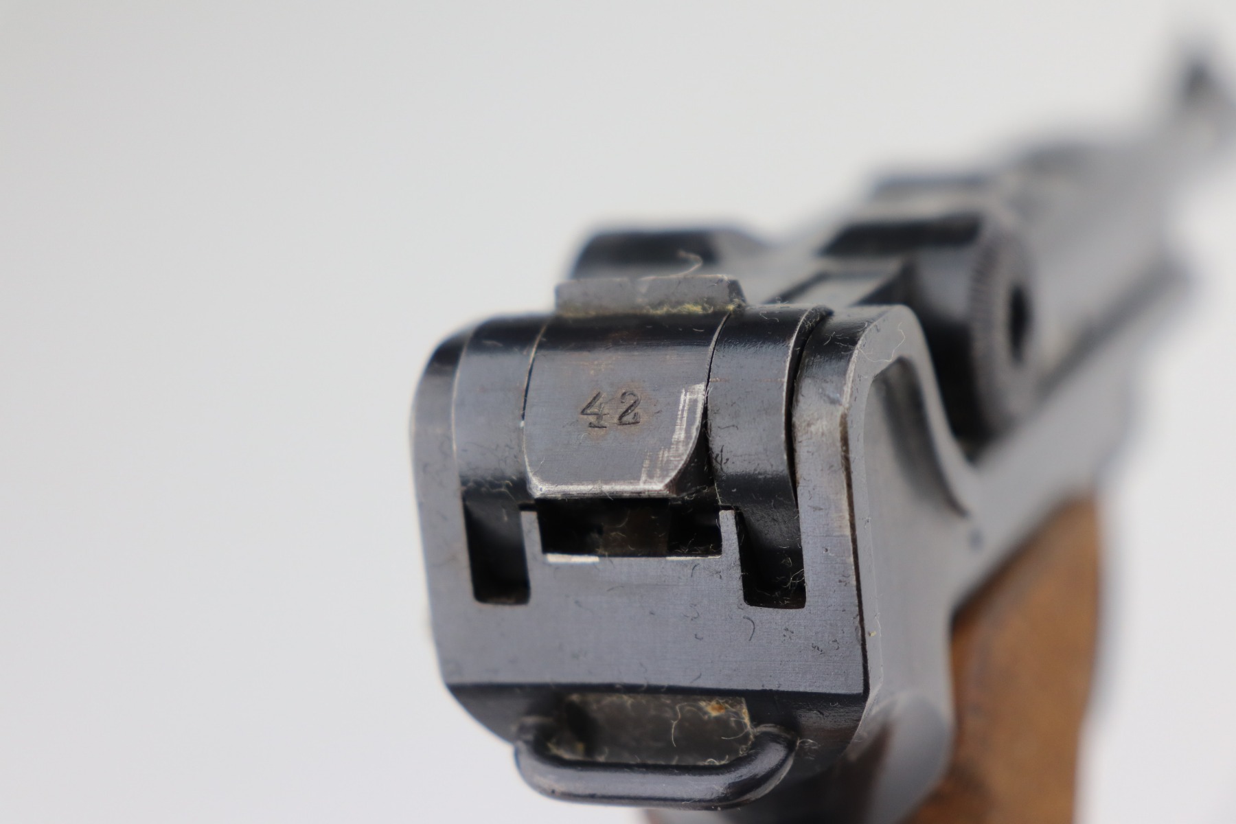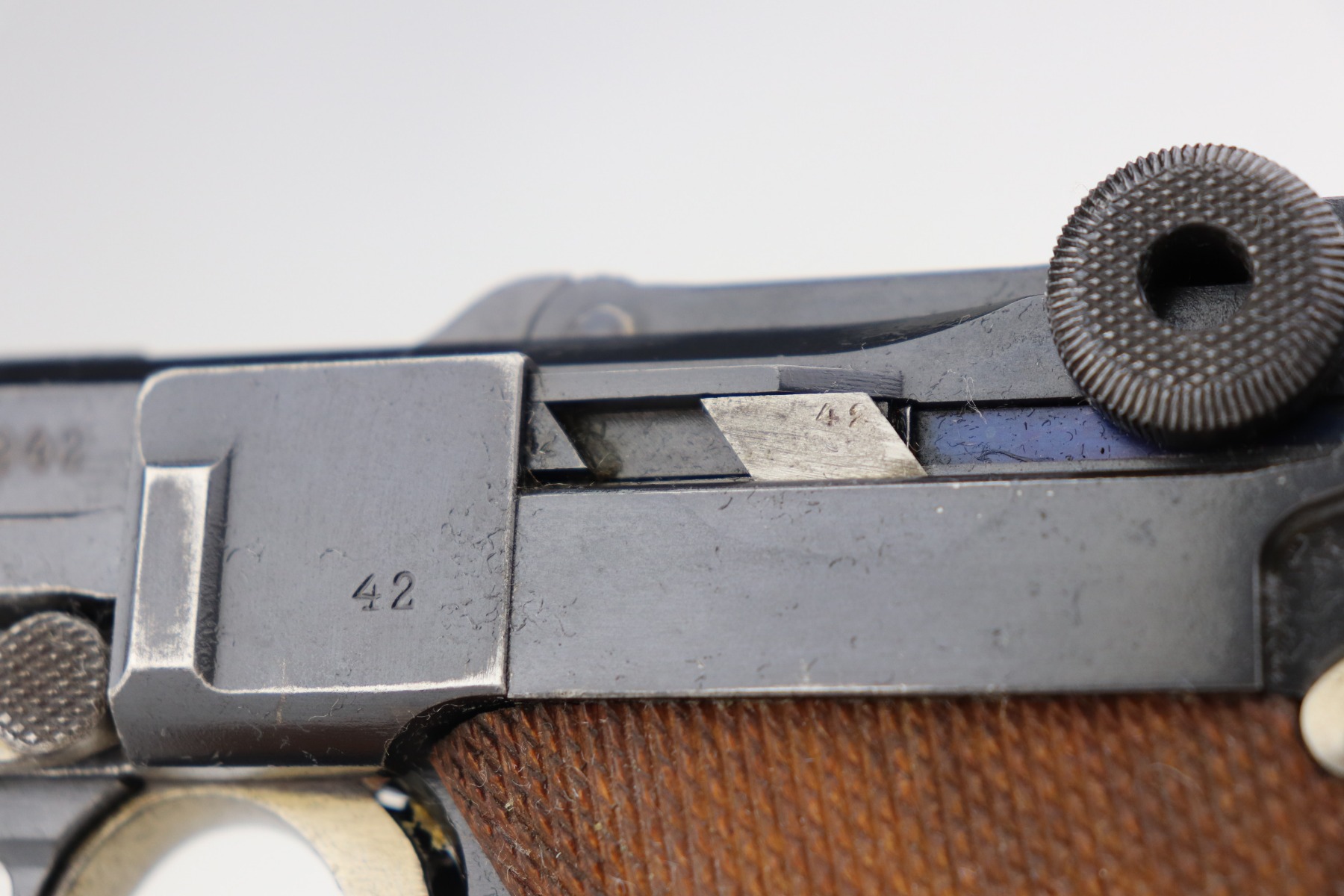 2/24/21 – This is an excellent example of a DWM Luger issued to the Imperial German army in 1918. The gun is all matching and has the proper Imperial proofs. It has retained about 95% of its original finish. Very minor wear on the side plate, high edges of the frame, and base of the front strap. There are small handling marks and scratches on the front strap, barrel, and chamber. Excellent grips. The left panel is matching, the other is un-numbered. There is a small chip in the bottom of the right panel. It comes with a mismatched period-correct magazine that is very close in number. The bore is near-mint.