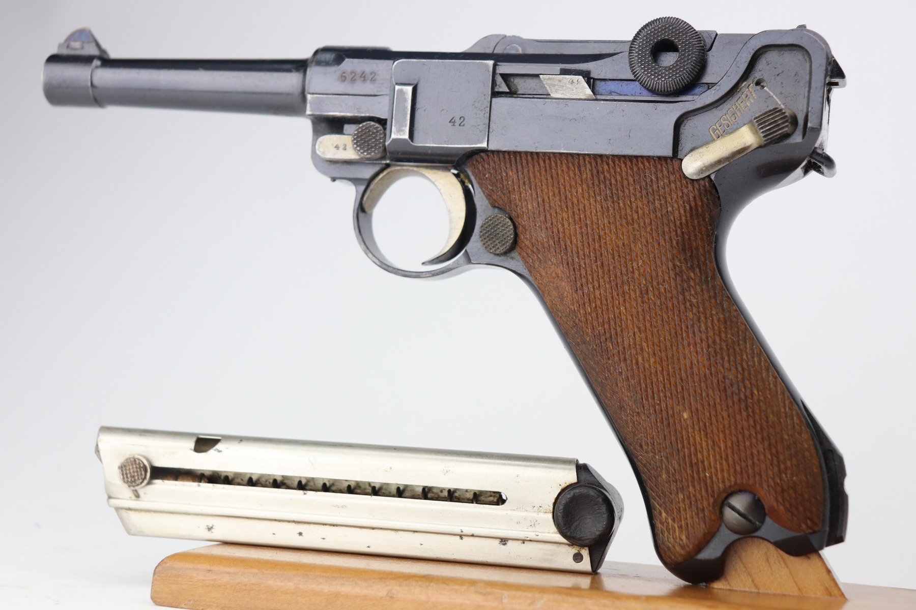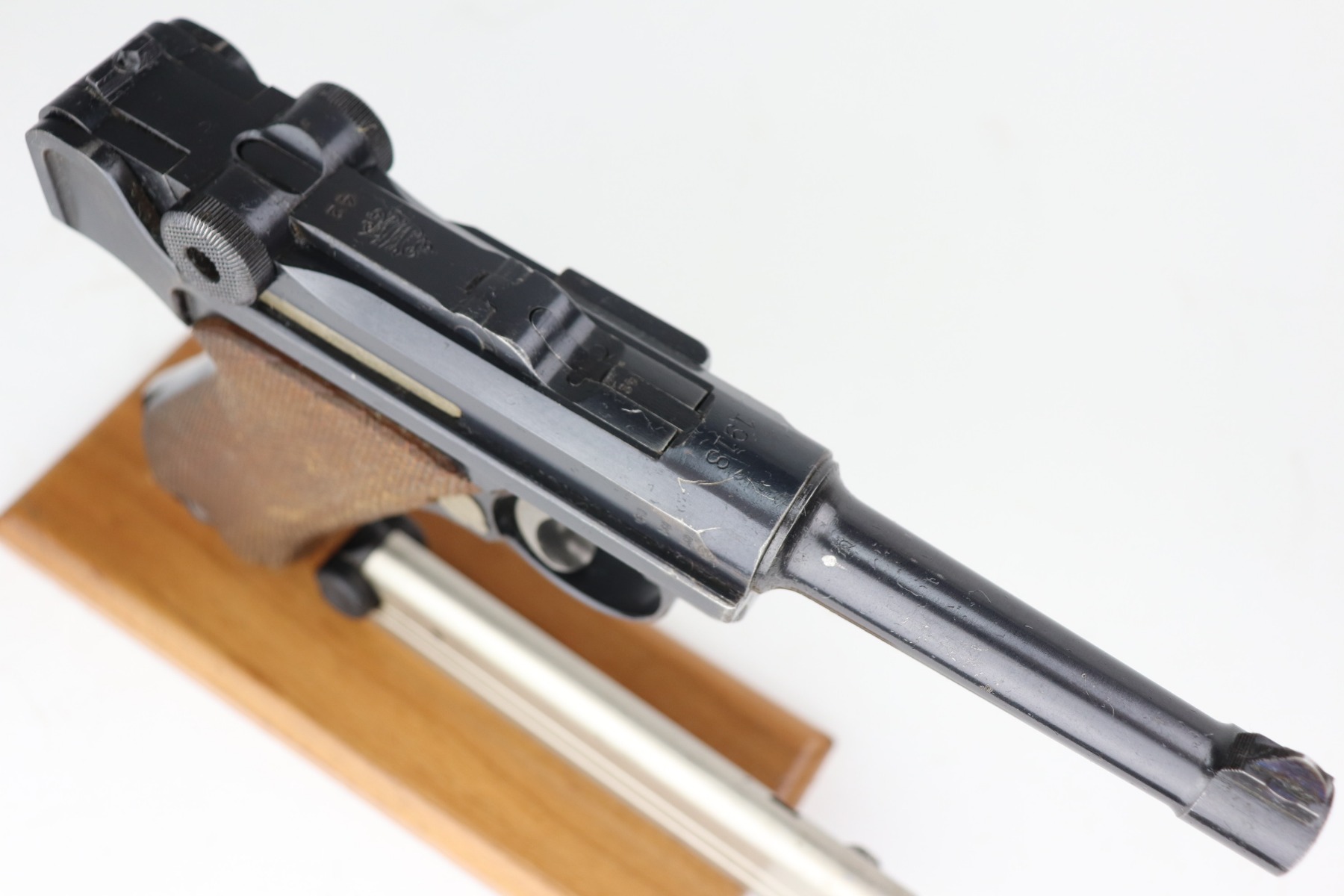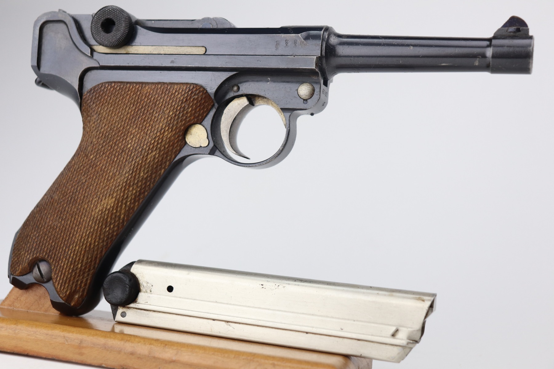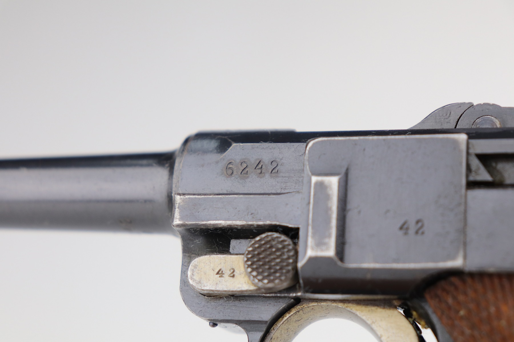 2/24/21 – This is an excellent example of a DWM Luger issued to the Imperial German army in 1918. The gun is all matching and has the proper Imperial proofs. It has retained about 95% of its original finish. Very minor wear on the side plate, high edges of the frame, and base of the front strap. There are small handling marks and scratches on the front strap, barrel, and chamber. Excellent grips. The left panel is matching, the other is un-numbered. There is a small chip in the bottom of the right panel. It comes with a mismatched period-correct magazine that is very close in number. The bore is near-mint.