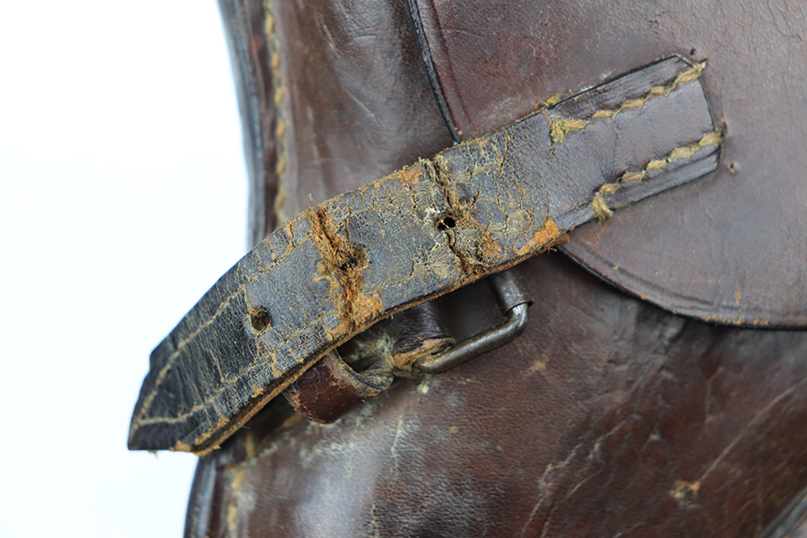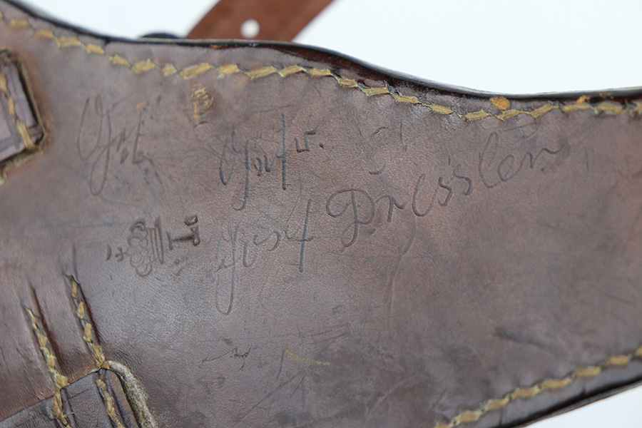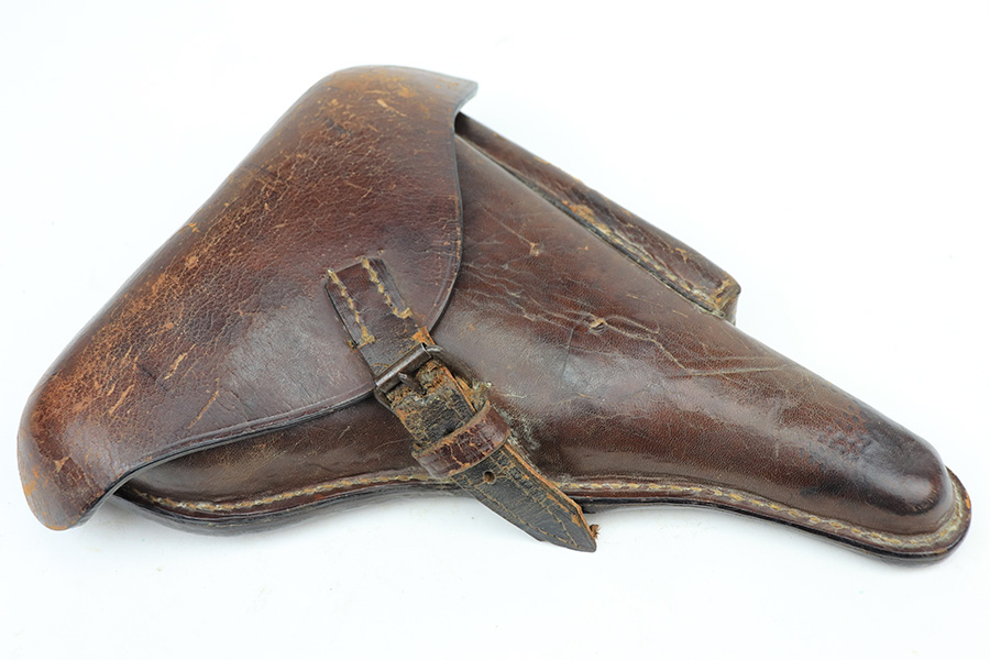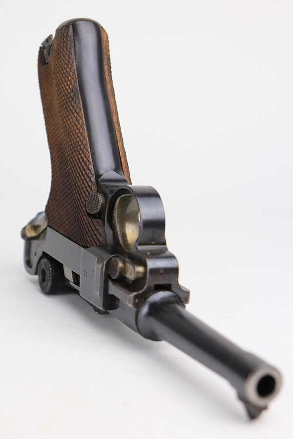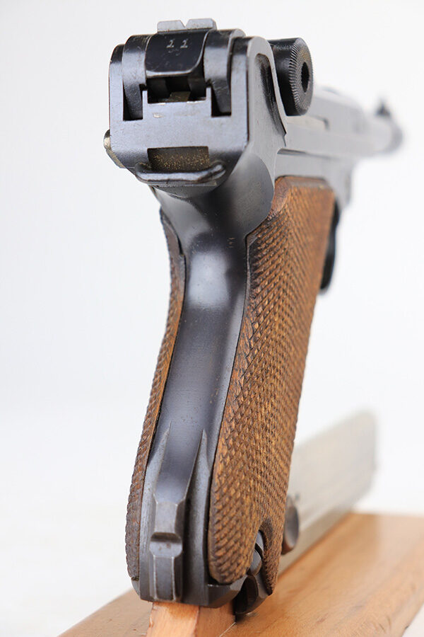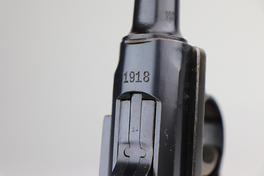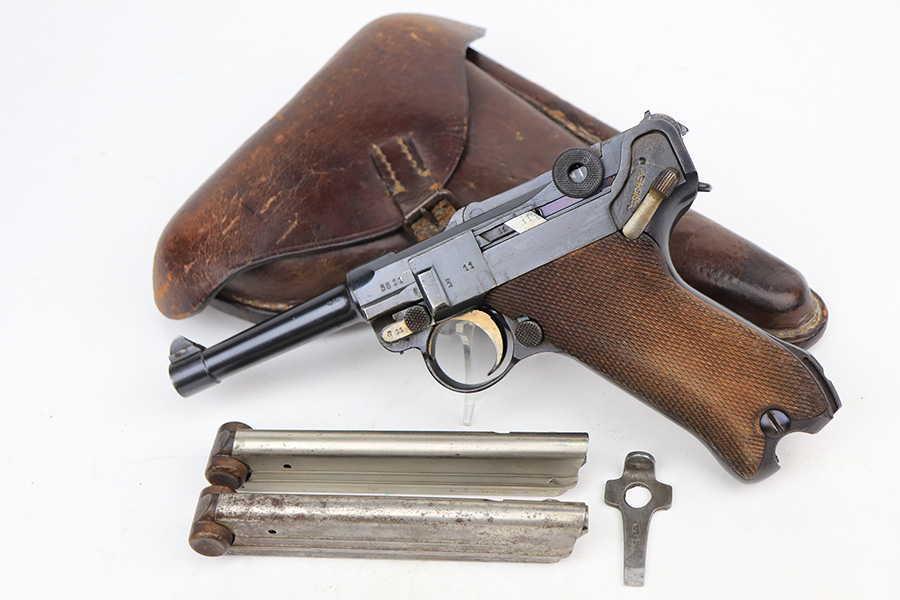 1/11/22 – This is an excellent example of an Erfurt Luger issued to the Imperial German military in 1918. The gun is all matching, has Erfurt proofs throughout, and has the proper Imperial German acceptance markings on the right side of the slide. There are small “Crown RC” markings on many of the parts. The gun comes as a rig with a 1918-dated Imperial-proofed holster, Imperial Luger tool, and two mismatched but period-correct wood bottom magazines. There is light cracking in the leather throughout, the closure strap is a little weak, and the lift strap is missing. The gun has retained about 97% of its original finish. There is just very minor wear on the side plate and side rails. Tiny dots of freckling on both grip straps. There is a very small area of minor discoloration on the side plate and a couple of very light scratches on the left side of the frame. Comes with excellent matching-numbered Imperial-proofed wood grips. The bore is mint. NOTE: The hold-open does not work properly but does work if you manually push up on the mag bottoms.