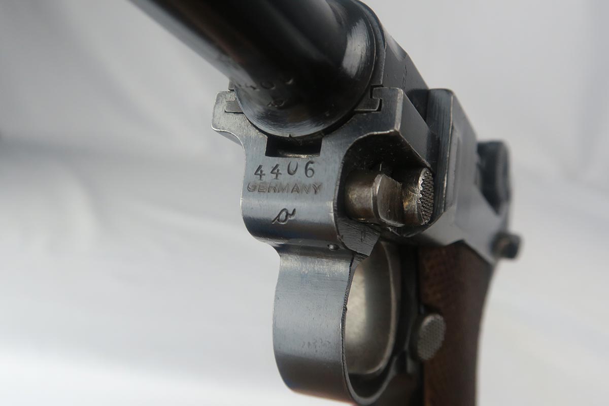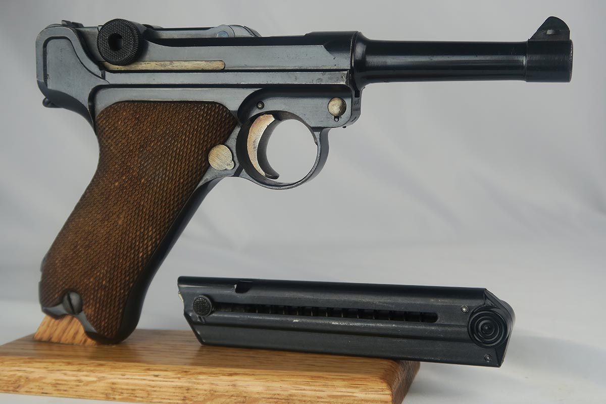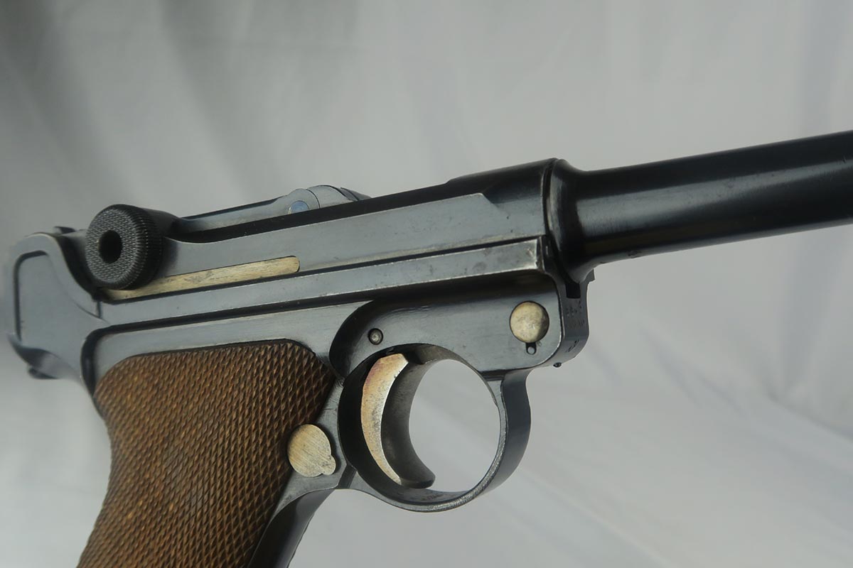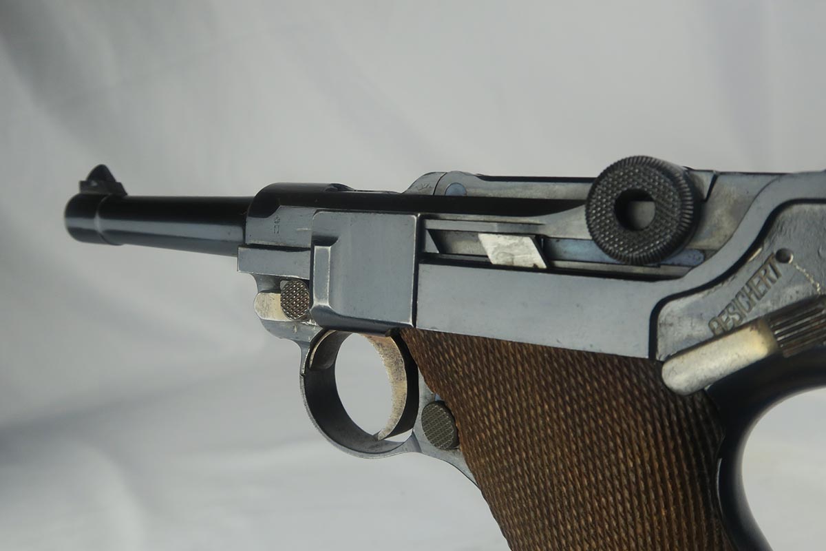 9/6/17 – This is an excellent commercial luger manufactured by DWM.  It is all original and correct with about 98+% bluing remaining.  The only finish loss is found on high edges, like the muzzle and sideplate.  The grips are unmarked but fit perfectly and appear original to the gun.  All small parts are matching.  Postwar magazine.  Minty bore.