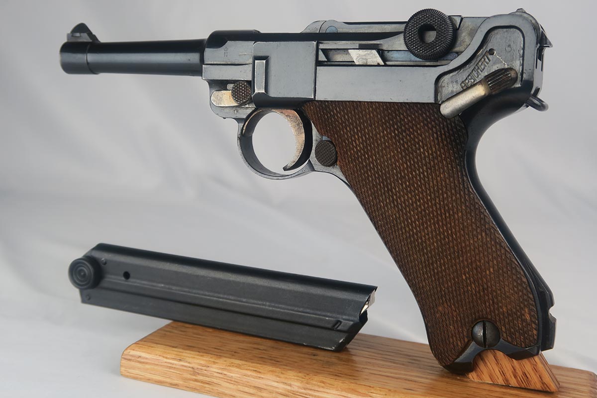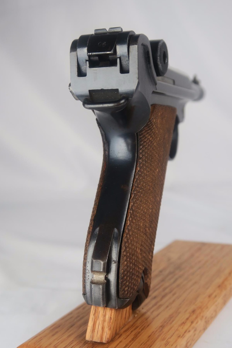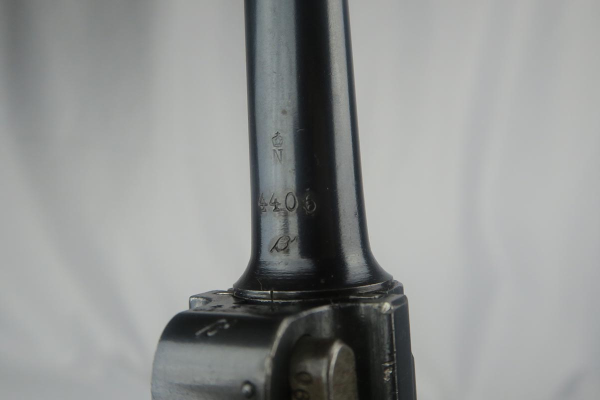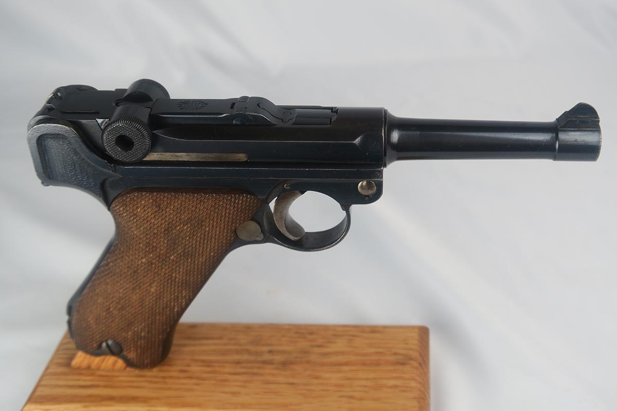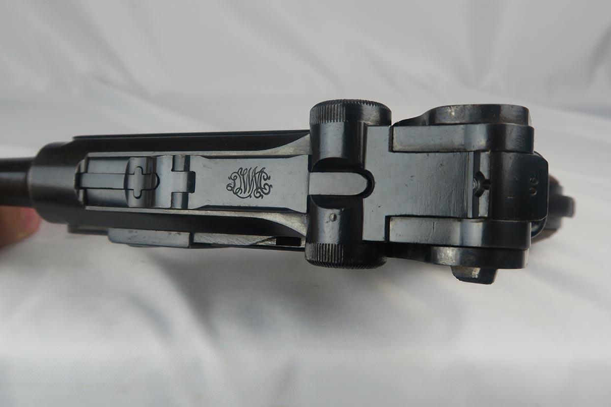 9/6/17 – This is an excellent commercial luger manufactured by DWM.  It is all original and correct with about 98+% bluing remaining.  The only finish loss is found on high edges, like the muzzle and sideplate.  The grips are unmarked but fit perfectly and appear original to the gun.  All small parts are matching.  Postwar magazine.  Minty bore.