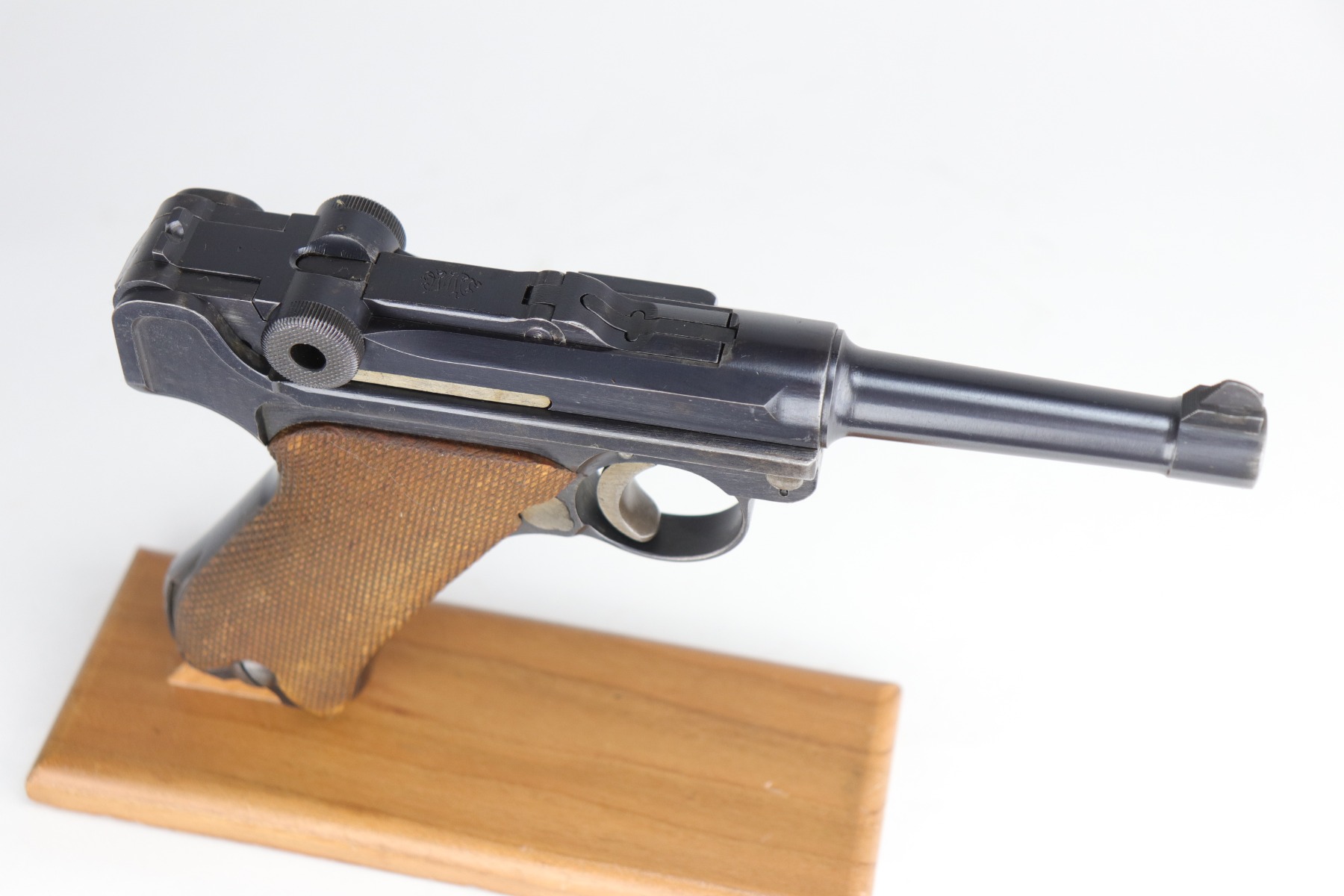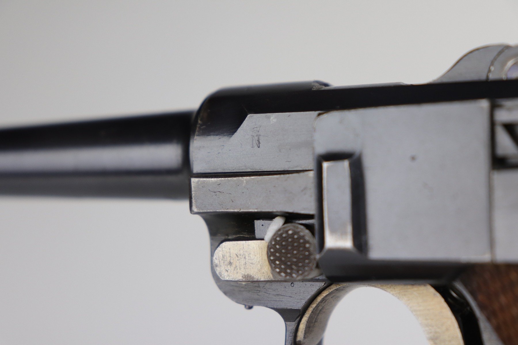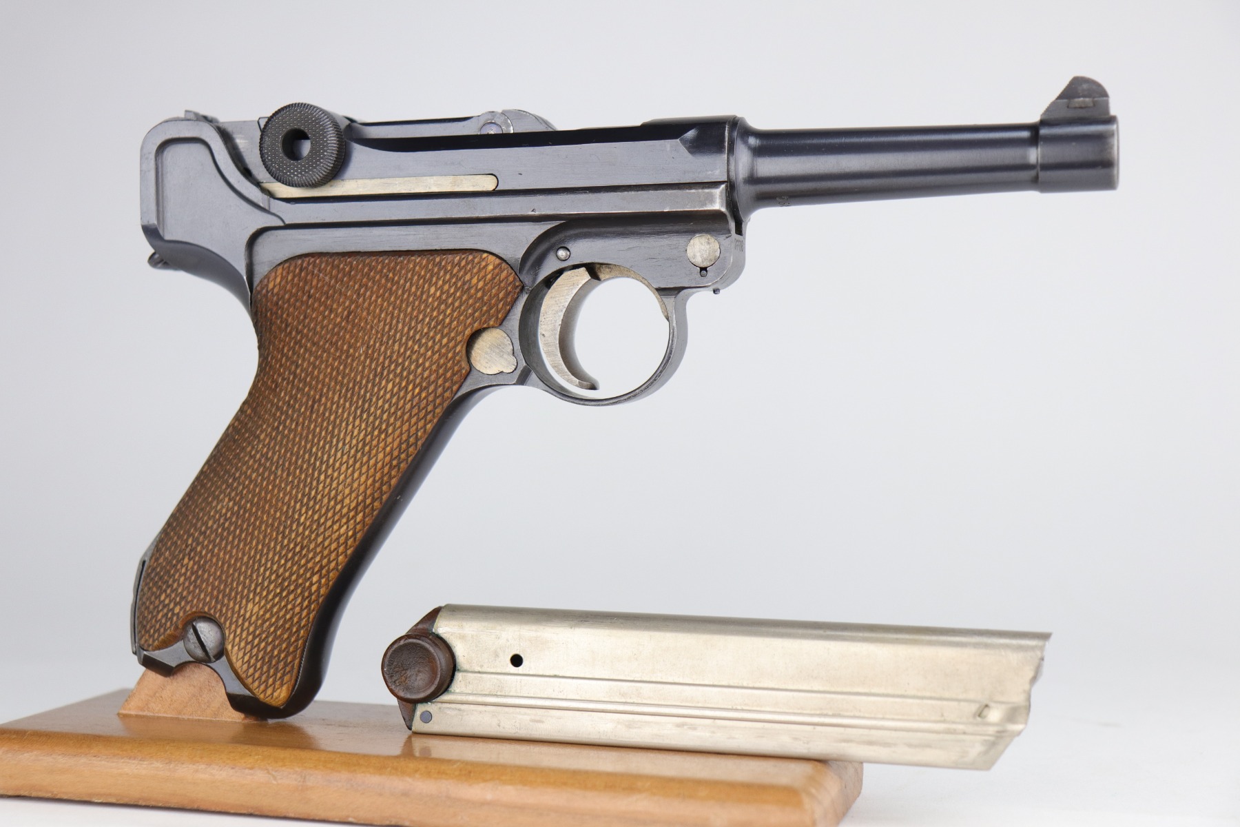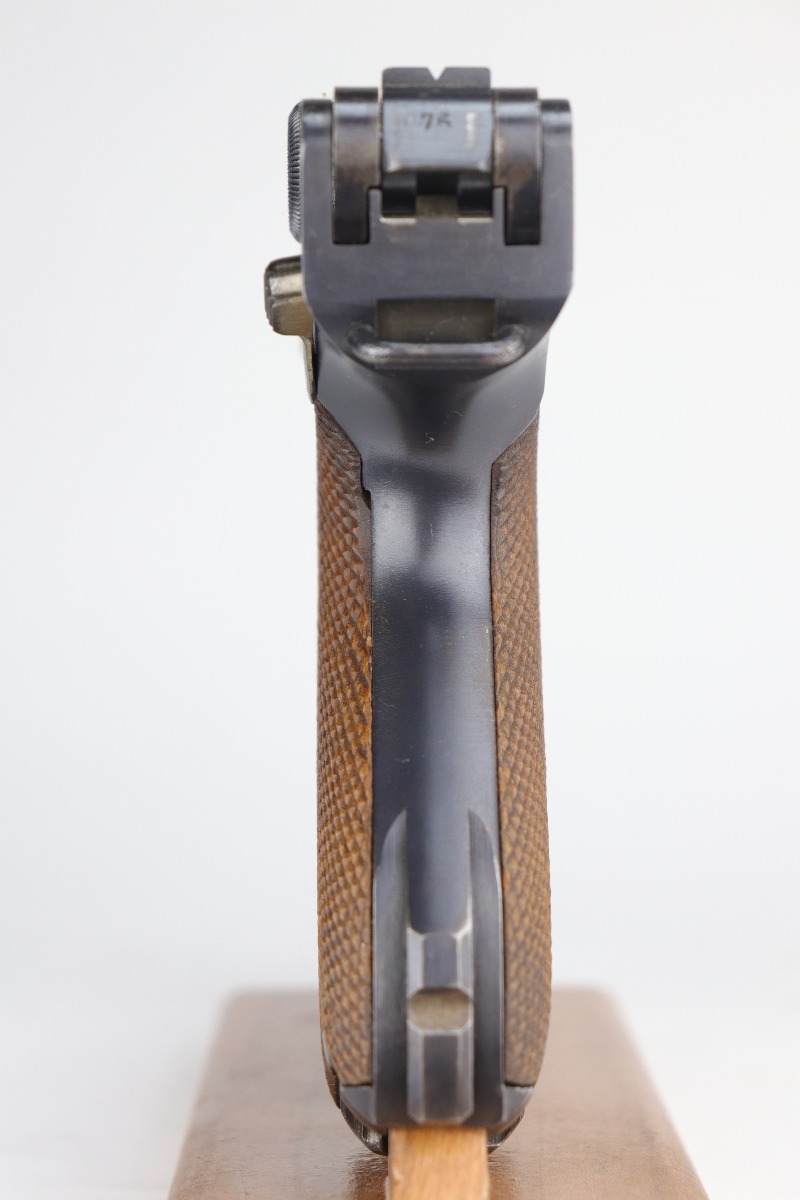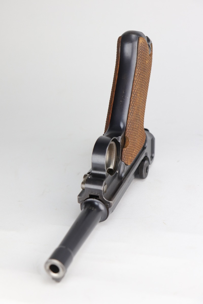 8/26/20 – This is an excellent, original 1920’s commercial DWM Luger, chambered in .30 Luger. There is no date on the chamber. Very faint Germany export mark on the underside of the barrel. The gun is “Crown N” proofed. It comes with excellent, period-correct grips and wood-bottom magazine. The magazine is numbered. It would have left the factory blank and was numbered (in the 1920’s) to match the gun. The pistol is in excellent condition, retaining about 98% of its original finish. There is very minor high edge wear on the frame and side plate and a few small marks on the front strap and on the toggle. The bore is shiny with strong rifling.