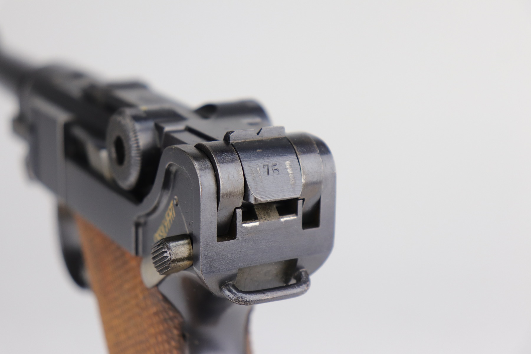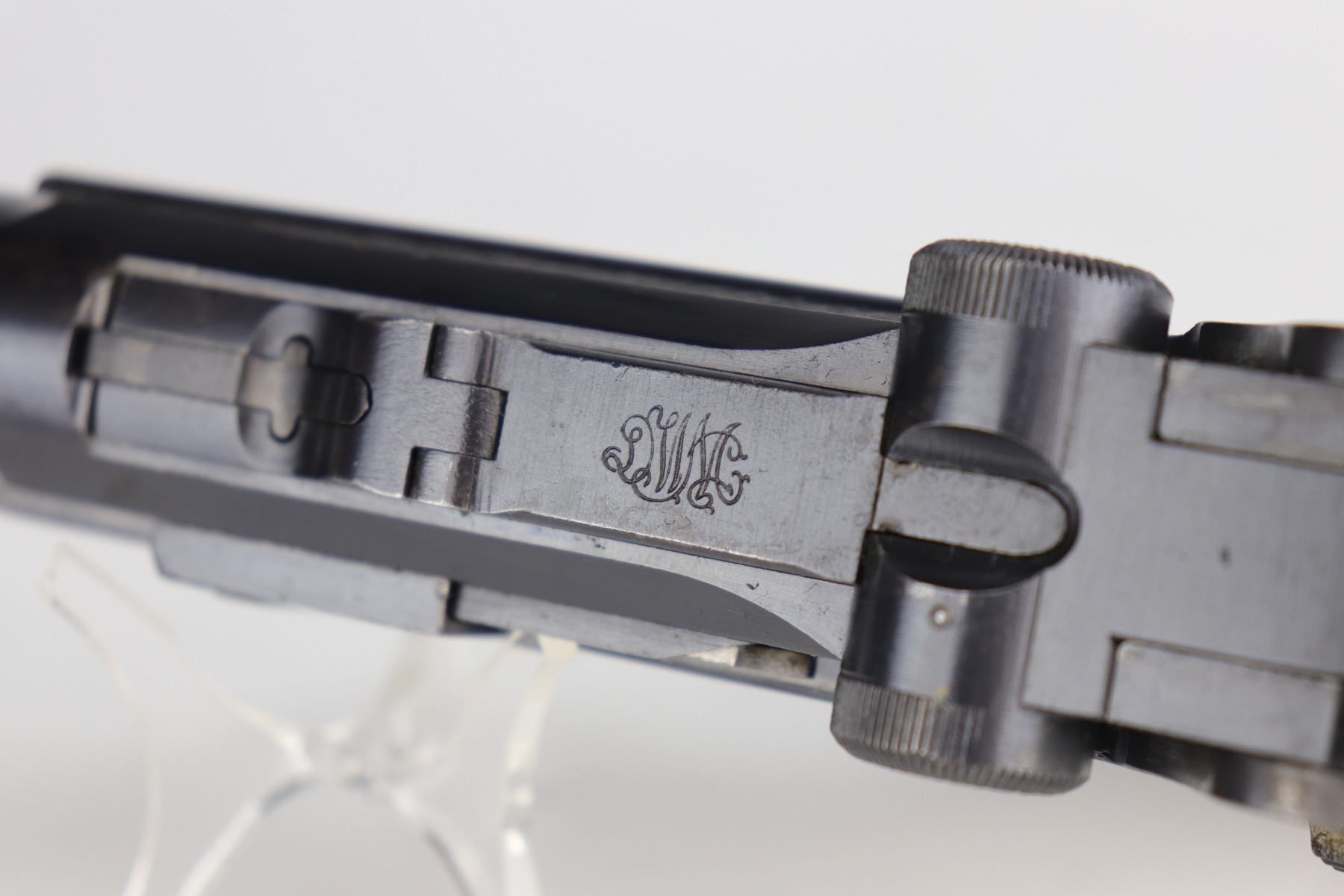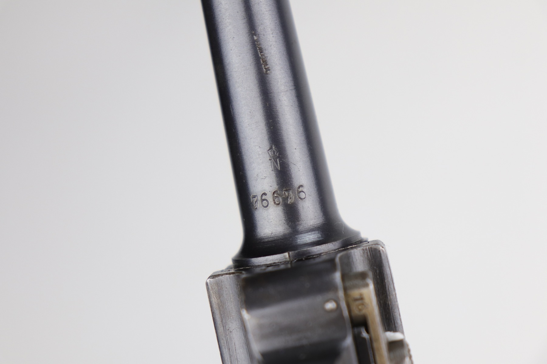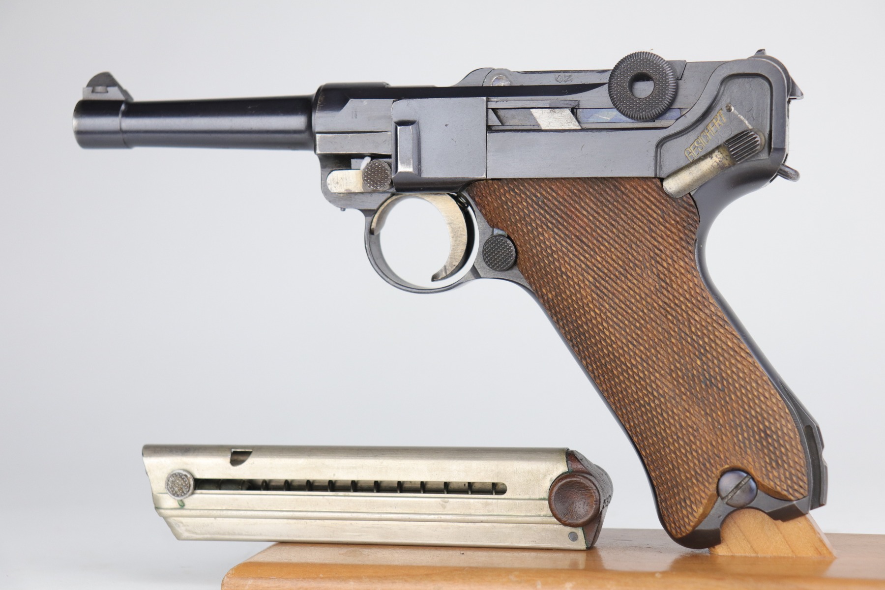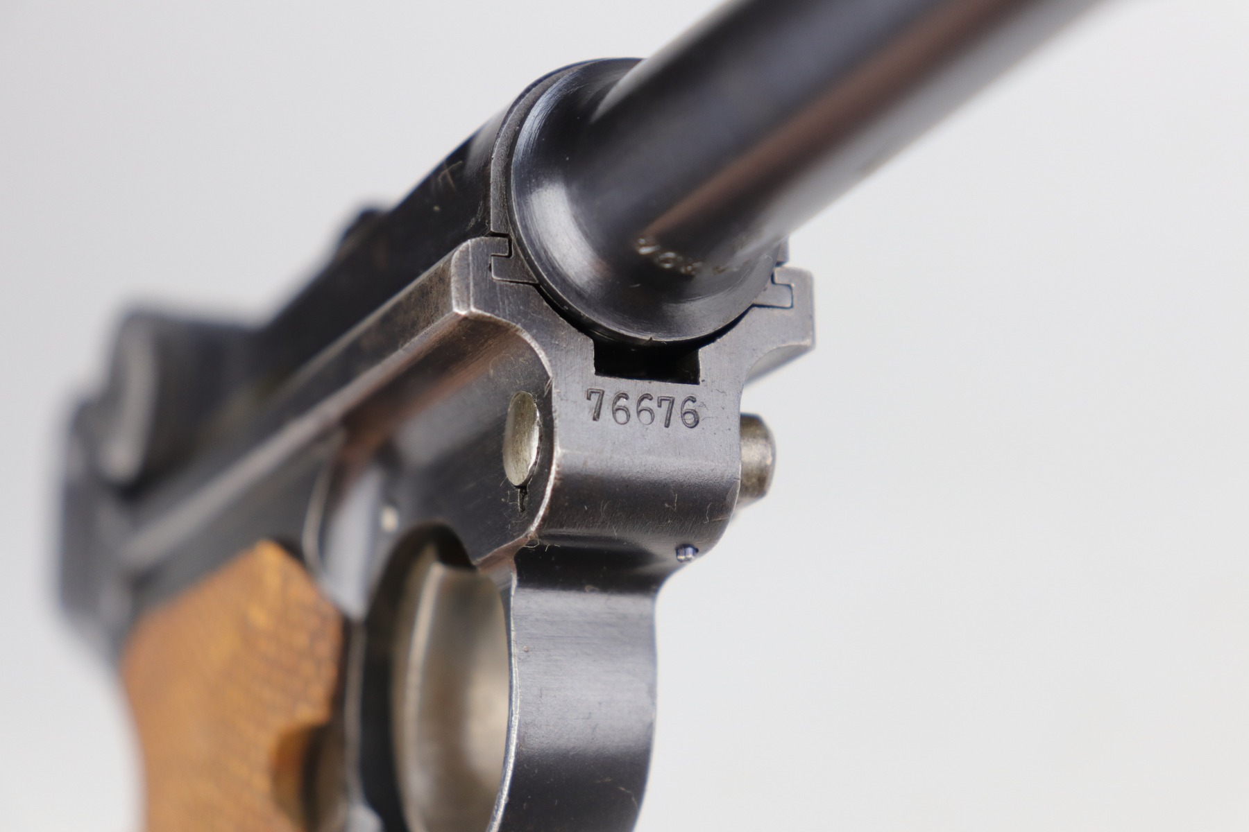 8/26/20 – This is an excellent, original 1920’s commercial DWM Luger, chambered in .30 Luger. There is no date on the chamber. Very faint Germany export mark on the underside of the barrel. The gun is “Crown N” proofed. It comes with excellent, period-correct grips and wood-bottom magazine. The magazine is numbered. It would have left the factory blank and was numbered (in the 1920’s) to match the gun. The pistol is in excellent condition, retaining about 98% of its original finish. There is very minor high edge wear on the frame and side plate and a few small marks on the front strap and on the toggle. The bore is shiny with strong rifling.