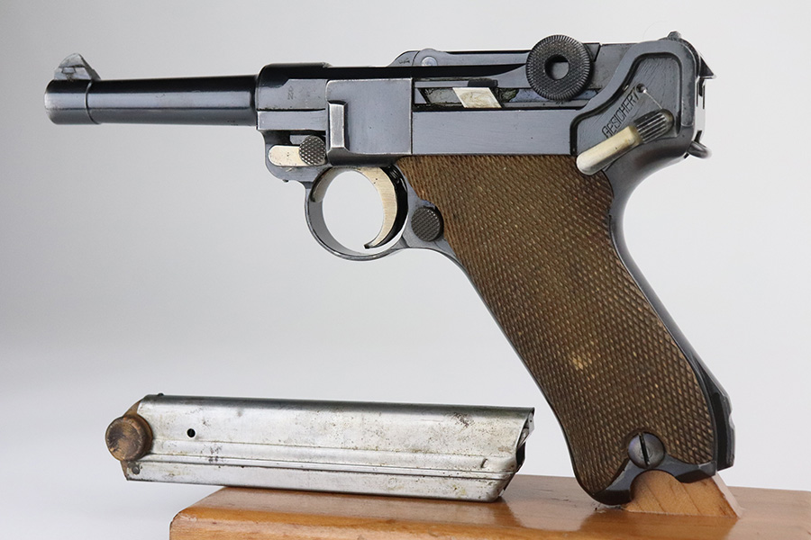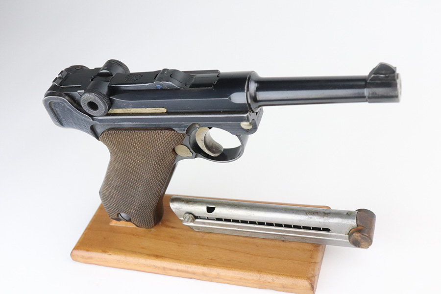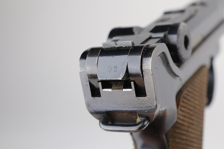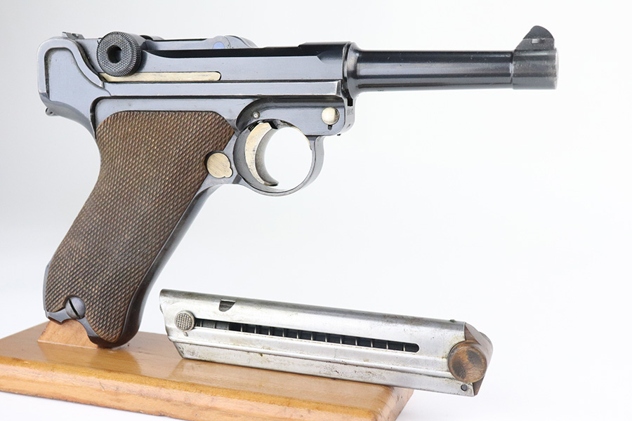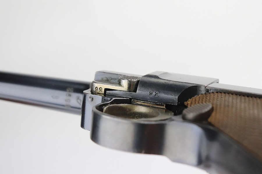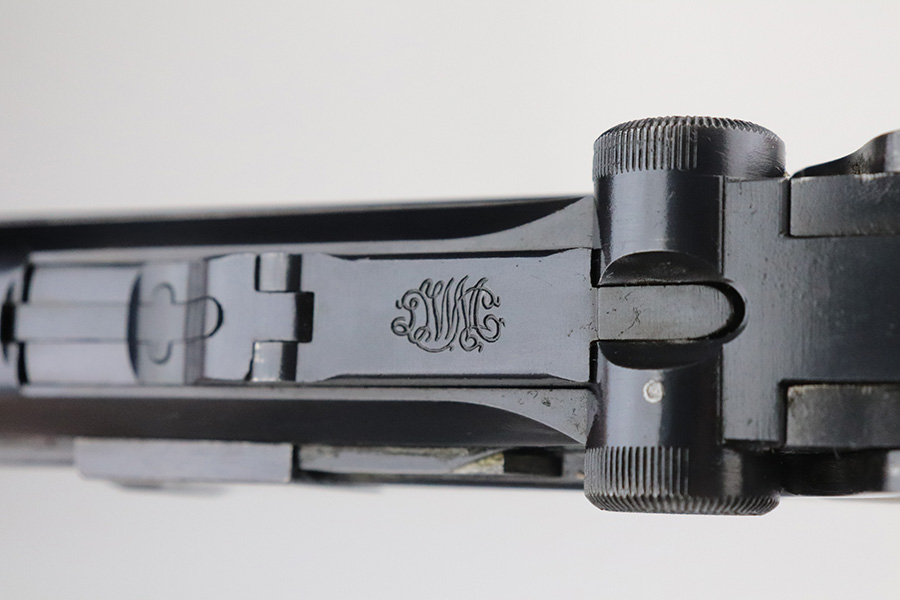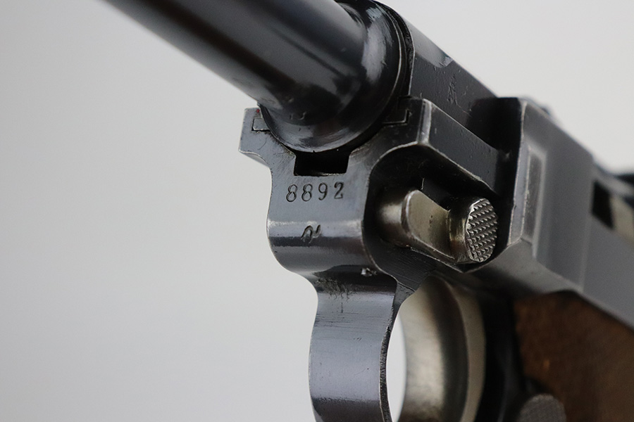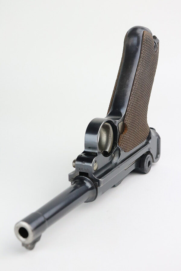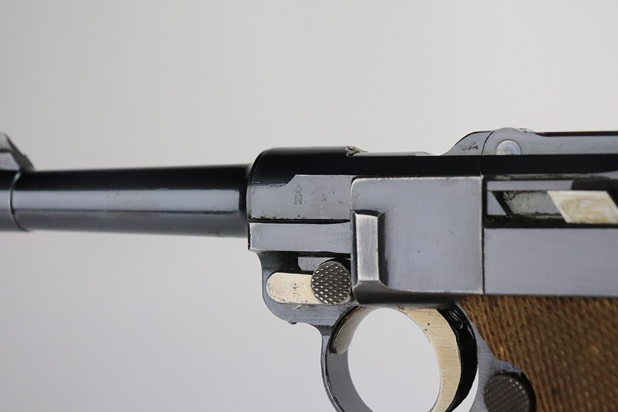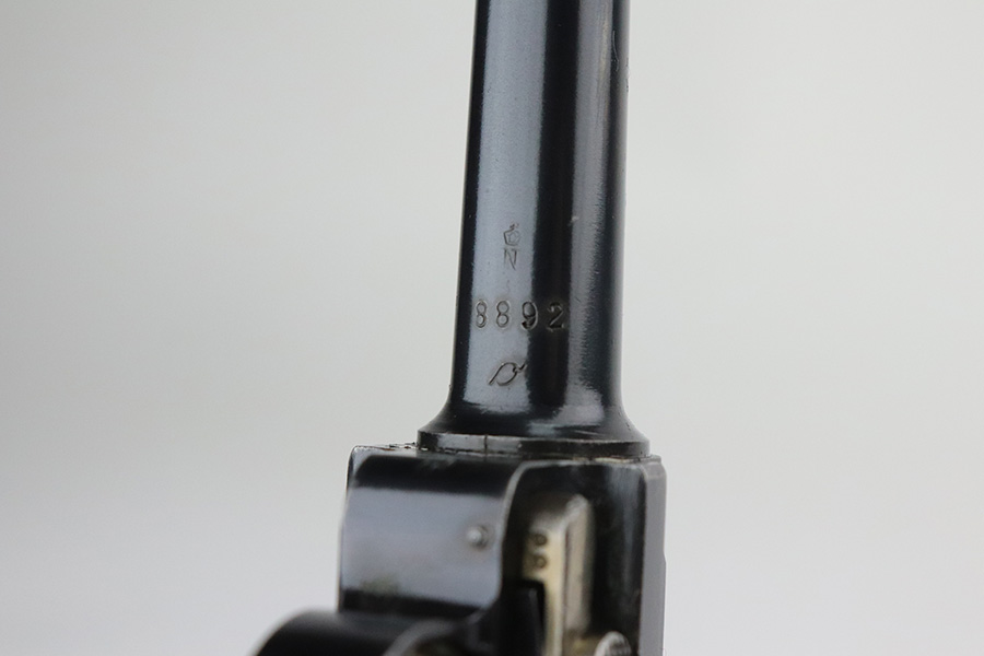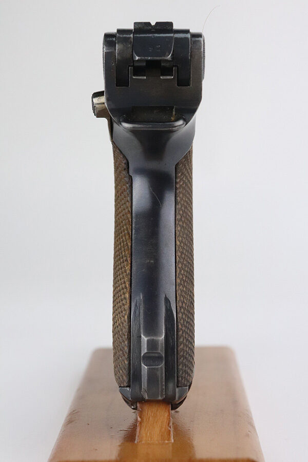 7/27/21 – This is an excellent example of a DWM Luger sold in the commercial market in the 1920’s. Chambered in .30 Luger. It is all matching and has the proper “Crown N” commercial proofs. No chamber date. It has retained about 96% of its original finish. There is very minor somewhat spotty wear on the straps and hints of wear on the side plate, side rails, and around the muzzle. A few very tiny dots of oxidation here and there. Comes with excellent un-numbered grips and a properly un-numbered commercial magazine.