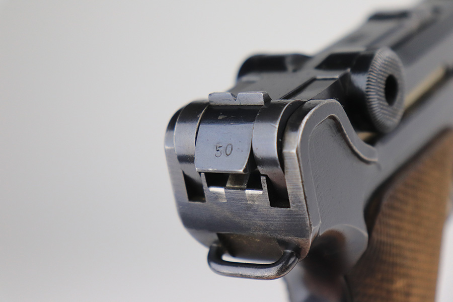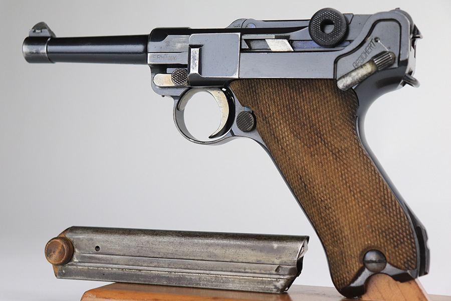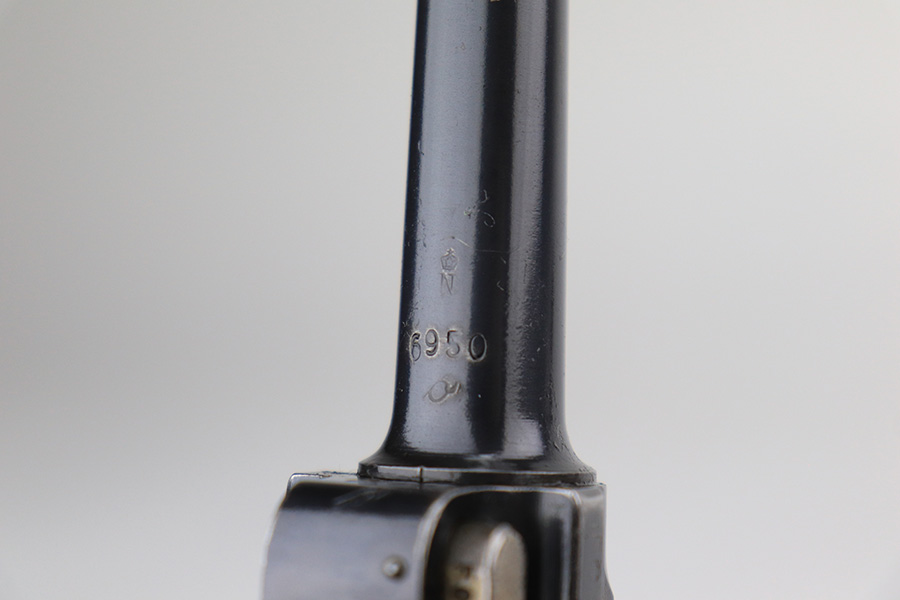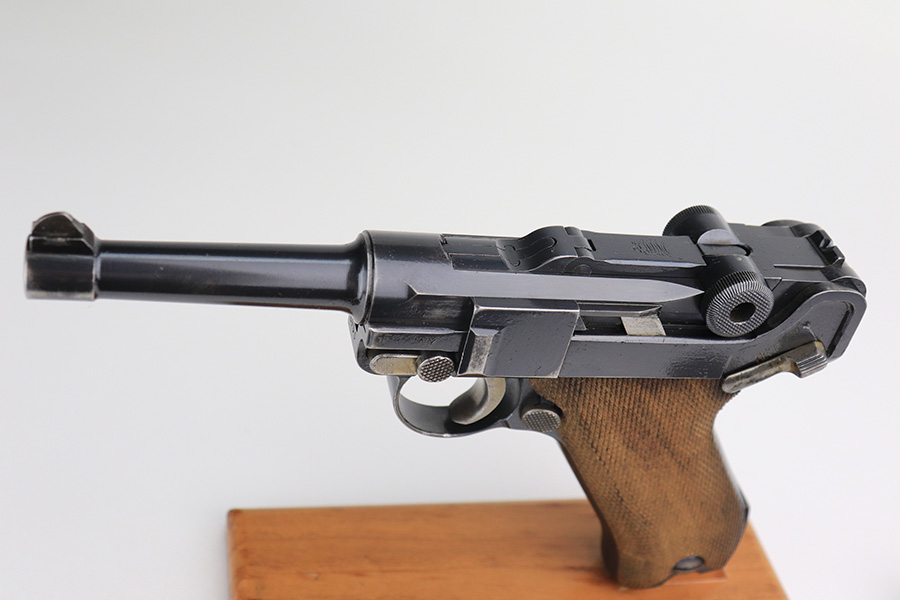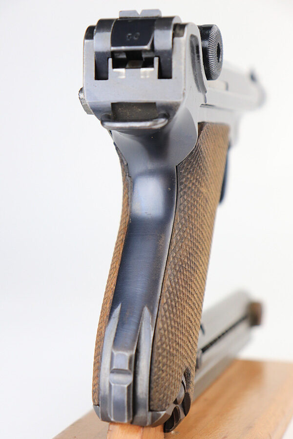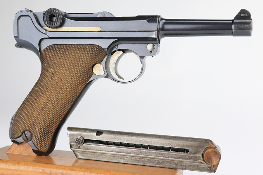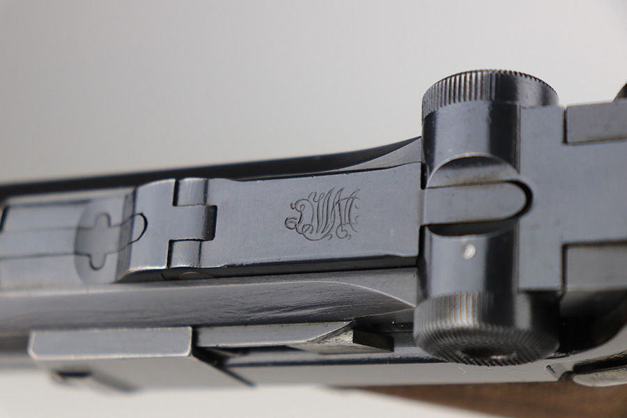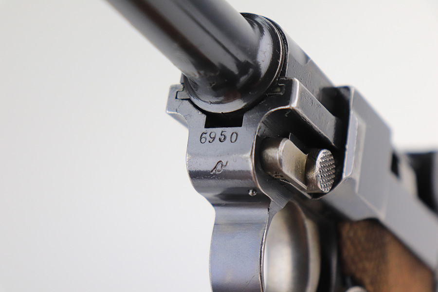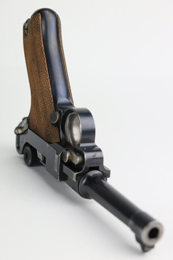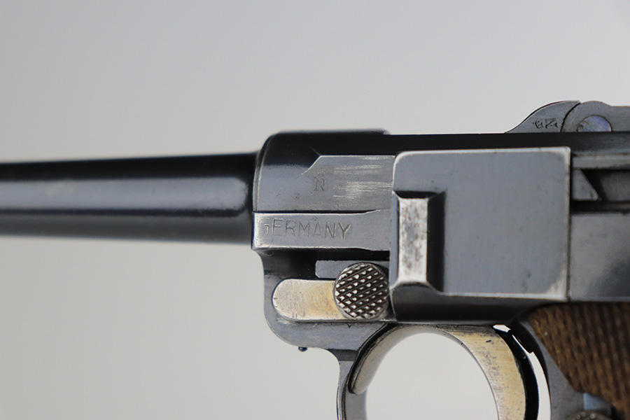 12/9/21 – This is an excellent example of a DWM Luger sold in the commercial market in the 1920’s. Chambered in .30 Luger. It is all matching and has the proper “Crown N” commercial proofs. There is a “Germany” export marking on the left side rail, indicating the gun was intended for sale in the international commercial market. It has retained about 95% of its finish. There is very minor wear on the side plate, side rails, and around the muzzle. Just hints of patina on the grip straps. The small parts have retained about half of their straw finish. Comes with excellent un-numbered wood grips – the left panel has a small bruise. Also comes with a properly un-numbered period-correct magazine. The bore has decent rifling with minor pin-pricking throughout.