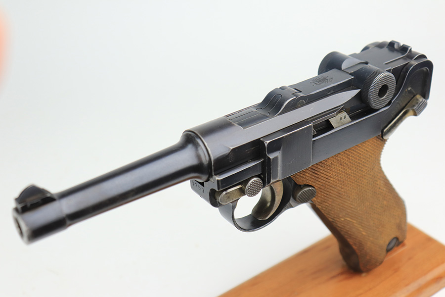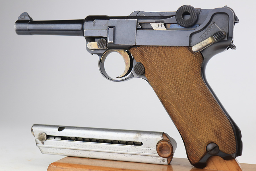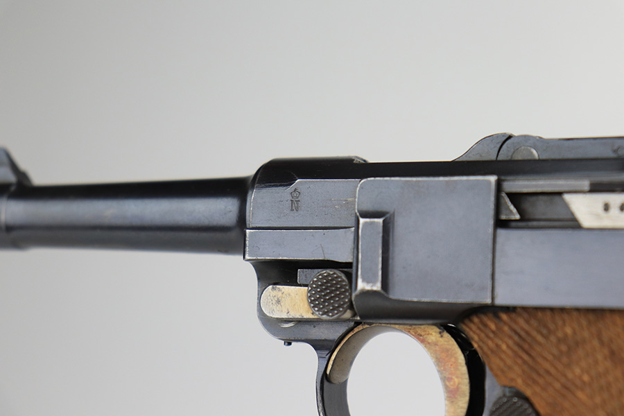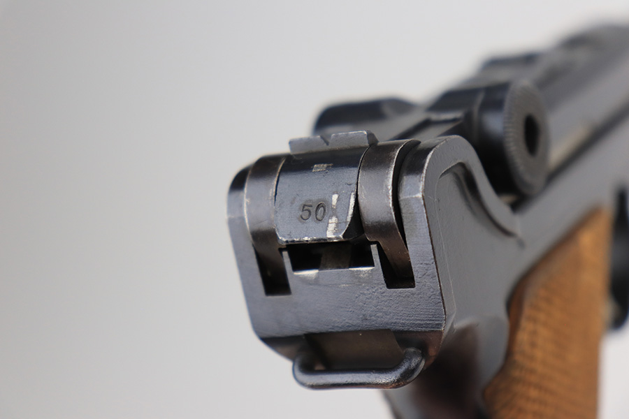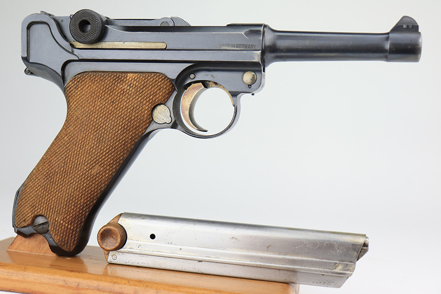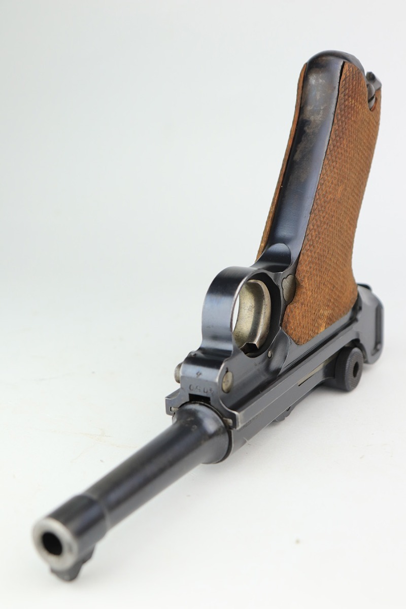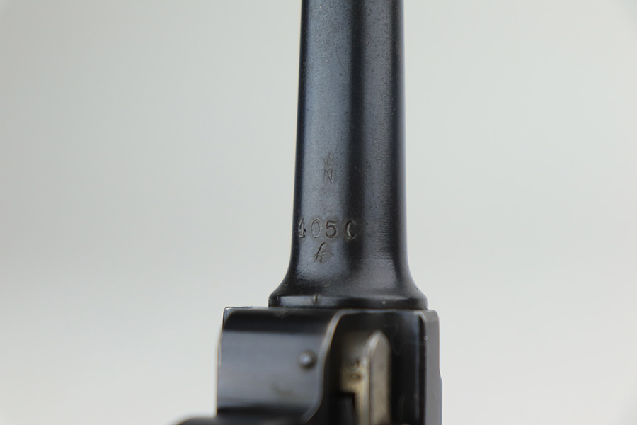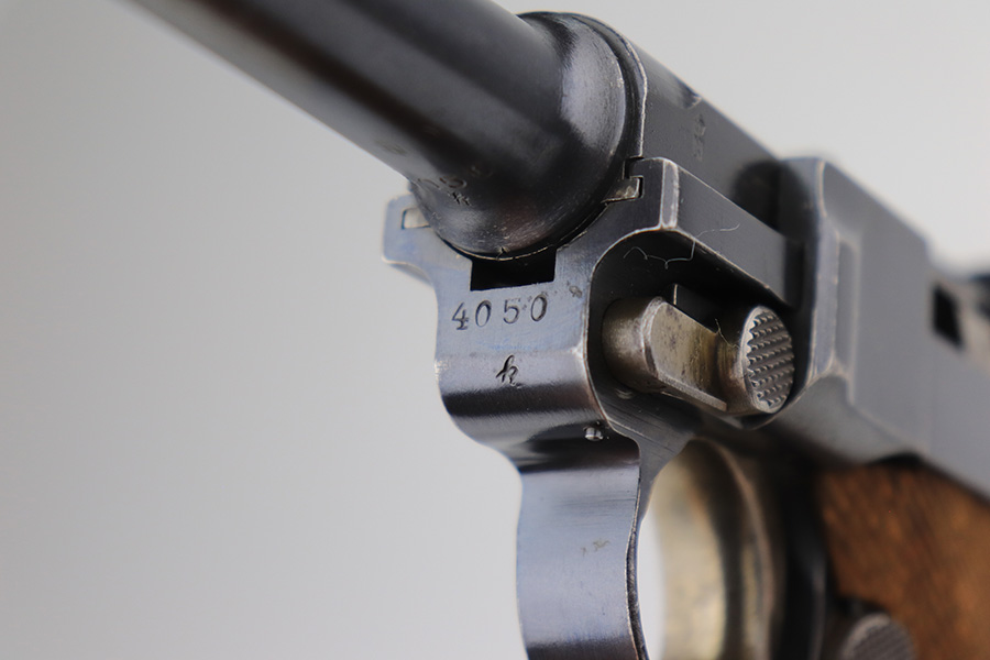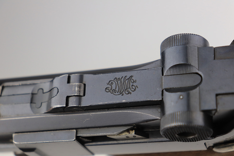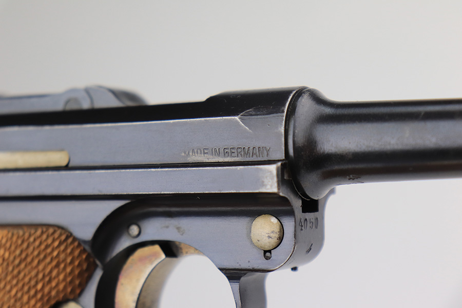 3/1/22 – This is an excellent example of a DWM Luger sold in the commercial market in the 1920’s. The gun is all matching and has the proper “Crown N” commercial proofs. It is chambered in .30 Luger and has a “Made in Germany” export proof on the right side of the slide, indicating it was intended for sale in the international commercial market. It has retained about 96% of its original finish. Most of the finish loss comes in the form of splotchy discoloration on the front strap, so the profile views are excellent. There is also very minor muzzle wear, hints of wear on the high edges, and some tiny dots of discoloration along the barrel. Comes with minty un-numbered wood grips and a properly un-numbered magazine. The bore has decent rifling, but there is very minor pin-pricking throughout.