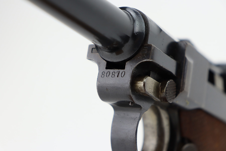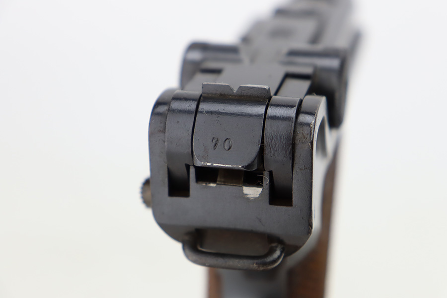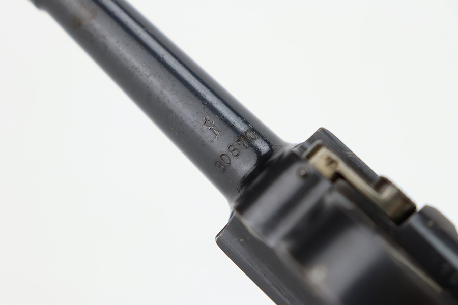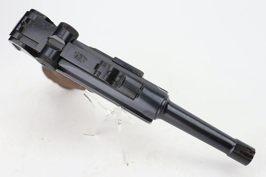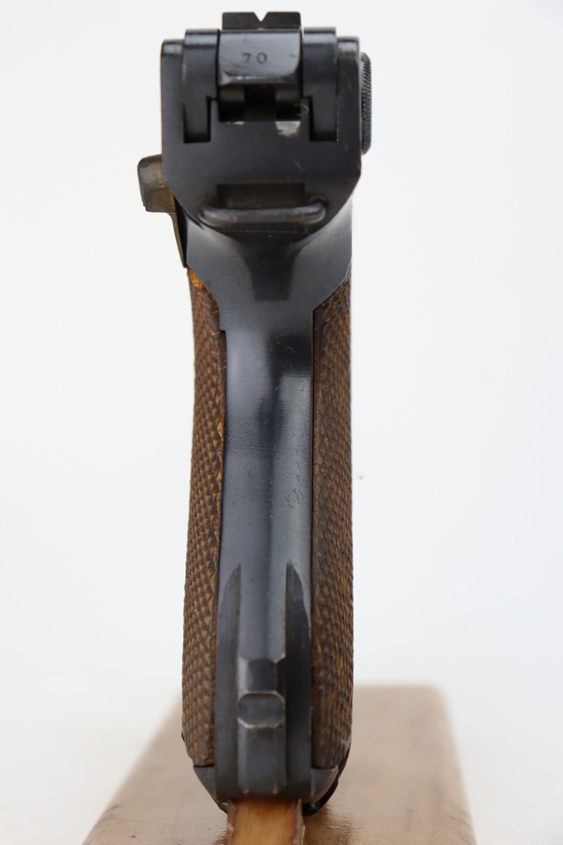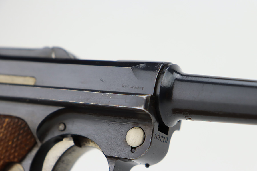 12/5/23 – This is an excellent DWM Luger sold in the commercial market in the 1920’s. All matching and chambered in .30 Luger. “Germany” export marking on the right side of the slide. The original finish rates about 97%. There is a streak of wear on the front strap, some pin-pricking along the barrel, and some tiny scratches on the left side of the frame. Fitted with un-numbered grips and comes with a numbered but mismatched magazine. Mint bore.