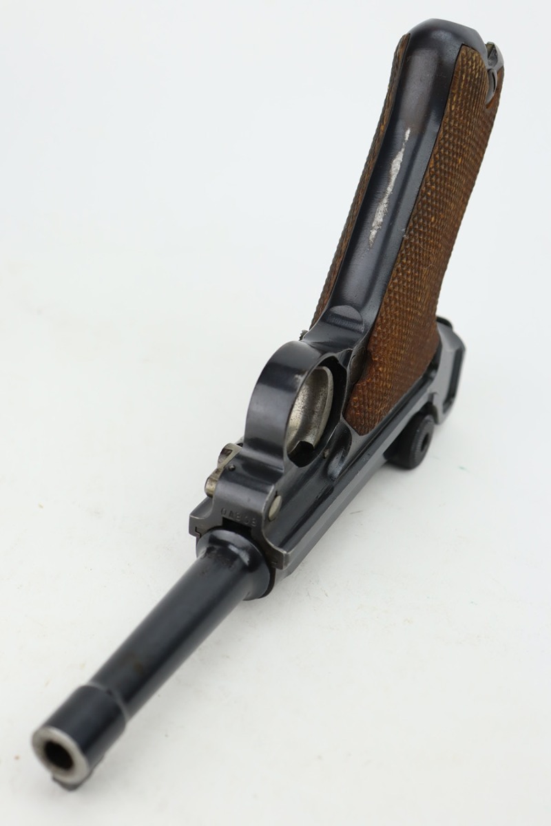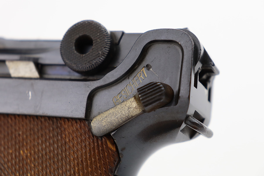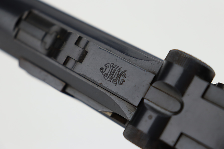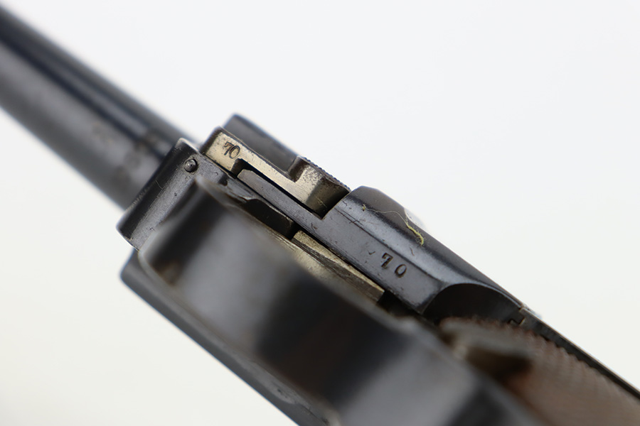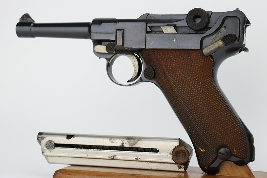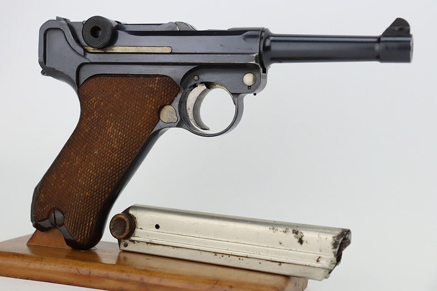 12/5/23 – This is an excellent DWM Luger sold in the commercial market in the 1920’s. All matching and chambered in .30 Luger. “Germany” export marking on the right side of the slide. The original finish rates about 97%. There is a streak of wear on the front strap, some pin-pricking along the barrel, and some tiny scratches on the left side of the frame. Fitted with un-numbered grips and comes with a numbered but mismatched magazine. Mint bore.
