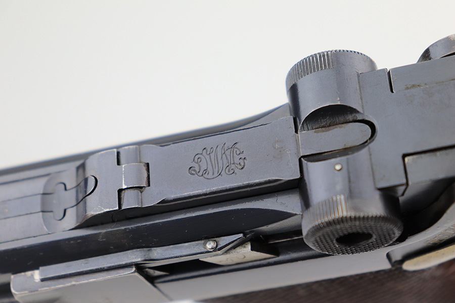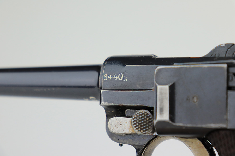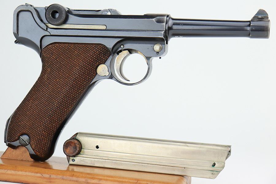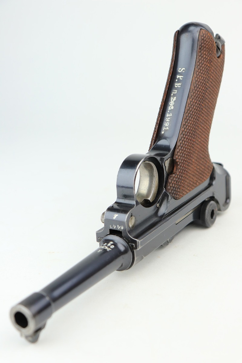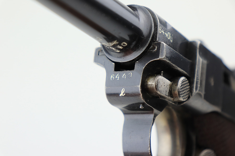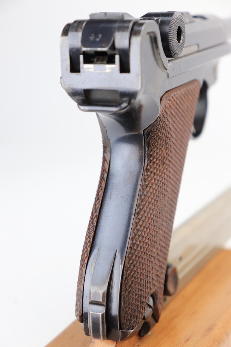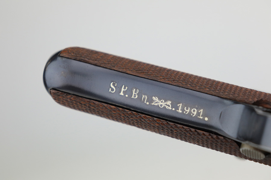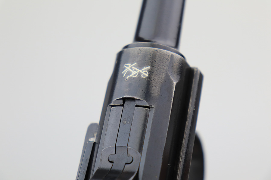 4/19/22 – This is an excellent example of a DWM Luger that was originally sold in the commercial market in the 1920’s. It was then reworked and issued to the German police force, as evidenced by the added police sear safety and the “SP. Bn. 1991” police unit marking on the front strap. We believe this indicates it was issued to the Bayern police force. This one also comes with a matching police arsenal-numbered magazine. There is a crossed-out “7.65” marking on the receiver. Seeing as the barrel was replaced and re-numbered to match, it’s possible this gun was originally chambered in 7.65mm – a popular commercial cartridge. It has retained about 96-97% of its bluing. There is wear around the muzzle, on the side plate, and on the top of the receiver where there is also some minor pin-pricking. Comes with minty wood grips – the left panel has an “Eagle 6” Simson proof, the other is un-marked. Minty bore.