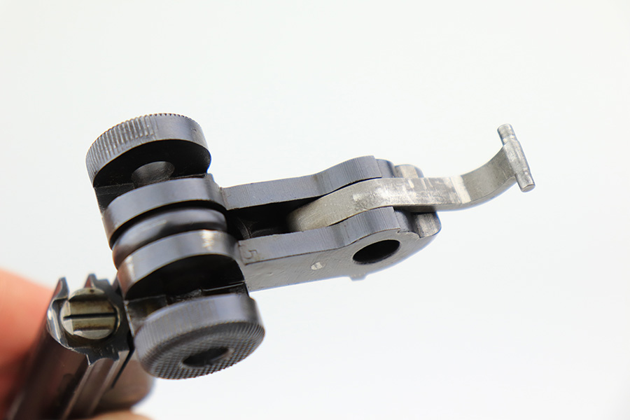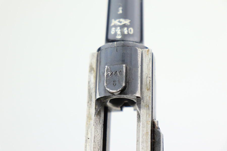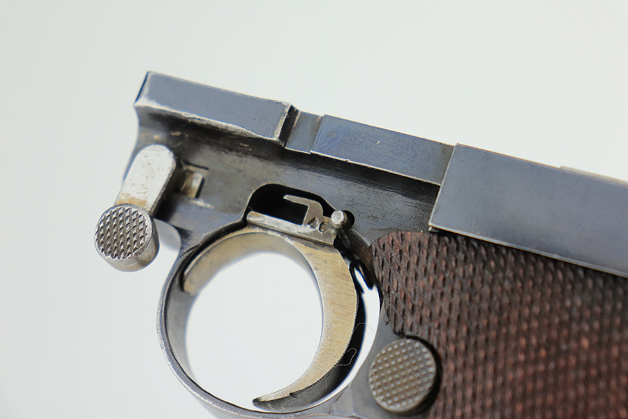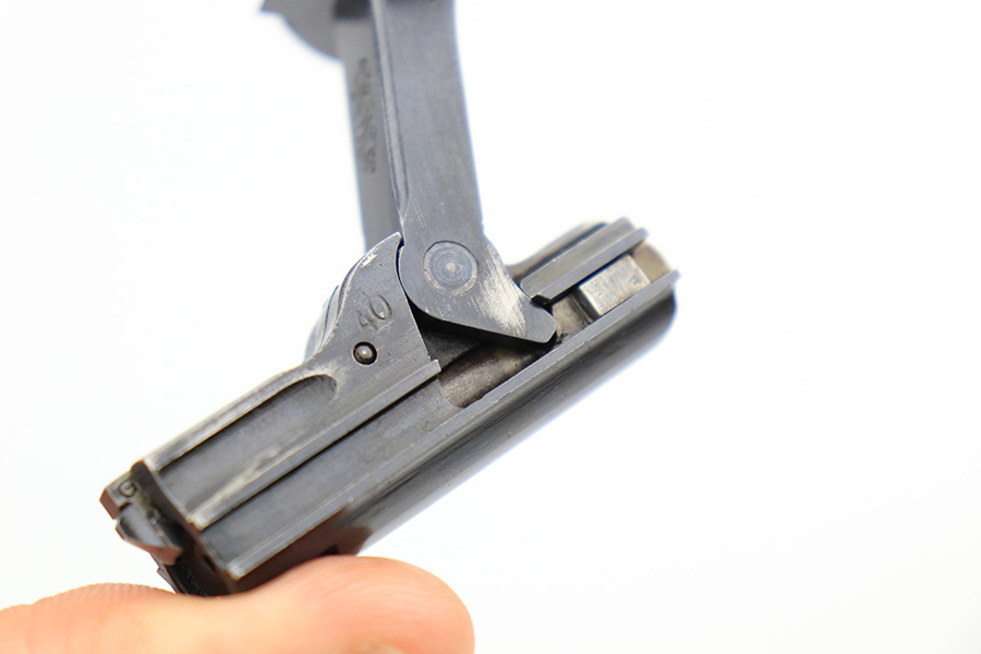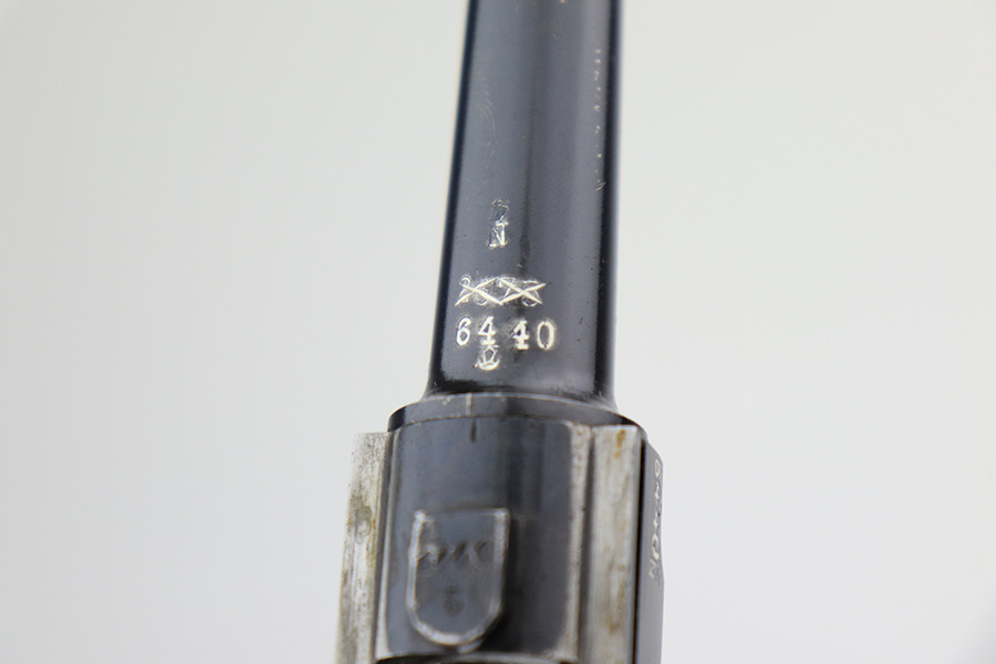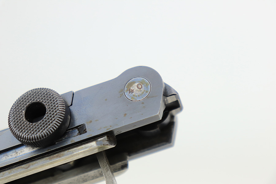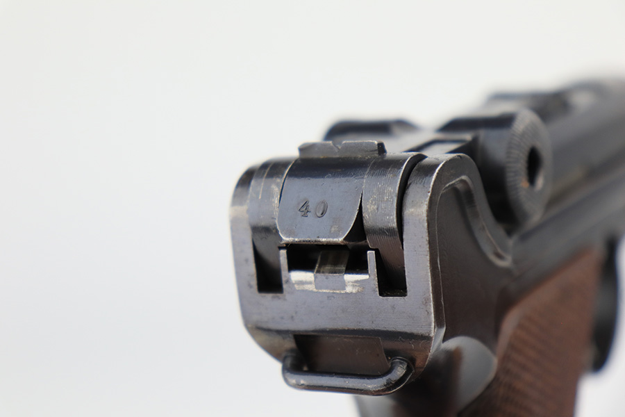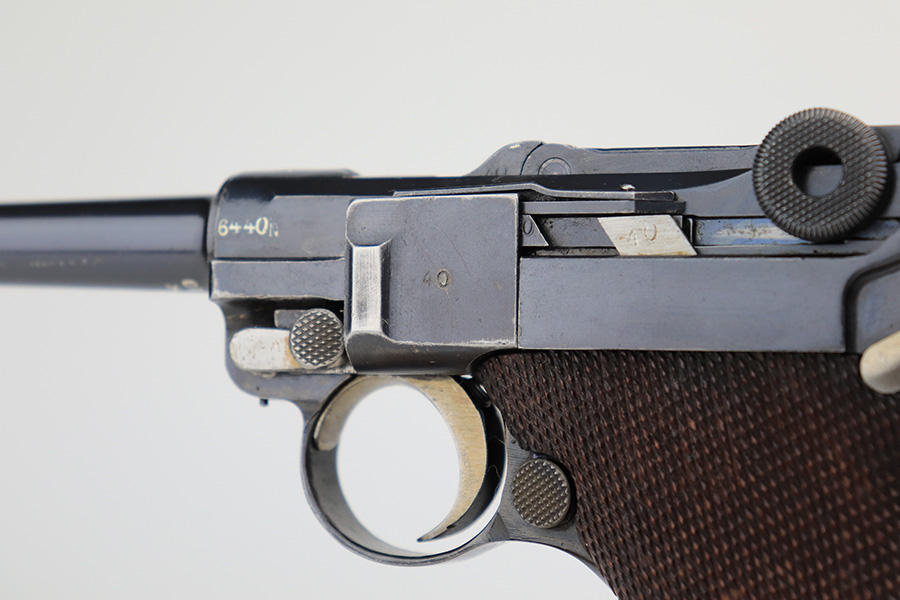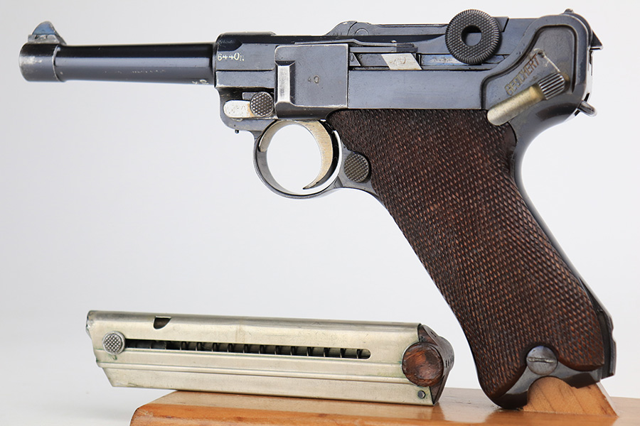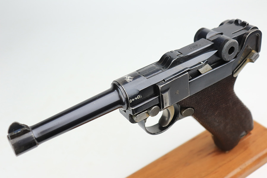 4/19/22 – This is an excellent example of a DWM Luger that was originally sold in the commercial market in the 1920’s. It was then reworked and issued to the German police force, as evidenced by the added police sear safety and the “SP. Bn. 1991” police unit marking on the front strap. We believe this indicates it was issued to the Bayern police force. This one also comes with a matching police arsenal-numbered magazine. There is a crossed-out “7.65” marking on the receiver. Seeing as the barrel was replaced and re-numbered to match, it’s possible this gun was originally chambered in 7.65mm – a popular commercial cartridge. It has retained about 96-97% of its bluing. There is wear around the muzzle, on the side plate, and on the top of the receiver where there is also some minor pin-pricking. Comes with minty wood grips – the left panel has an “Eagle 6” Simson proof, the other is un-marked. Minty bore.