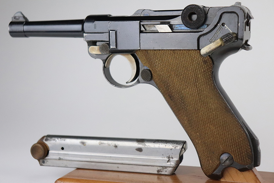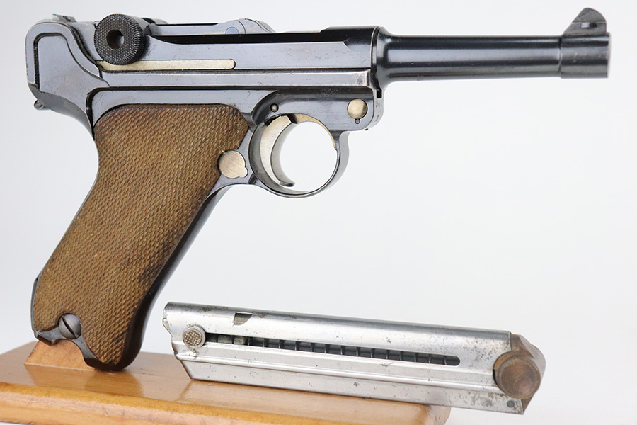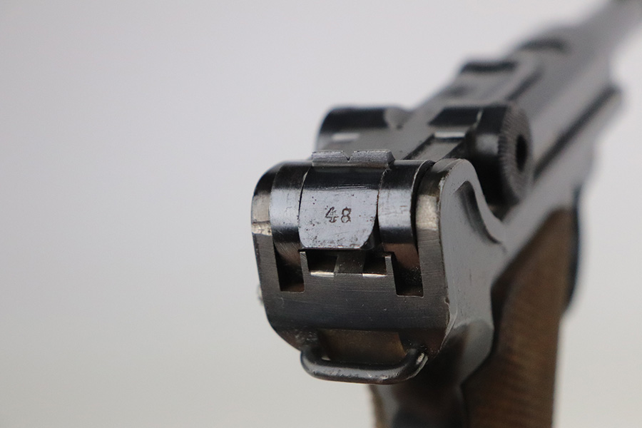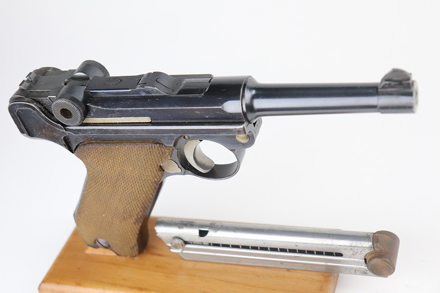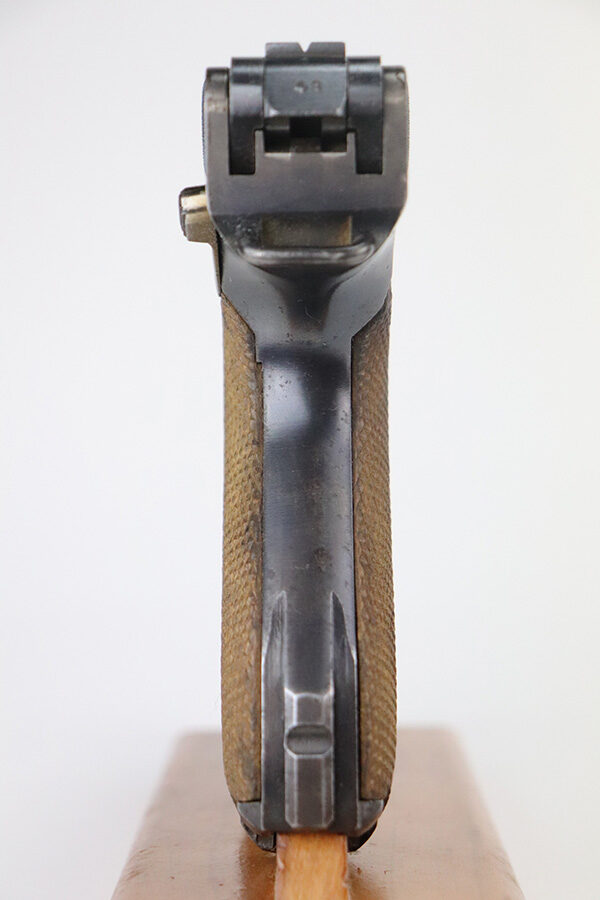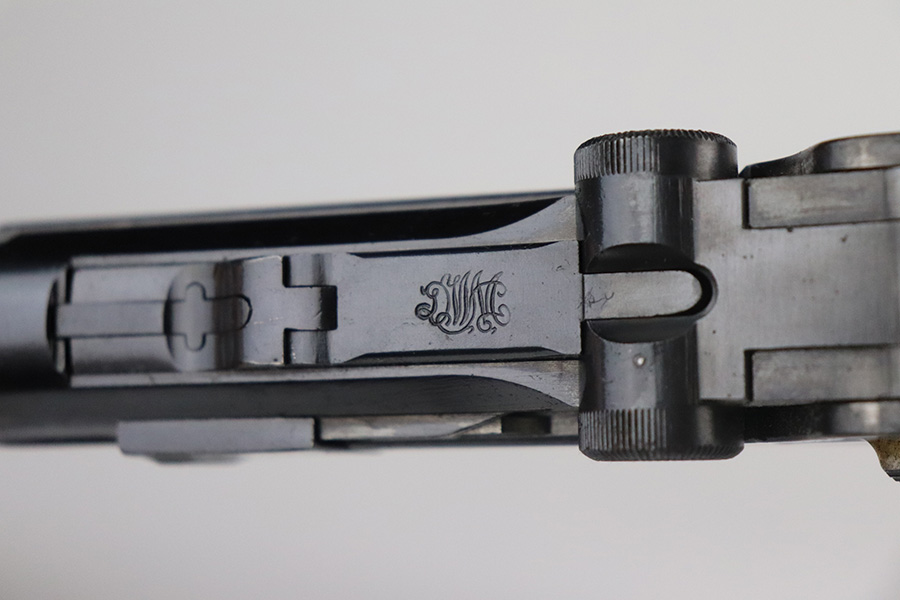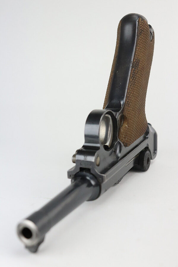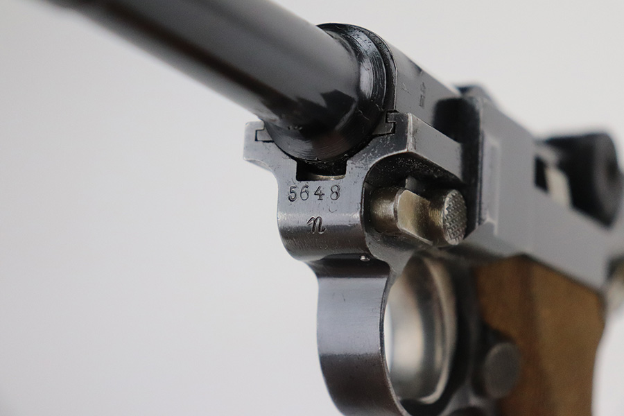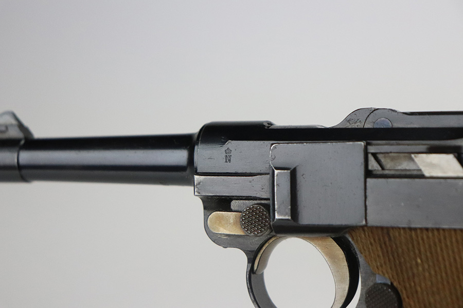 7/1/21 – This is an excellent example of a DWM Luger sold in the commercial market in the 1920’s. Chambered in .30 Luger. It is all matching and has the proper “Crown N” commercial proofs. It has retained about 97% of its original finish. Hints of wear on the side plate, side rails, and around the muzzle. Somewhat spotty minor wear on both straps. Spotty oxidation on both straps. Excellent un-numbered grips and a blank-bottom magazine. The magazine bottom is a little loose and wiggles a bit. The bore is mint.