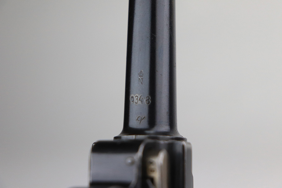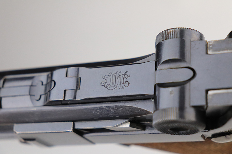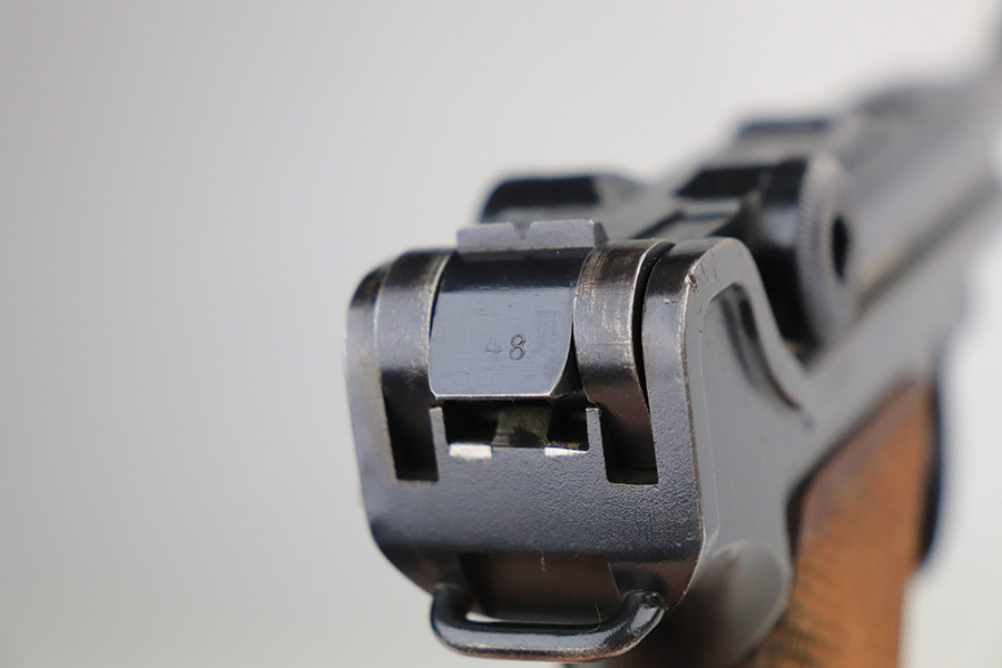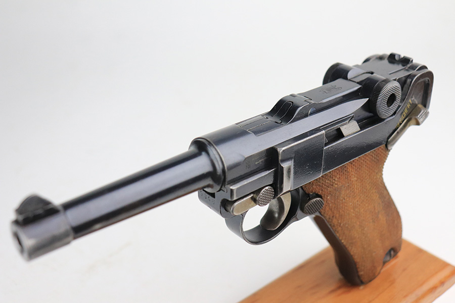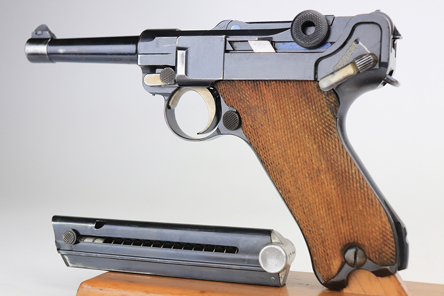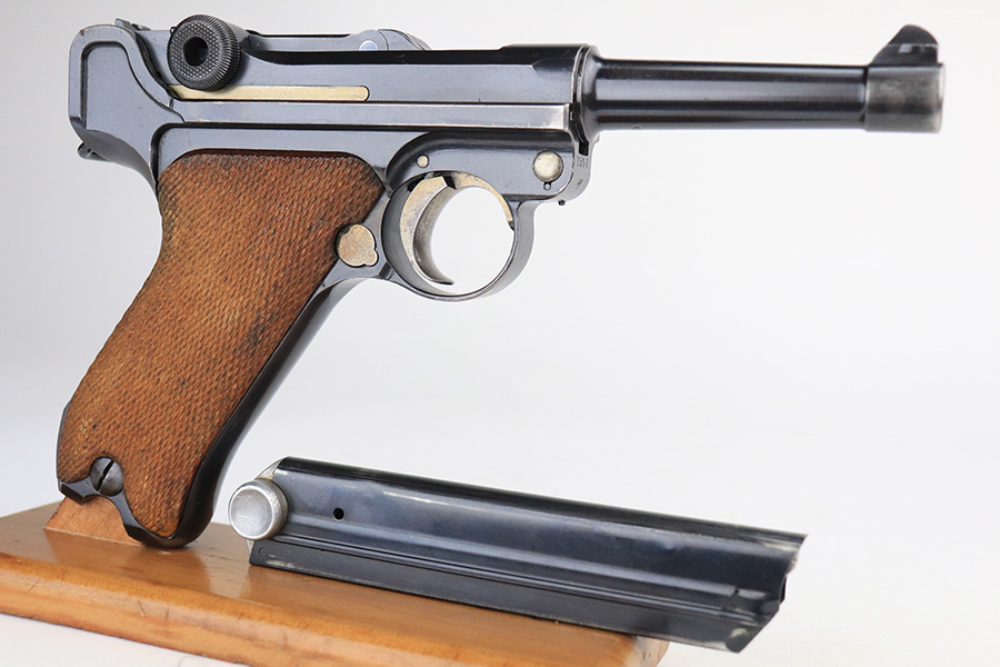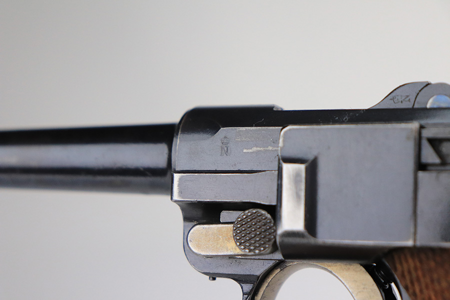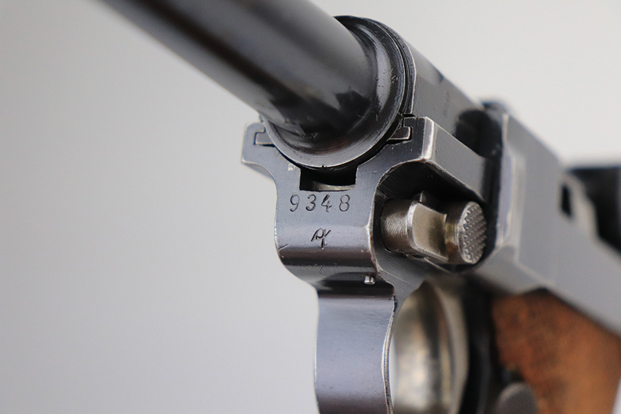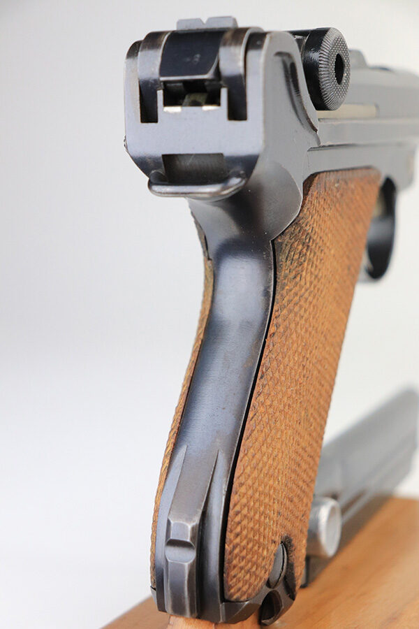 1/25/22 – This is an excellent example of a DWM Luger sold in the commercial market in the 1920’s. The gun is all matching and has the proper “Crown N” commercial proofs. No “Germany” export markings. The gun has retained about 95% of its original finish. There is minor wear on the side plate, front edges of the side rails, and around the muzzle. Some light, somewhat spotty wear on both grip straps. Comes with nice wood grips and a mismatched WW2-era magazine. On the left grip panel, there is a very small chip in the bottom left corner and a small repaired crack in the top right corner. The bore is near-mint.