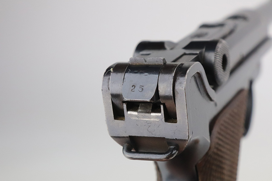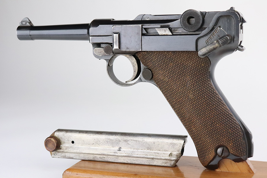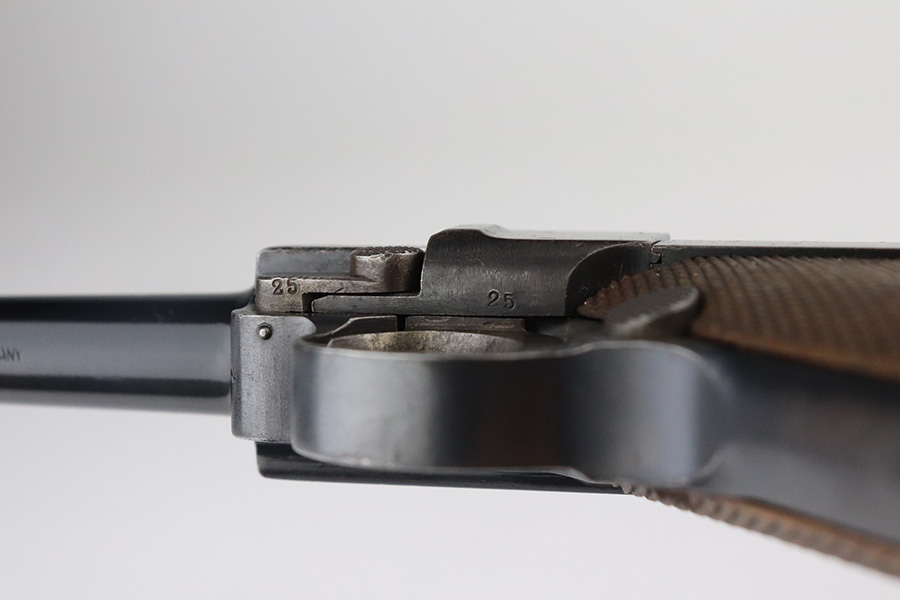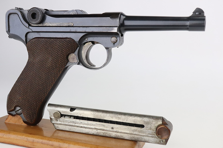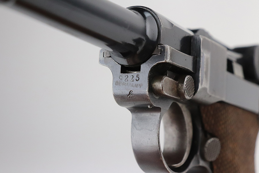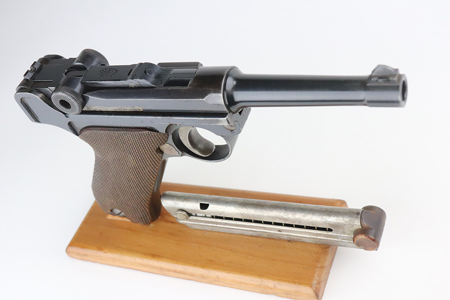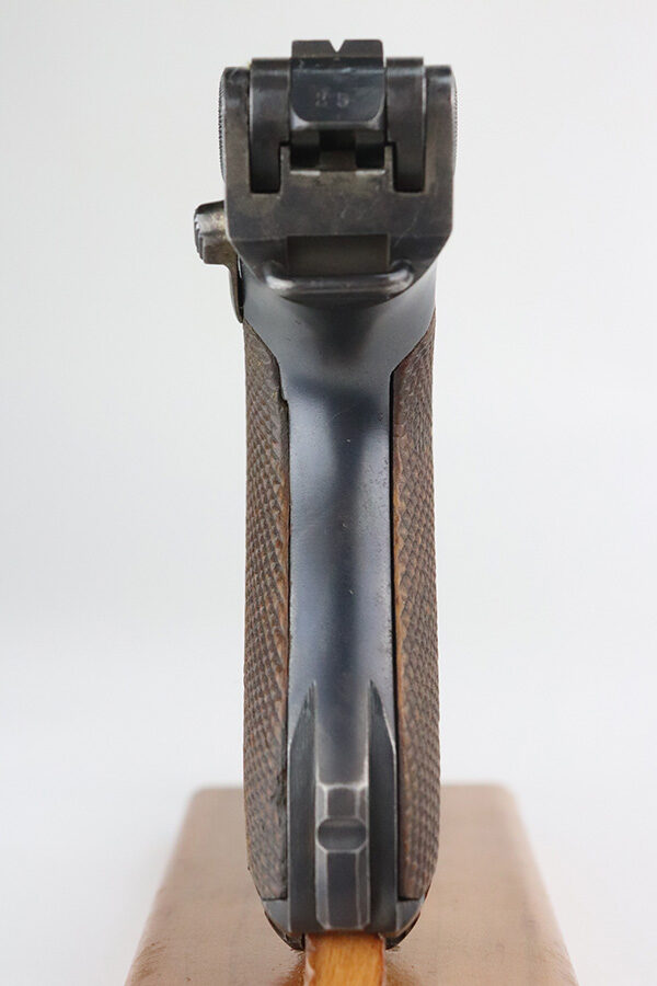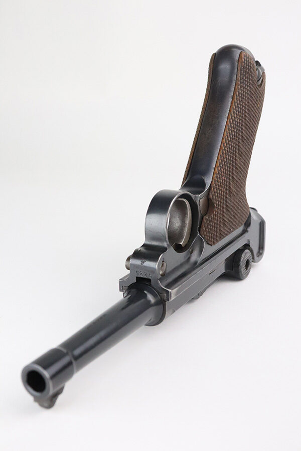 7/27/21 – This is an excellent example of a DWM Luger sold in the commercial market in the 1920’s. Chambered in 9mm. It is all matching and has the proper “Crown N” commercial proofs. “Germany” export proof on the frame. No chamber date. It has retained about 95-96% of its original finish. There is minor wear and minor spotty oxidation on the side plate, side rails, and around the chamber. Minor wear, oxidation, and a few small scratches on the front strap. Comes with nice un-numbered grips and a numbered but mismatched WW1-era magazine. Excellent shiny bore with strong rifling.