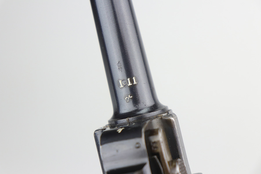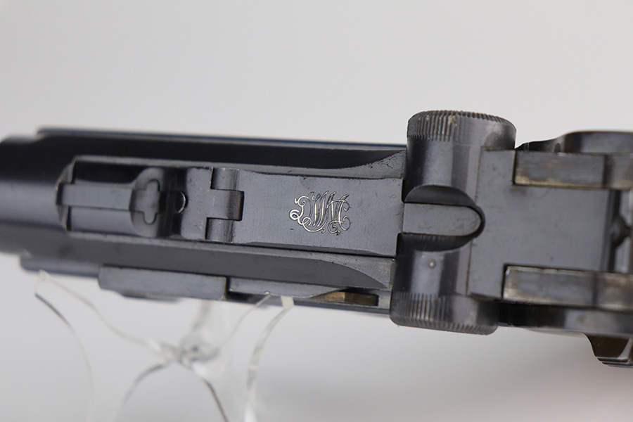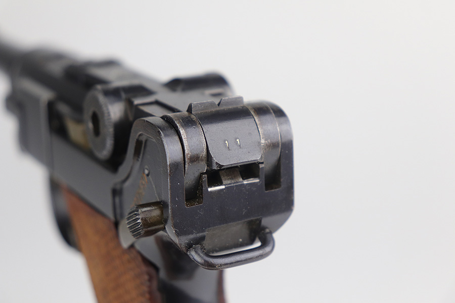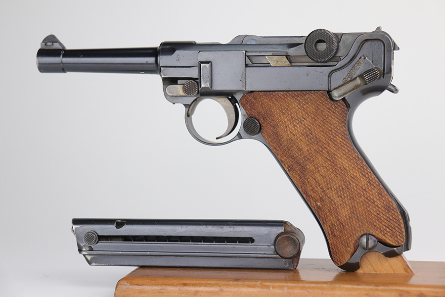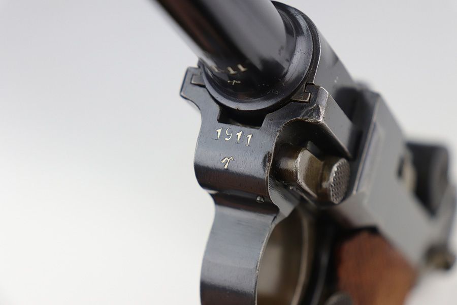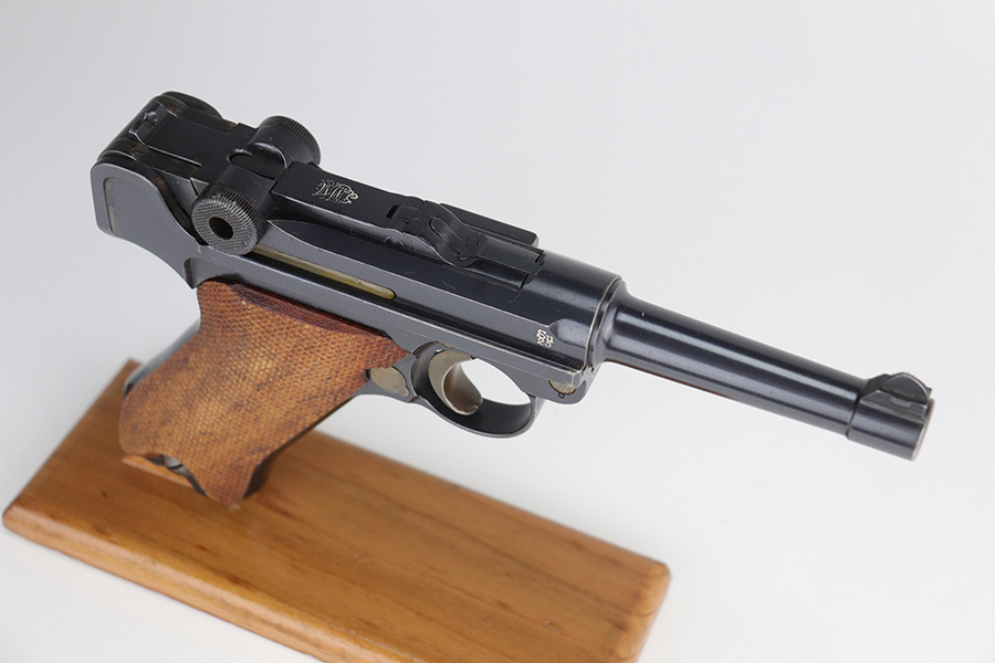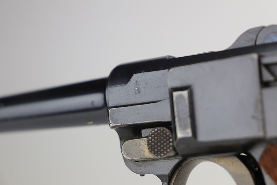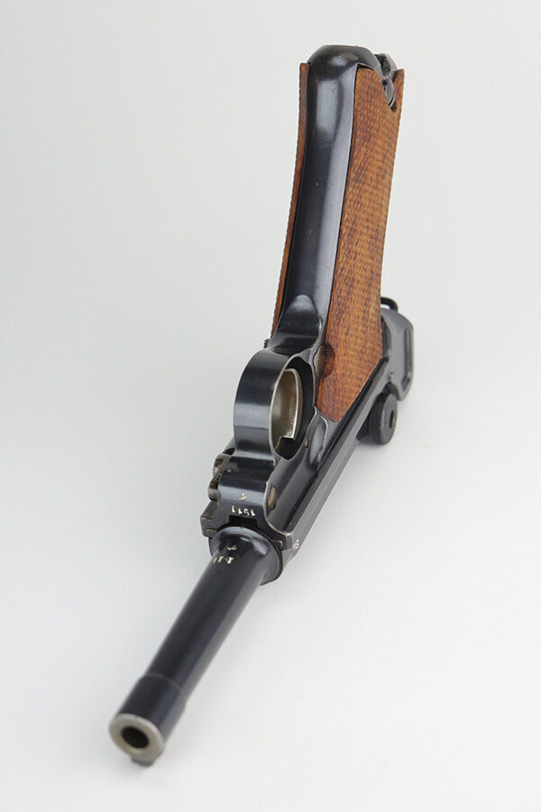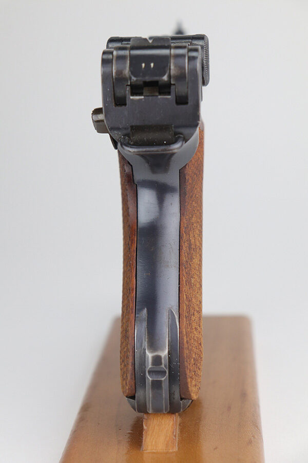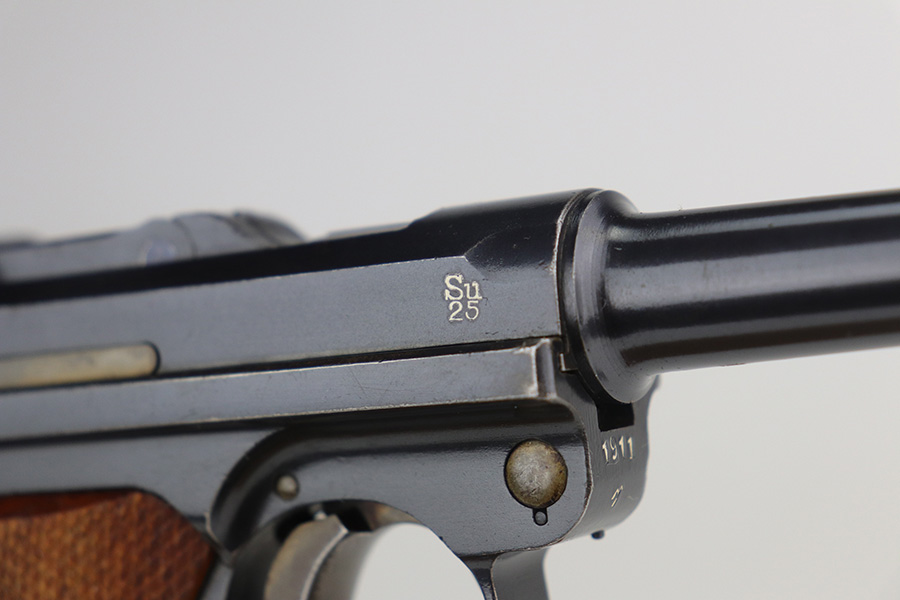 11/29/21 – This is an excellent example of a DWM Luger sold in the commercial market in the 1920’s. It is chambered in .30 Luger. It is all matching and has the proper “Crown N” commercial proofs. There is an “Su 25” proof on the right side of the slide. From research, this seems to indicate the gun was sent to and reworked at the Simson factory. The gun is in excellent condition, retaining about 96-97% of its bluing. There is very minor wear on the side plate, side rails, and around the muzzle. There are also some areas with tiny pits on the side plate. Minor somewhat scratchy wear on both grip straps. Comes with minty wood grips that do not fit the gun perfectly and were likely replaced. Comes with one magazine – the tube is blued and there is a “Crown M” marking on the wood base. The bore is mint.