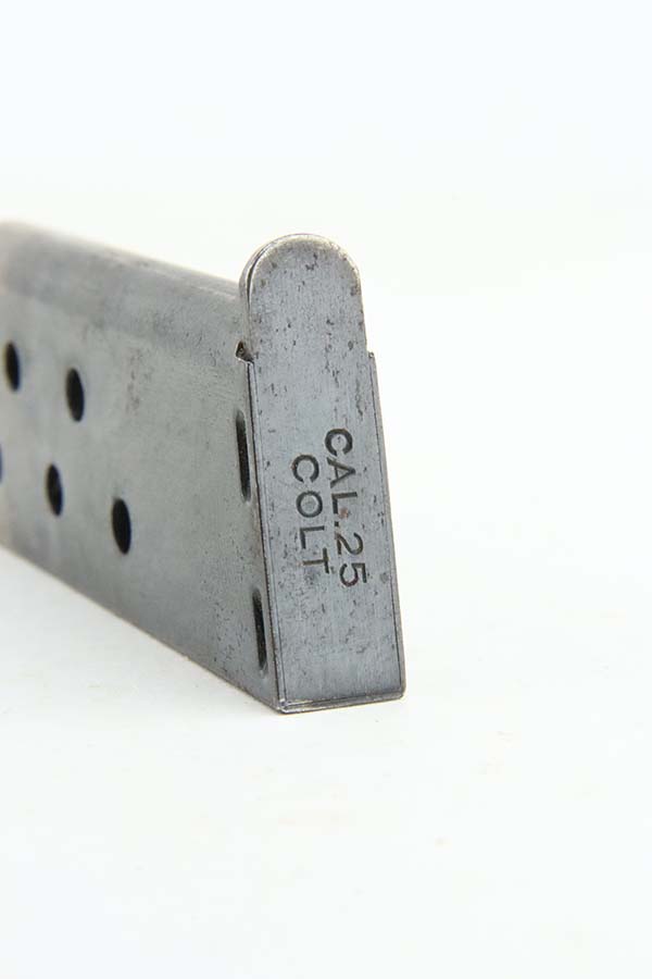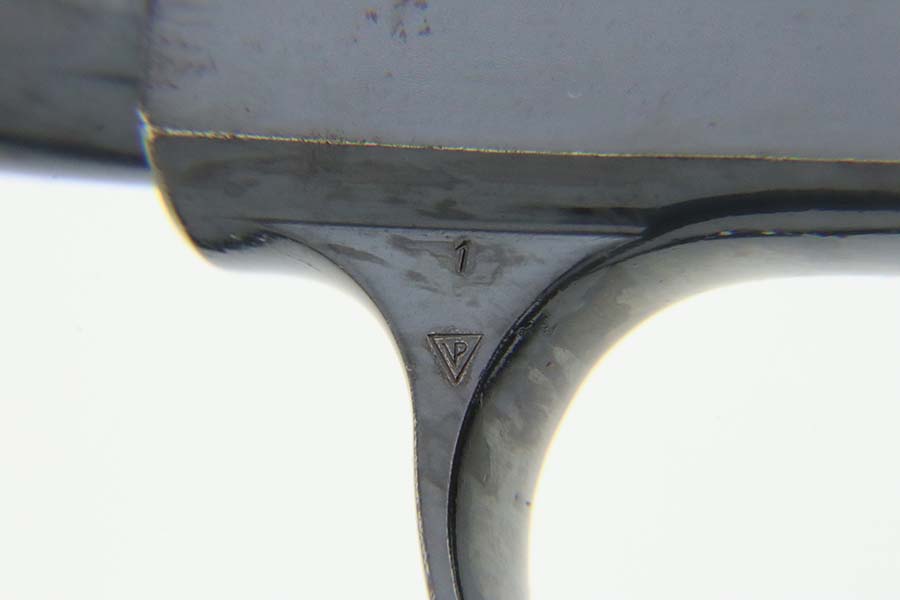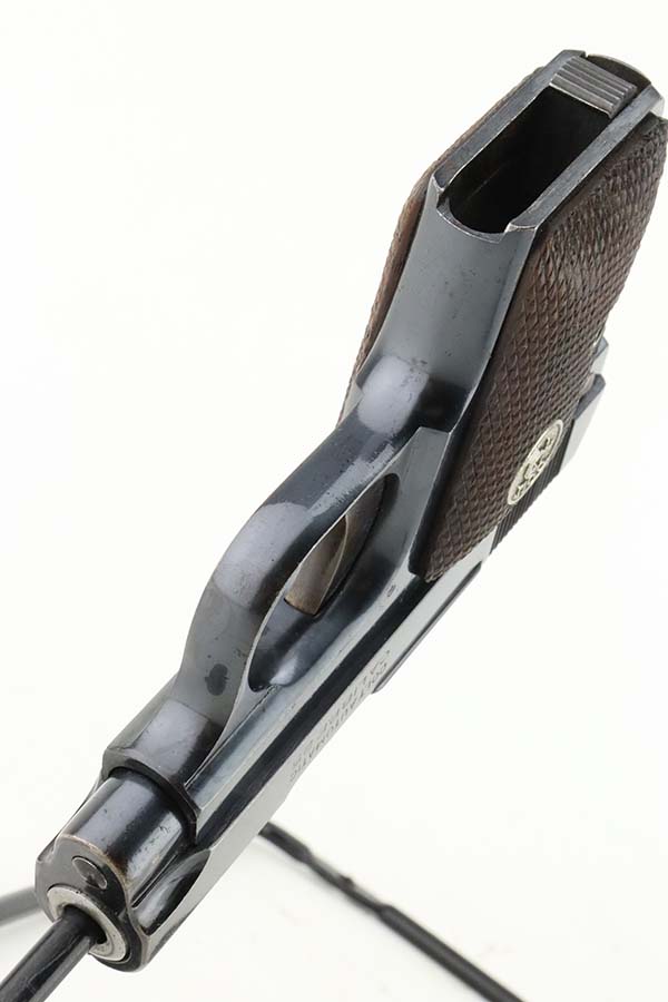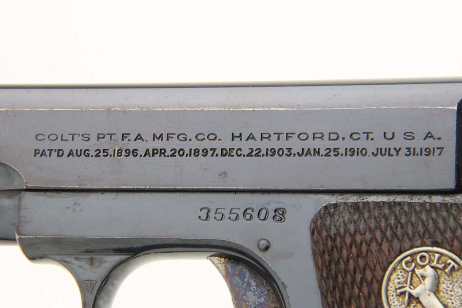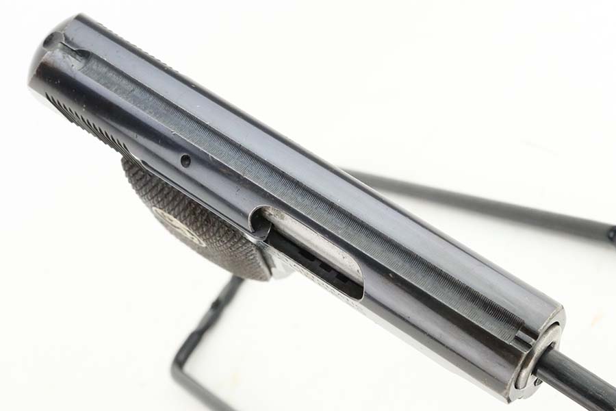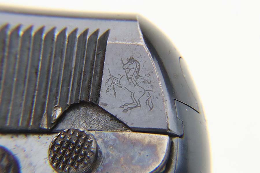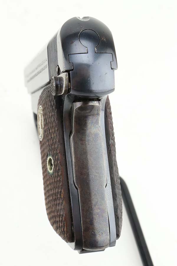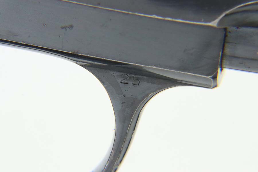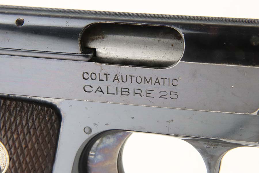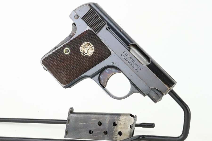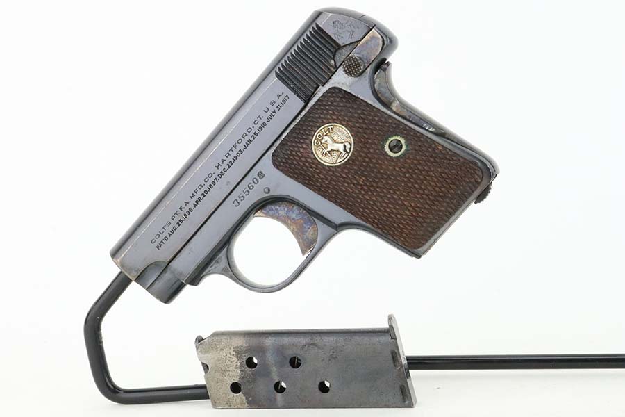 3/11/24 – This is an excellent example of a Colt Model 1908 Vest Pocket, manufactured in 1926 and chambered in .25 ACP. It is all matching and has retained about 97% of its original finish. There is just very minor high edge wear and some tiny marks here and there. Beautiful case-hardening on the small parts. Fitted with excellent wood grips and comes with one magazine. The bore has strong rifling, but there is very light spotty surface oxidation throughout.