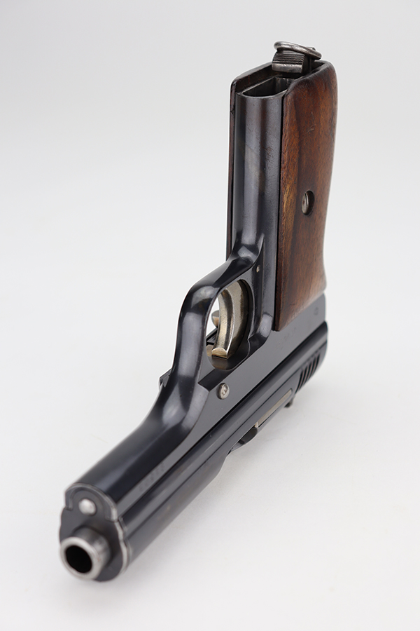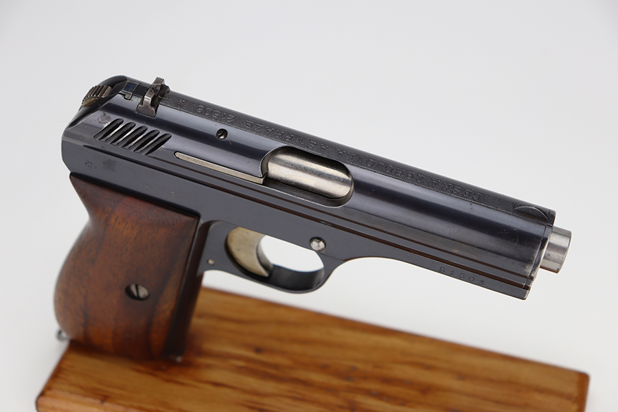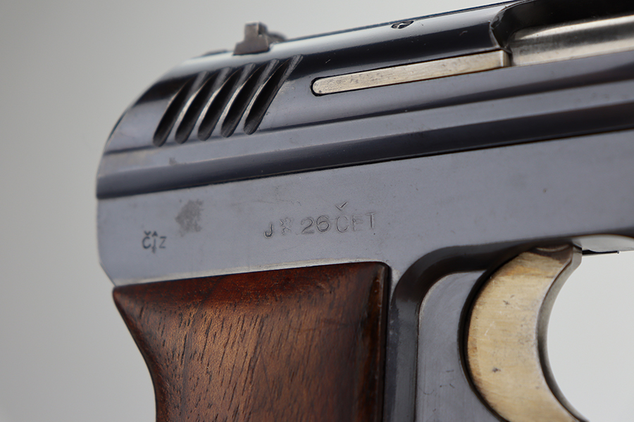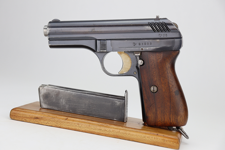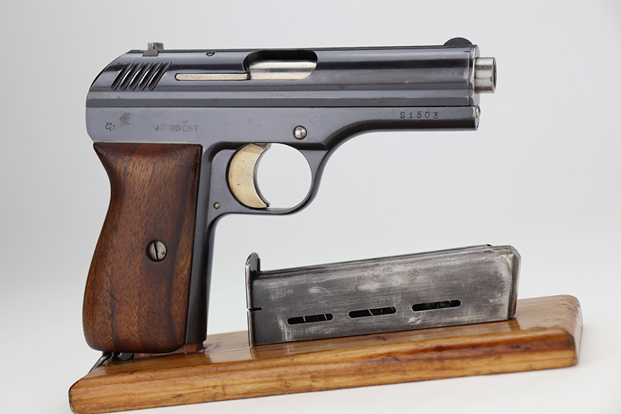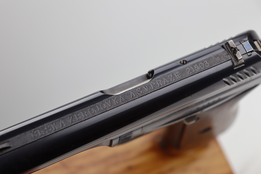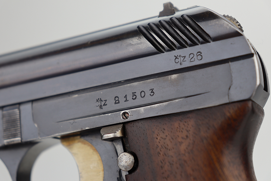 6/11/24 – This is an excellent example of a Czech Cz 24 from 1926. All matching with the proper Czech proofs. There is a “CET” marking on the right side of the frame, indicating Czech Police issue. Its original finish rates about 96-97% with just a few small spots of minor wear here and there. Fitted with a period-correct one-piece grip and a numbered but mismatched magazine. Minty bore.