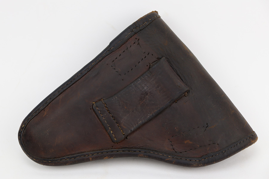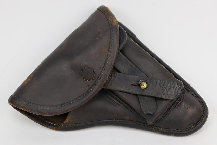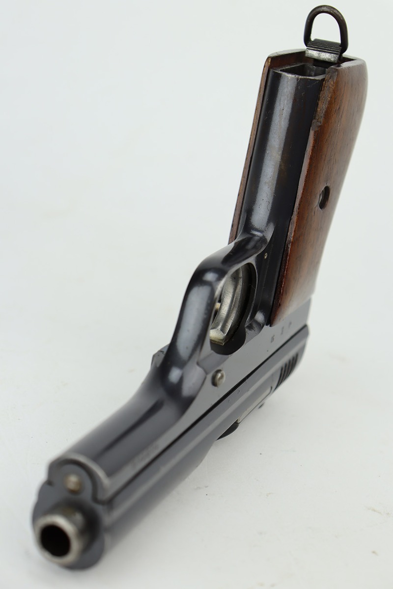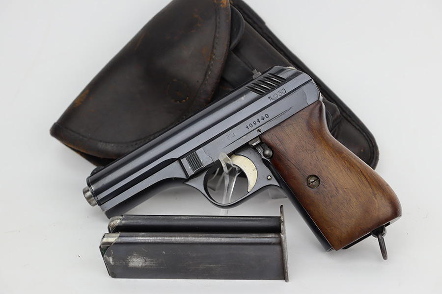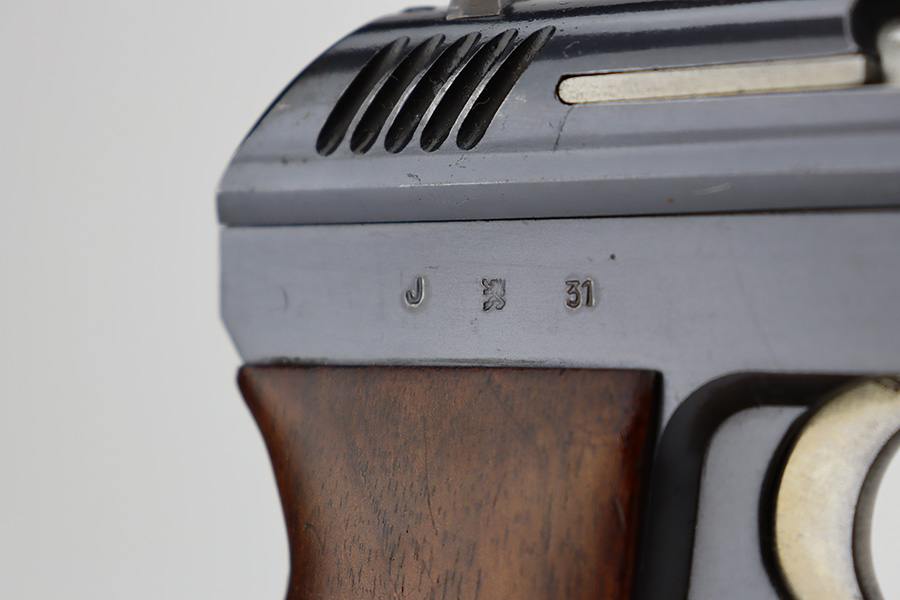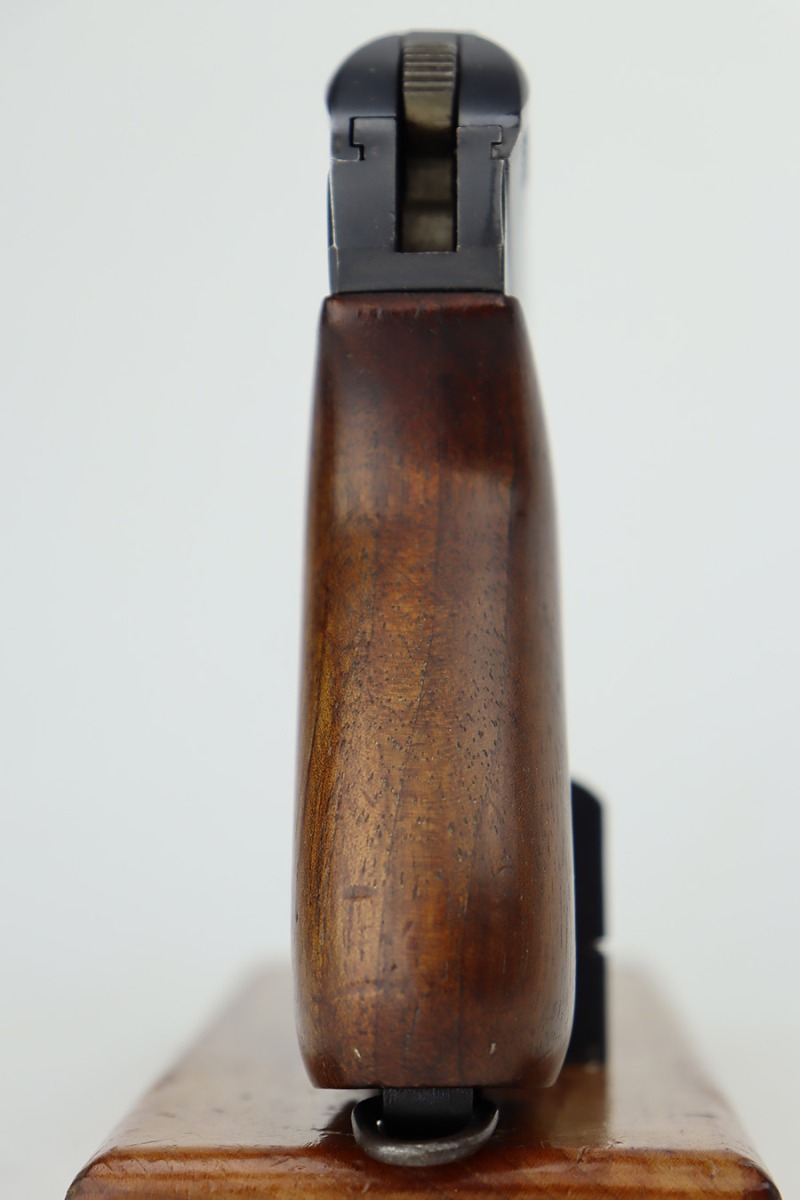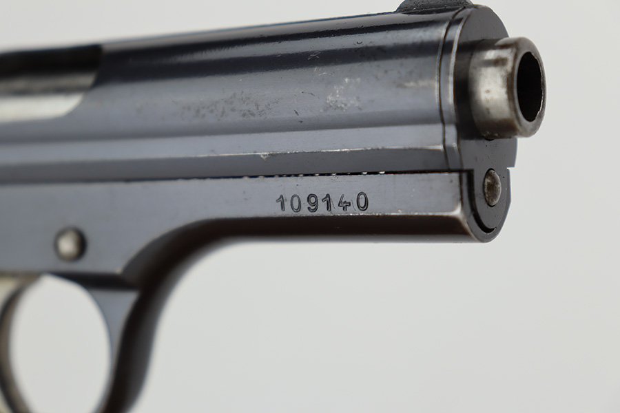 6/27/23 – This is an excellent example of a Czech CZ Model 24 manufactured in 1931. The gun is all matching and has the proper Czech lion proofs throughout. The frame is dated 1931. It comes as a rig with two proper magazines and a period-correct leather holster. The gun itself has retained about 96% of its original finish. There is just very minor high edge and minor wear and some minor spotty wear on the front strap. Some very light freckling on the right side of the slide. Fitted with a nice period-correct one piece wood grip – small chip in the bottom right corner. Excellent bore with great rifling.
