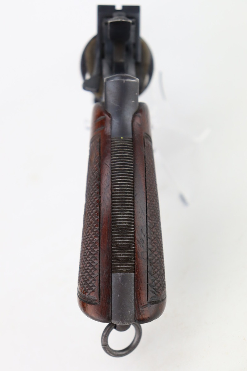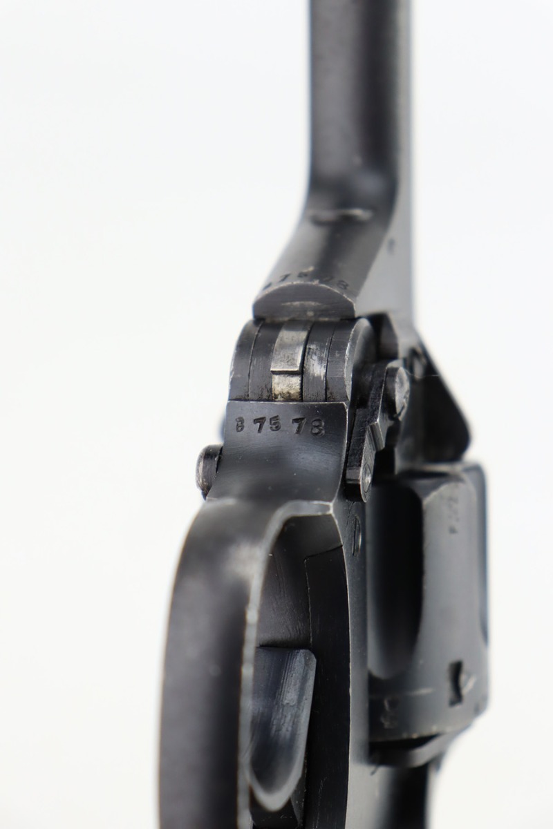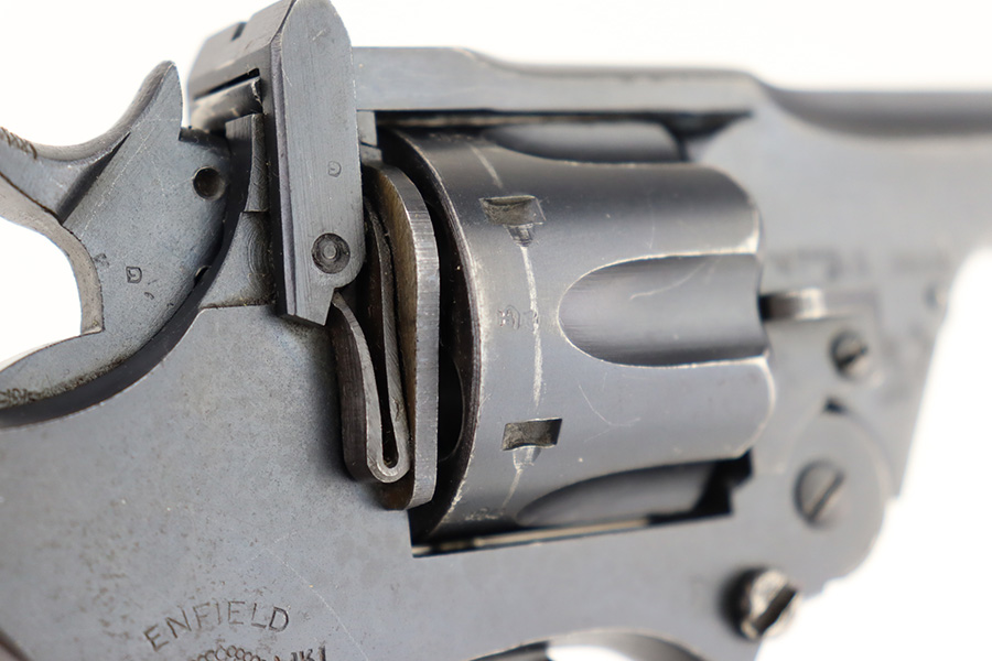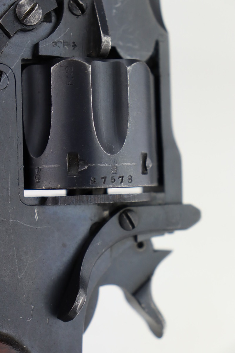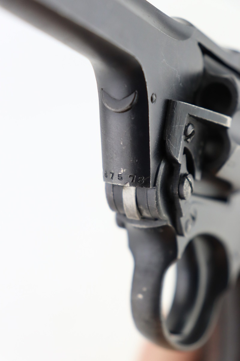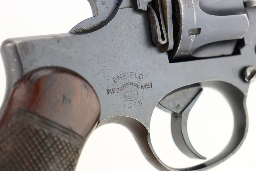 1/8/24 – This is an excellent example of an Enfield No 2 Mk I revolver issued to the British military in 1933. All matching with the proper British proofs throughout. It comes as a rig with a very nice period-correct canvas holster. The gun itself has retained about 96-97% of its original finish with some very minor high edge wear and some very light surface scratches and scuffs here and there. Fitted with nice period-correct wood grips – just minor bruising on both sides. Mint bore.