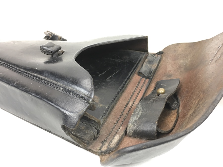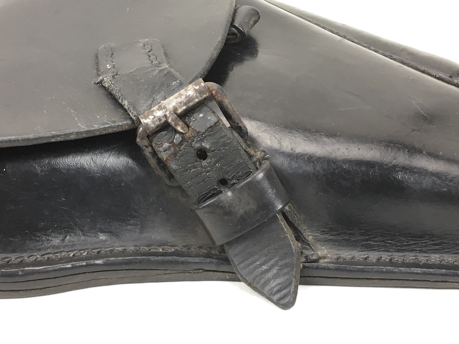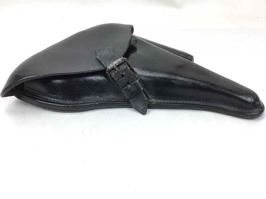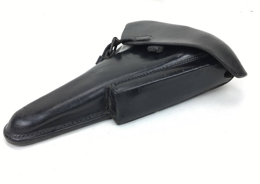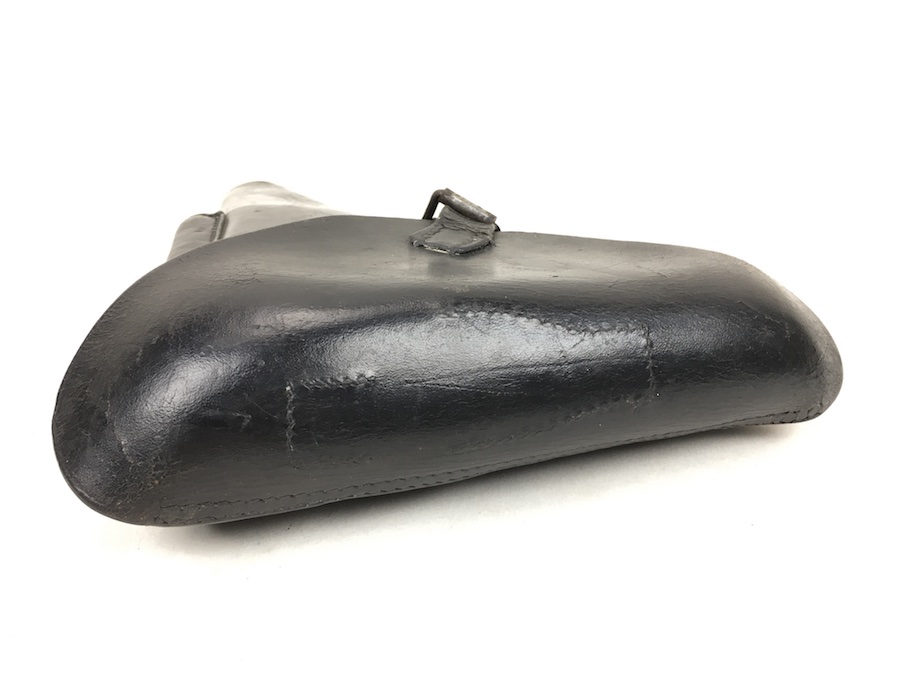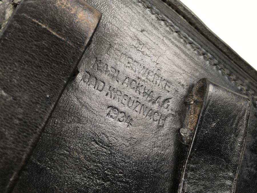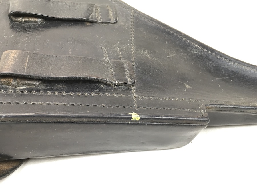 7/5/19 – Excellent and original 1934 k date Luger holster from WW2. The black leather is firm and in excellent condition. Some wear cracking on the closure strap but it is secure. Maker stamped “Lederwerke Karl Ackva” with a 1934 date between the belt loops. All stitching is intact and tight. Clean interior and secure lift strap. Although the lift strap has some cracking, it is still pliable and secure. Small yellow dot on the rear of the mag pouch. (1/8″)