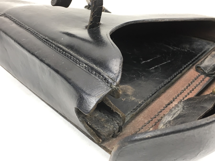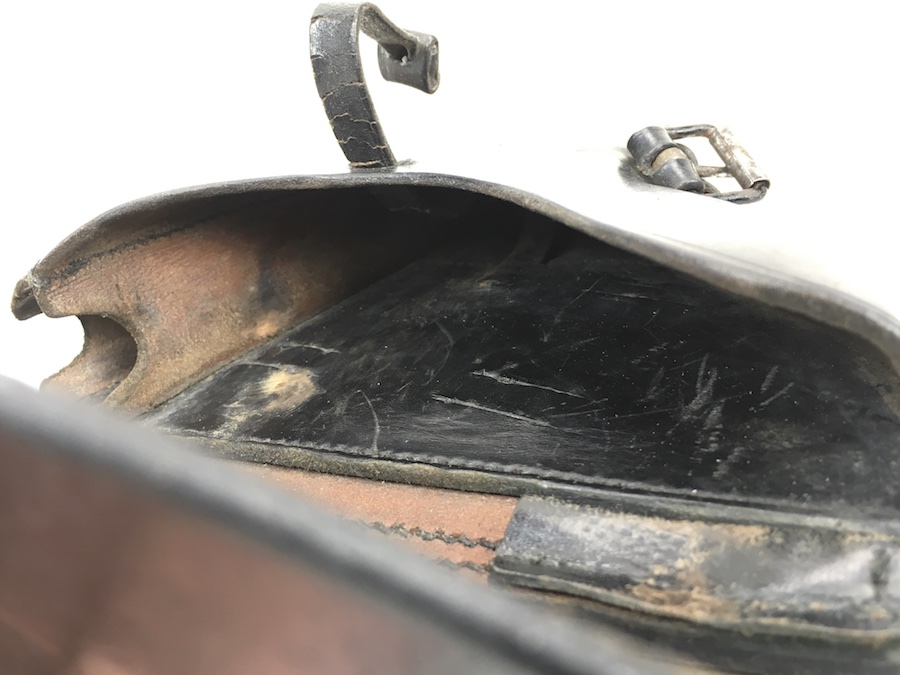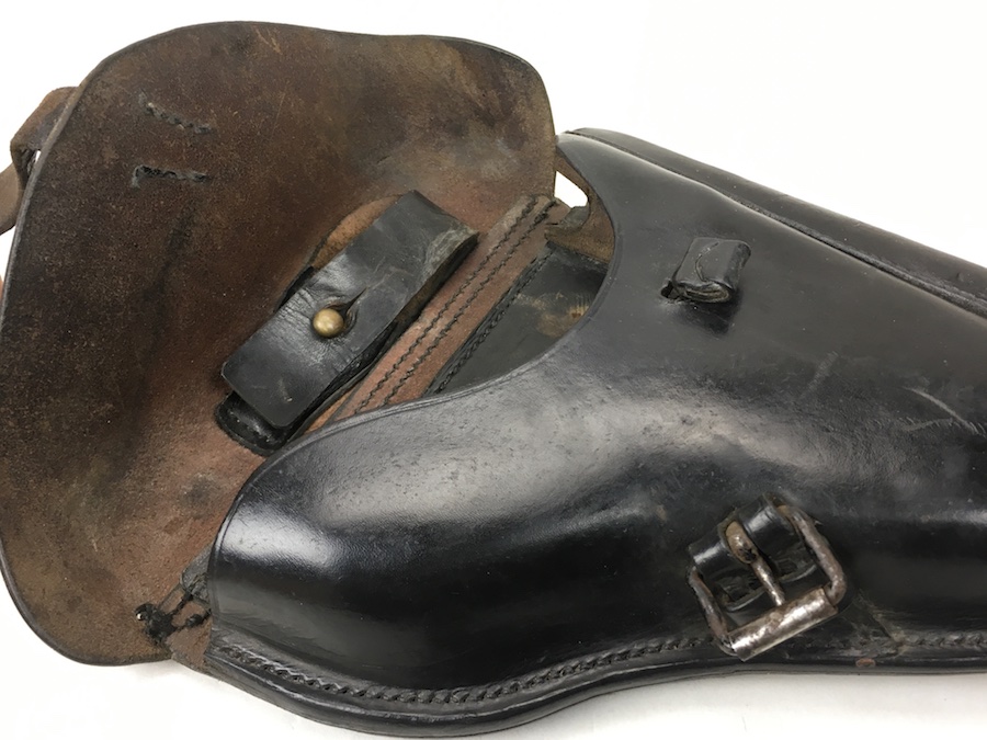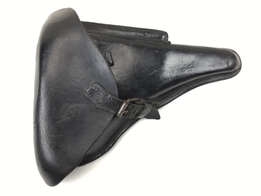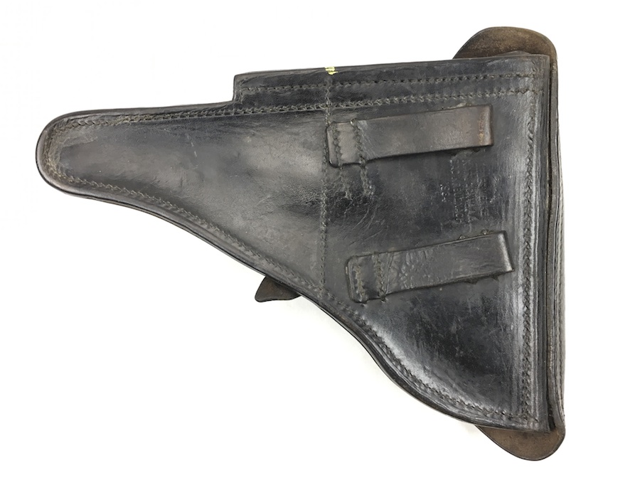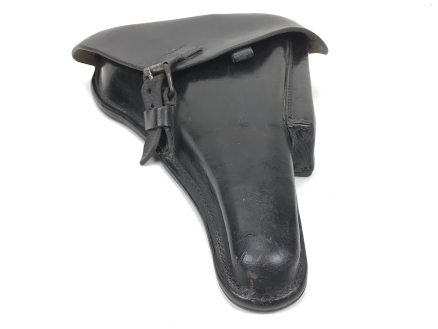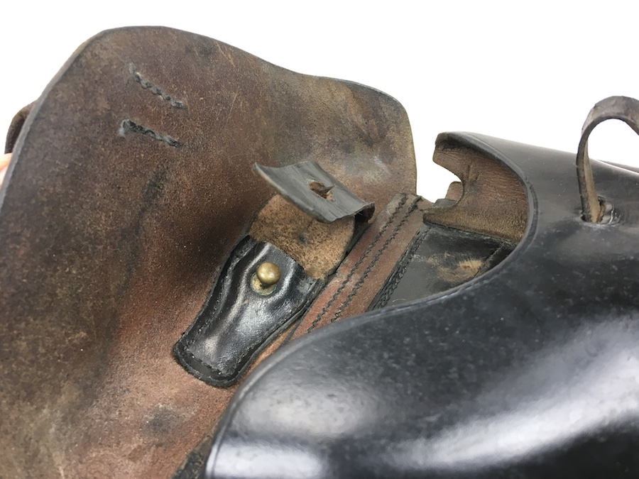7/5/19 – Excellent and original 1934 k date Luger holster from WW2. The black leather is firm and in excellent condition. Some wear cracking on the closure strap but it is secure. Maker stamped “Lederwerke Karl Ackva” with a 1934 date between the belt loops. All stitching is intact and tight. Clean interior and secure lift strap. Although the lift strap has some cracking, it is still pliable and secure. Small yellow dot on the rear of the mag pouch. (1/8″)