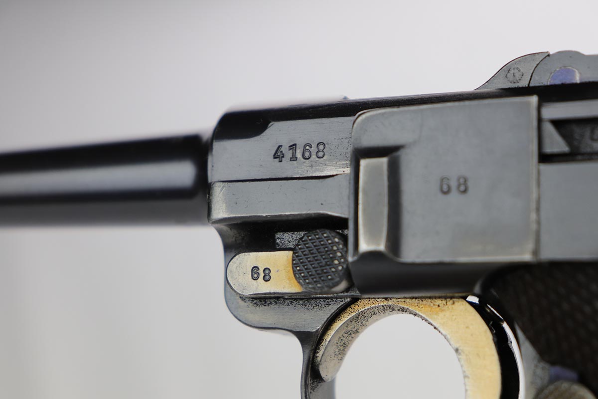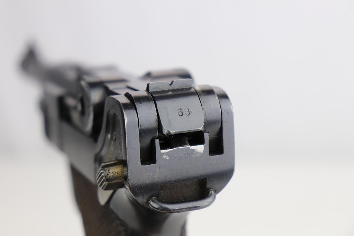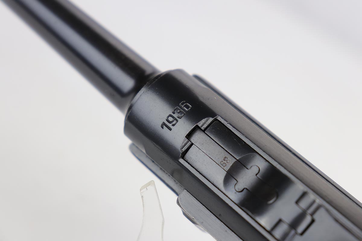 10/25/19 – This is an excellent example of an original and honest Mauser Luger that was made in 1936 for the German Army. Bluing rates at about 95% with standard high edge thinning, and some signs of patination on the barrel and straps. The small parts retain 60-70% of the original straw. Grips are in excellent shape and appear original to the gun, though they are unmarked. Period correct but mismatched magazine. Bore is strong and shiny.