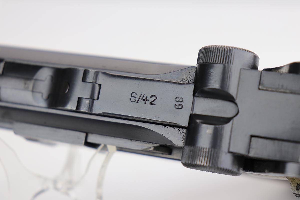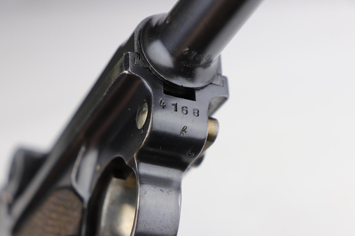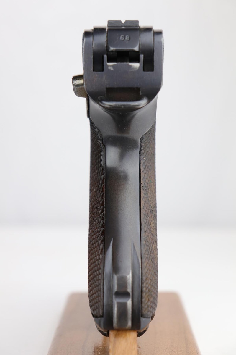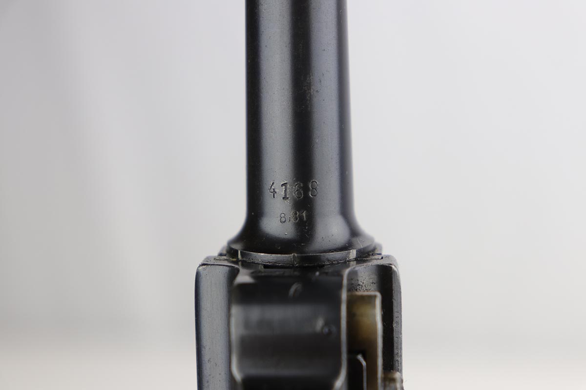 10/25/19 – This is an excellent example of an original and honest Mauser Luger that was made in 1936 for the German Army. Bluing rates at about 95% with standard high edge thinning, and some signs of patination on the barrel and straps. The small parts retain 60-70% of the original straw. Grips are in excellent shape and appear original to the gun, though they are unmarked. Period correct but mismatched magazine. Bore is strong and shiny.