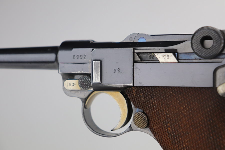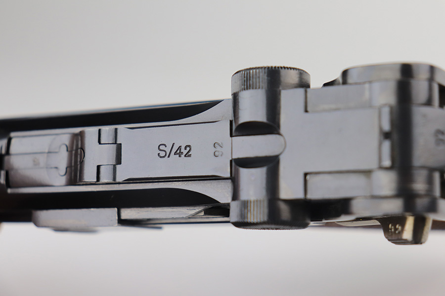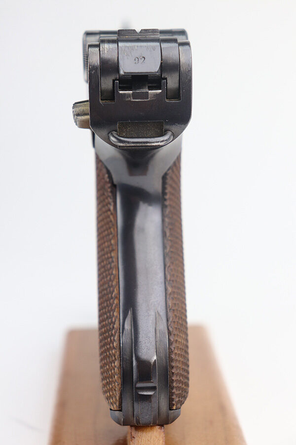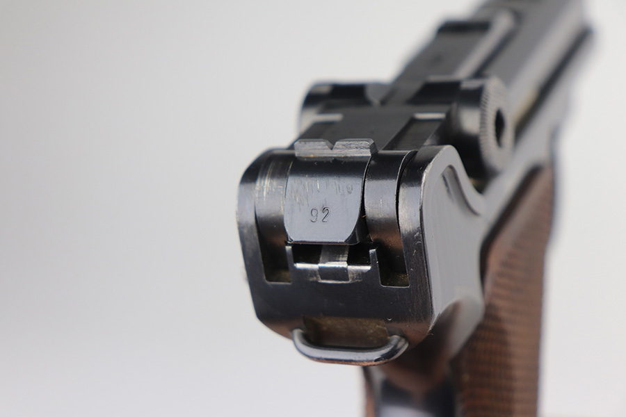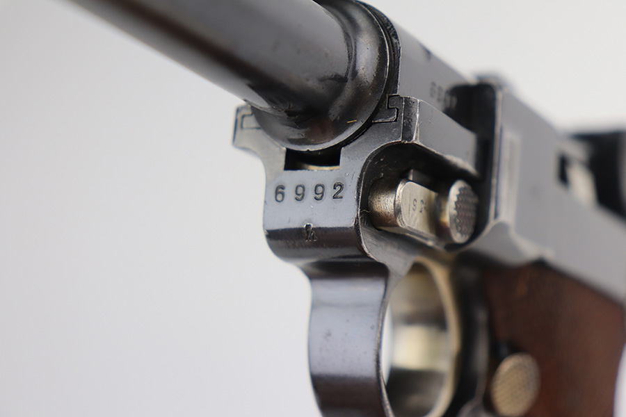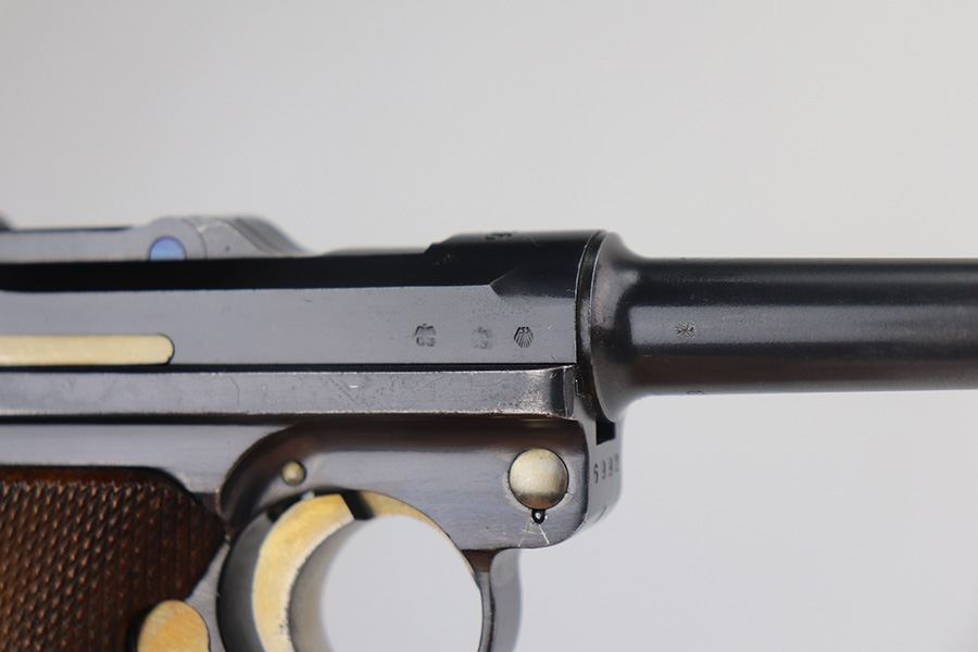 6/17/21 – This is an excellent example of a Mauser Luger issued to the Nazi military in 1936. The gun is all matching and has the proper “Eagle 63” military proofs. It has retained about 96-97% of its original bluing with areas of minor wear on the side plate, side rails, and around the muzzle. Comes with excellent un-numbered grips and a period-correct matching magazine that was re-numbered later to match. Excellent bore – shiny with strong rifling.