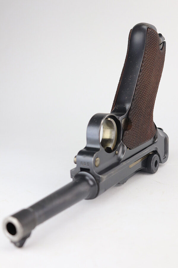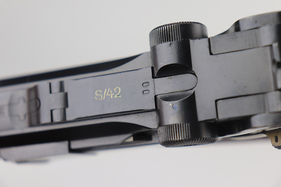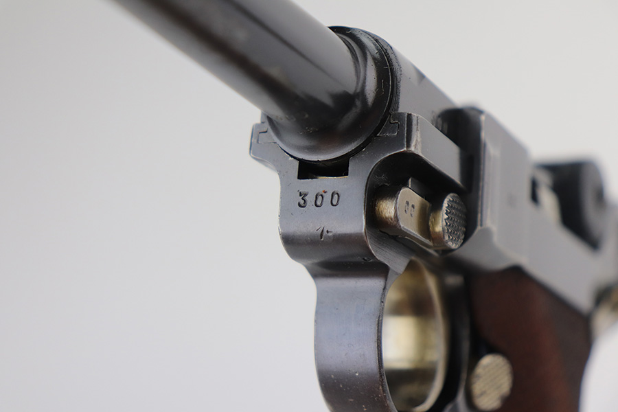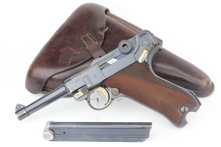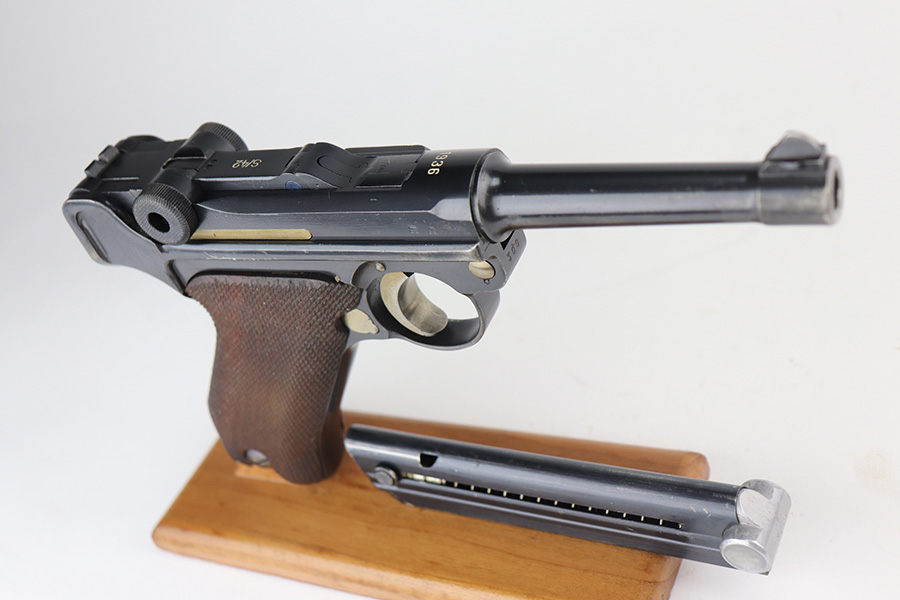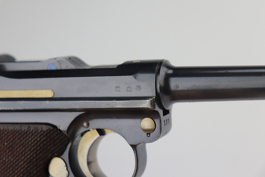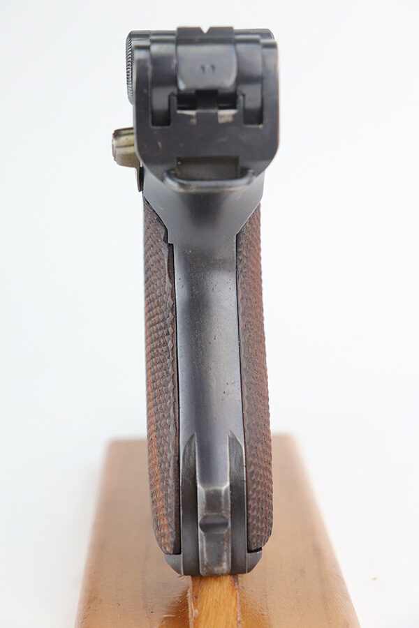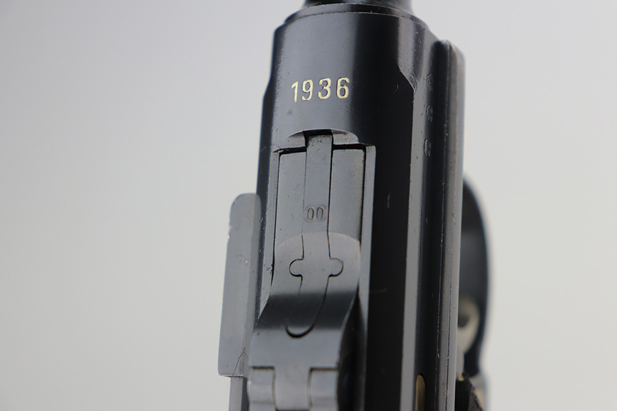 6/21/21 – This is an excellent example of a Mauser Luger issued to the Nazi military in 1936. The gun is matching and has the proper “Eagle 63” military proofs. The rig comes with an original matching magazine and an excellent 1936-dated holster. The gun has retained about 97% of its original finish. There is very minor wear on the side plate, side rails and around the muzzle. Some tiny handling marks on the right side rail and front strap. Some very tiny freckling on the straps. Excellent matching grips with a tiny chip at the bottom of the left grip. Excellent, shiny bore with a hint of freckling in the grooves. The leather piece with the holster is just to hold the shape of the belt loops.